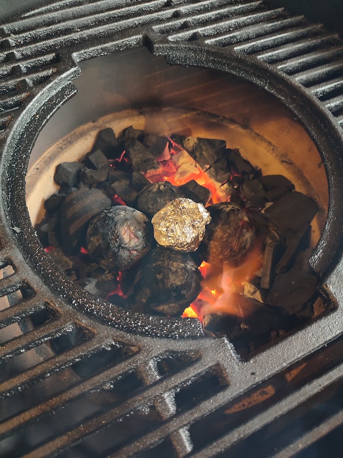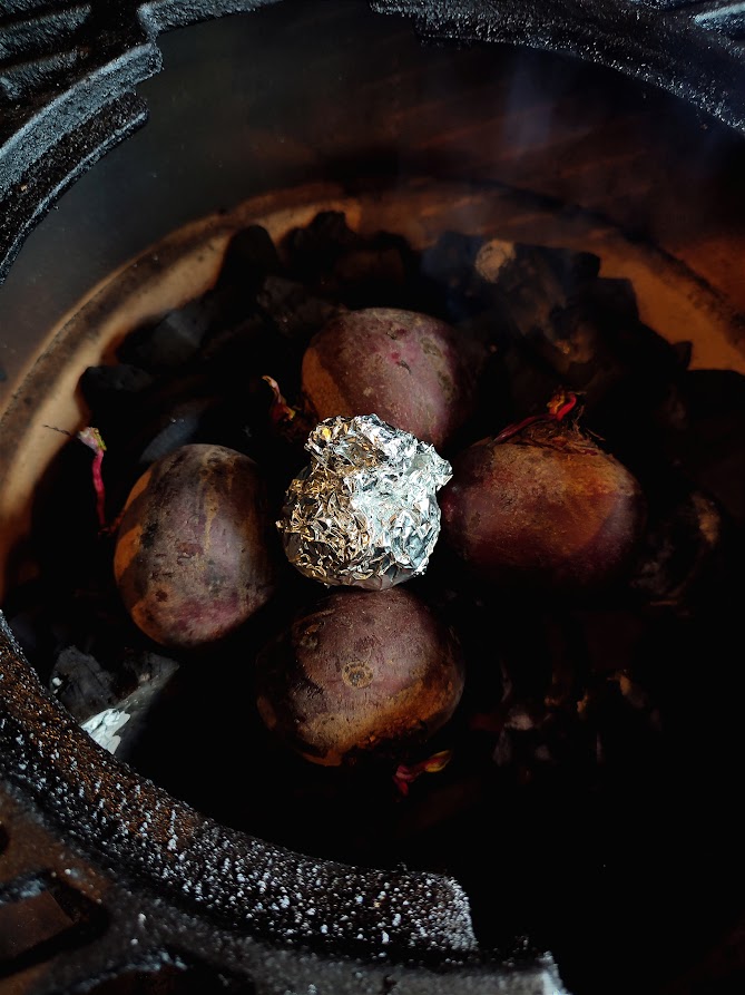 Begin met het aansteken van de bbq en breng je hem naar de 220 graden voor direct grillen. Je kunt ondertussen het op warmen van de kolen vast de hele rode bieten in de kolen leggen. En ook alvast de bovenkant van de bol knoflook afsnijden en met een beetje olie, rub, peper en zout in aluminiumfolie wikkelen. Dan kan deze ook bij de bieten in de kolen voor ongeveer 30 minuten tot 1 uur ligt aan de grote van de bieten en haal ze uit de kolen.