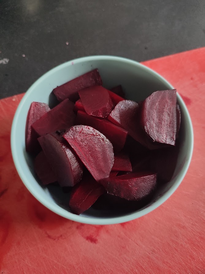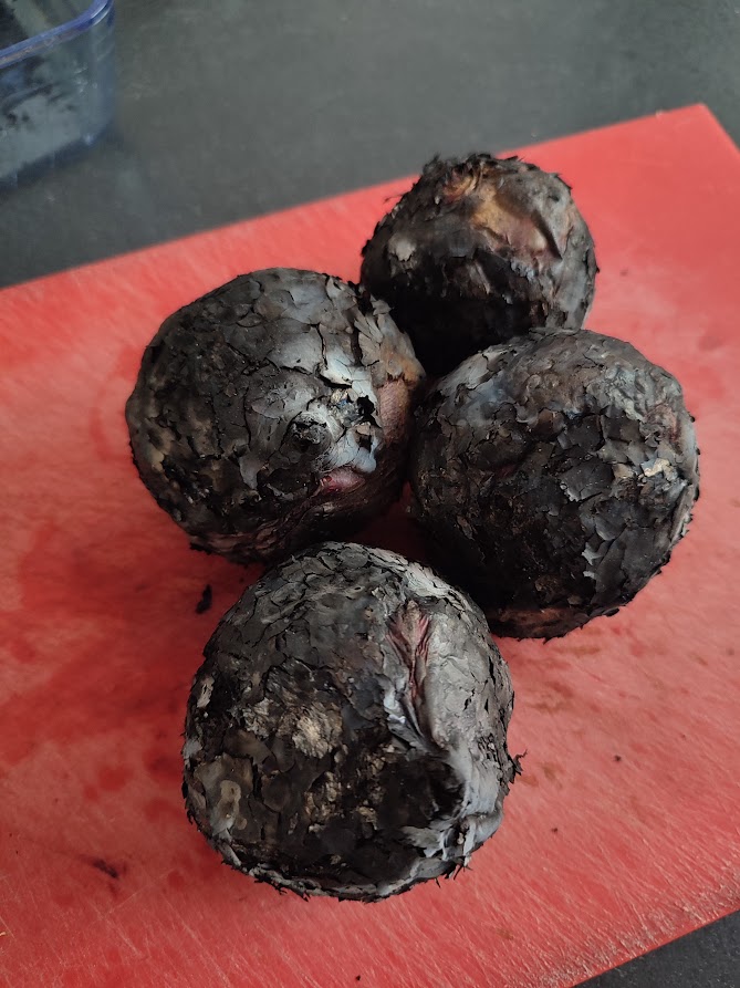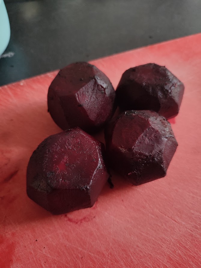 Als de bieten er 30 minuten tot 1 uur tussen de kolen hebben gelegen en ze zacht zijn als je er een prikker erin prik haal ze dan uit de kolen. Snij nu de verkoolde buitenkant eraf zodat je overblijft met een mooi gegaarde rode biet. Snij de rode bieten ieder in 8 parten.