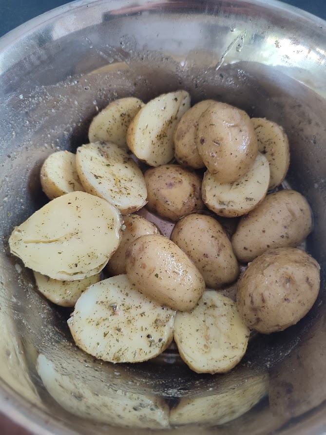 Kook de kleine aardappeltjes tot ze net gaar zijn ongeveer 20 minuten spoel ze daarna koud en laat volledig afkoelen. Snij de aardappelen door de midden en meng ze met de olie, rub en peper en zout. Grill de aardappeltjes nu direct boven de kolen tot ze mooi gekleurd zijn en warm.