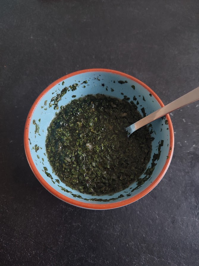 Haal de blaadjes van de takjes munt en hak deze fijn. Haal de knoflook bol van de bbq als deze helemaal zacht is en knijp de knoflookpulp uit de bol knoflook. Met nu alle ingrediënten voor de saus door elkaar en breng op smaak met peper en zout.
