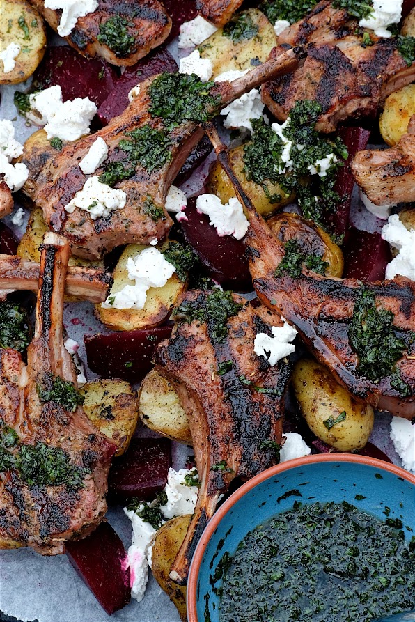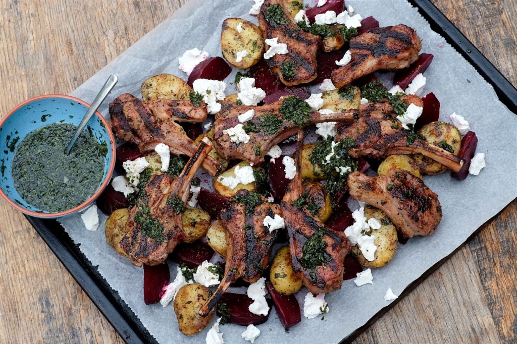 Verdeel nu de bieten en aardappelen over een groot bord, schaal of snijplank. Leg de gegrilde lamskoteletten nu op de bieten en aardappelen. Verkruimel hier overheen de geitenkaas en sprenkel er een gedeelte van de saus overheen. Serveer met de rest van de saus erlangs.