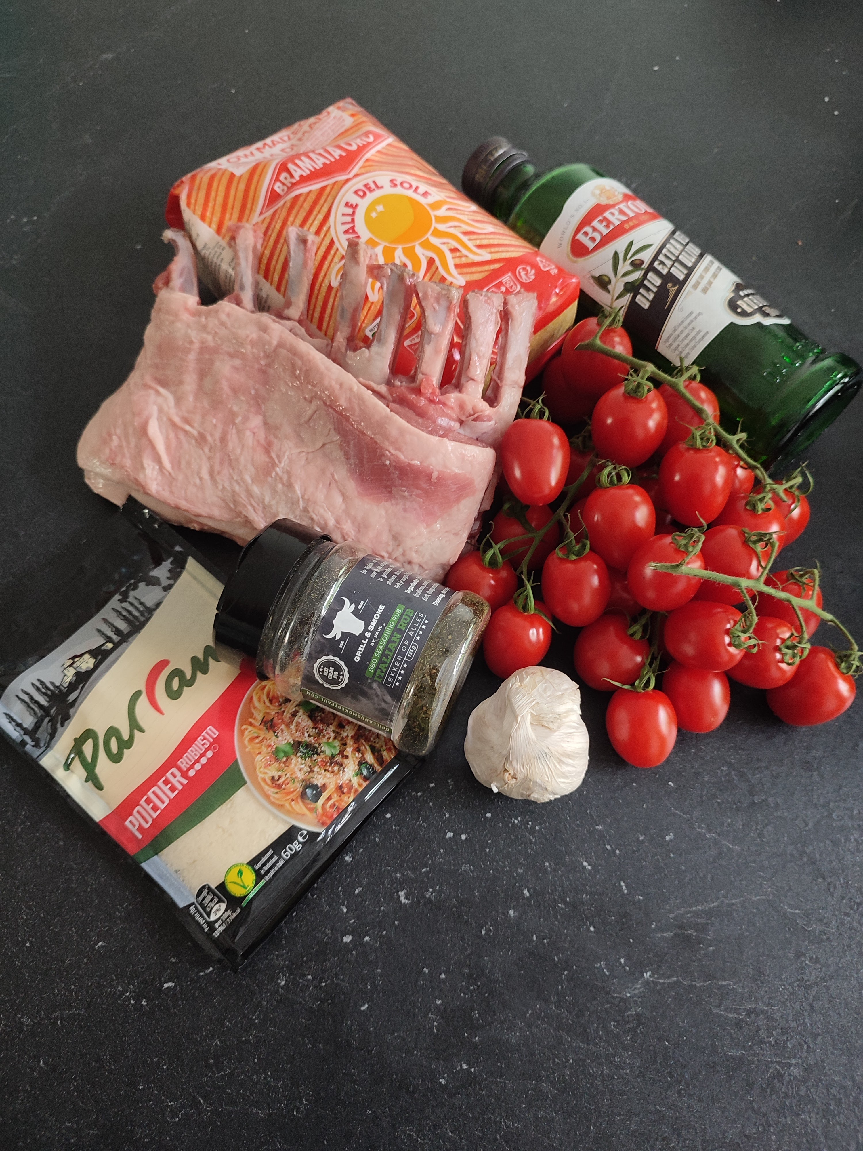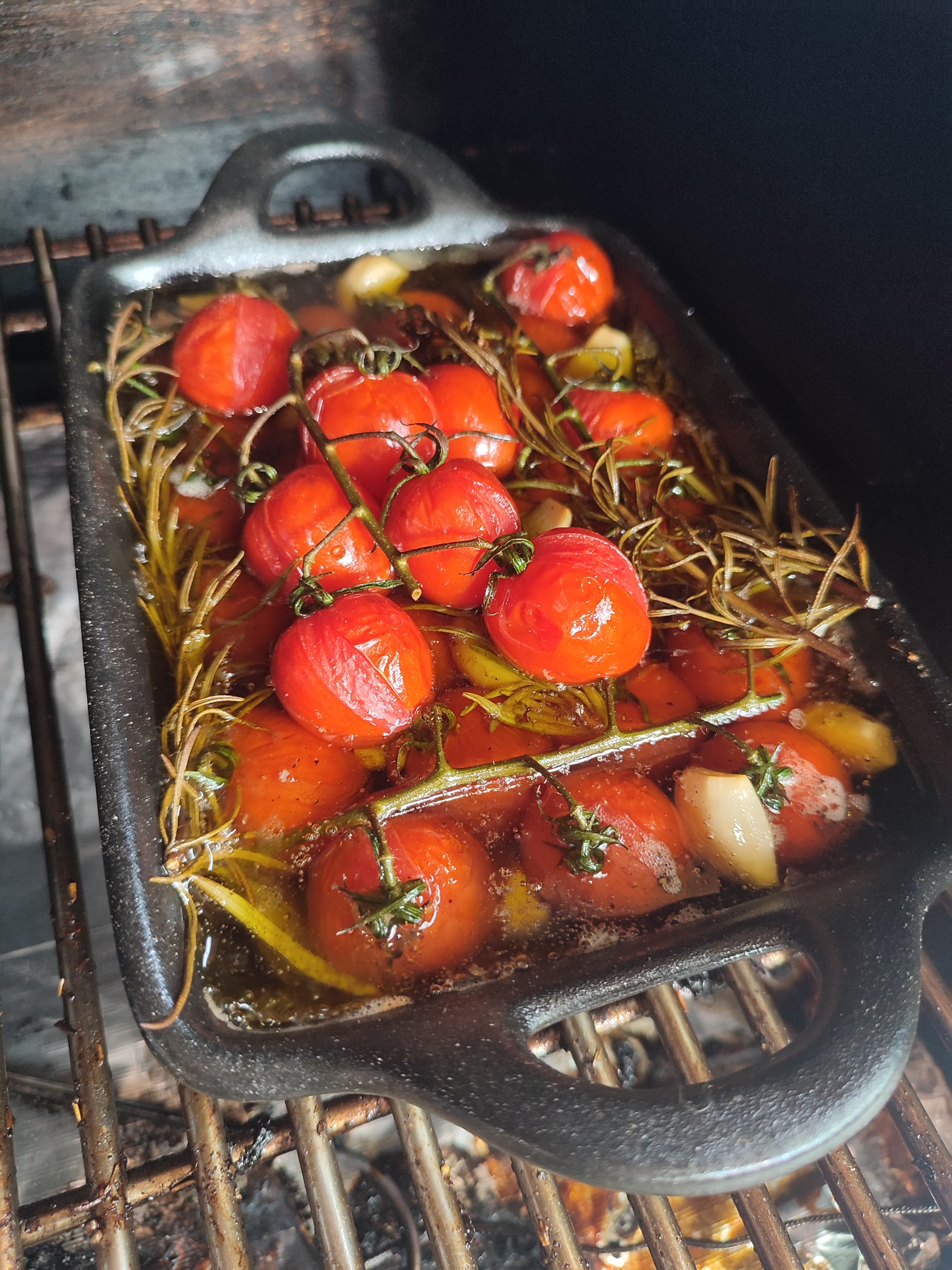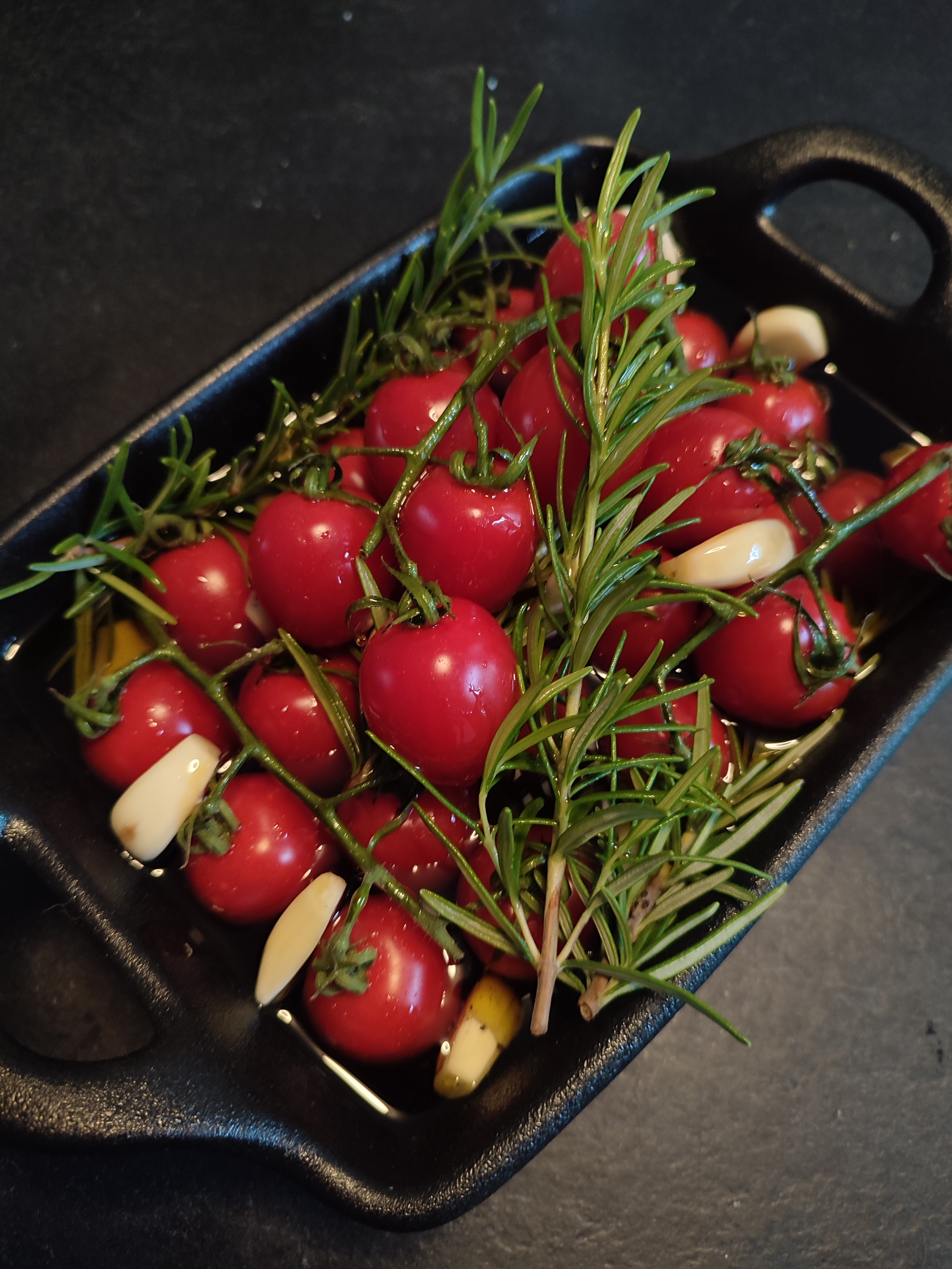 Maak de knoflook teentjes schoon en laat ze heel. Doe nu de trostomaatjes, knoflook, rozemarijn, peper en zout naar smaak en de olijfolie in een schaaltje je wilt dat de tomaatjes een beetje onderstaan in de olie. Zet het schaaltje er tegelijk in de met de lamsrack. Als de lamsrack klaar is haal je deze van de bbq en warm je de bbq op voor het aanbakken van de lamsrack maar laat je tomaatjes er gewoon in staan. Houdt het schaaltje in de gaten zodra de tomaatjes open beginnen te barsten en de knoflook zacht is zijn ze klaar. Dit heeft ongeveer 1 ½ tot 1 ¾ uur nodig in totaal.