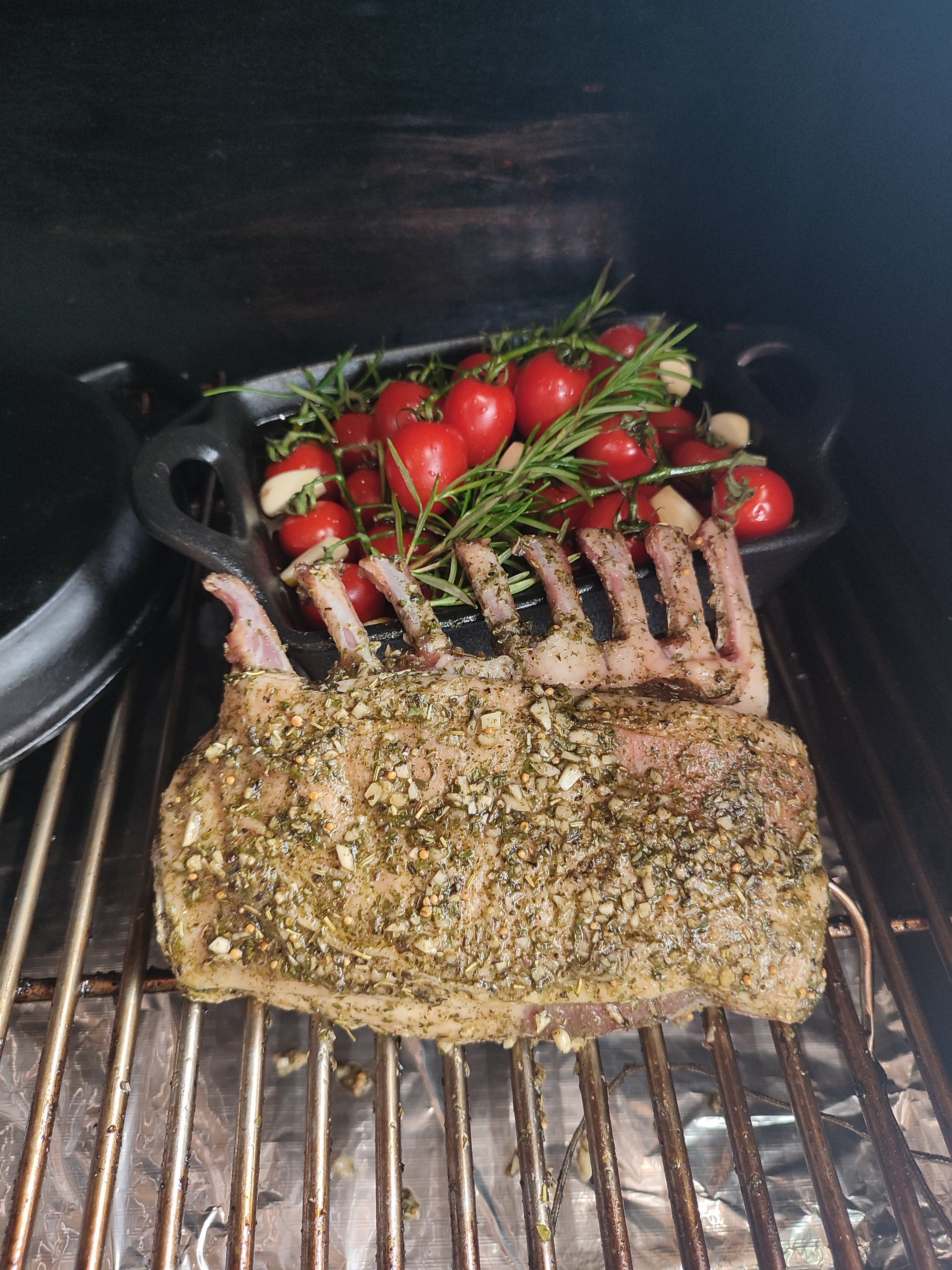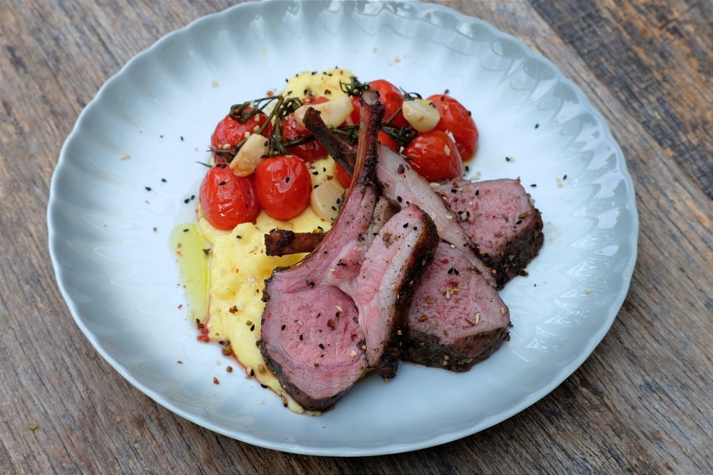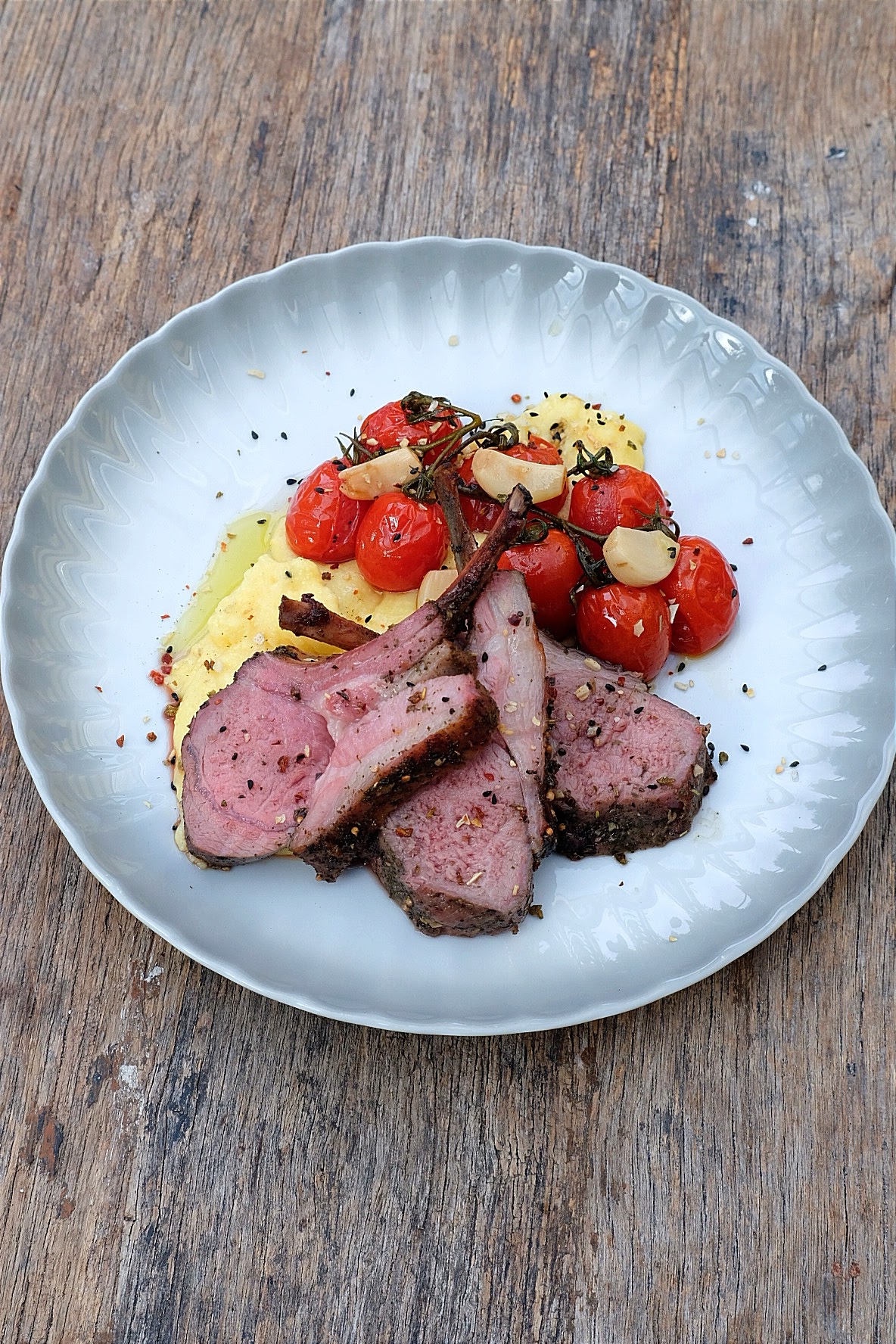 Mooi langzaam gerookte lamsrack met een reverse sear voor mooie garing. Romige kazige polenta en gekonfijte tomaatjes met knoflook wat wil je nog meer.