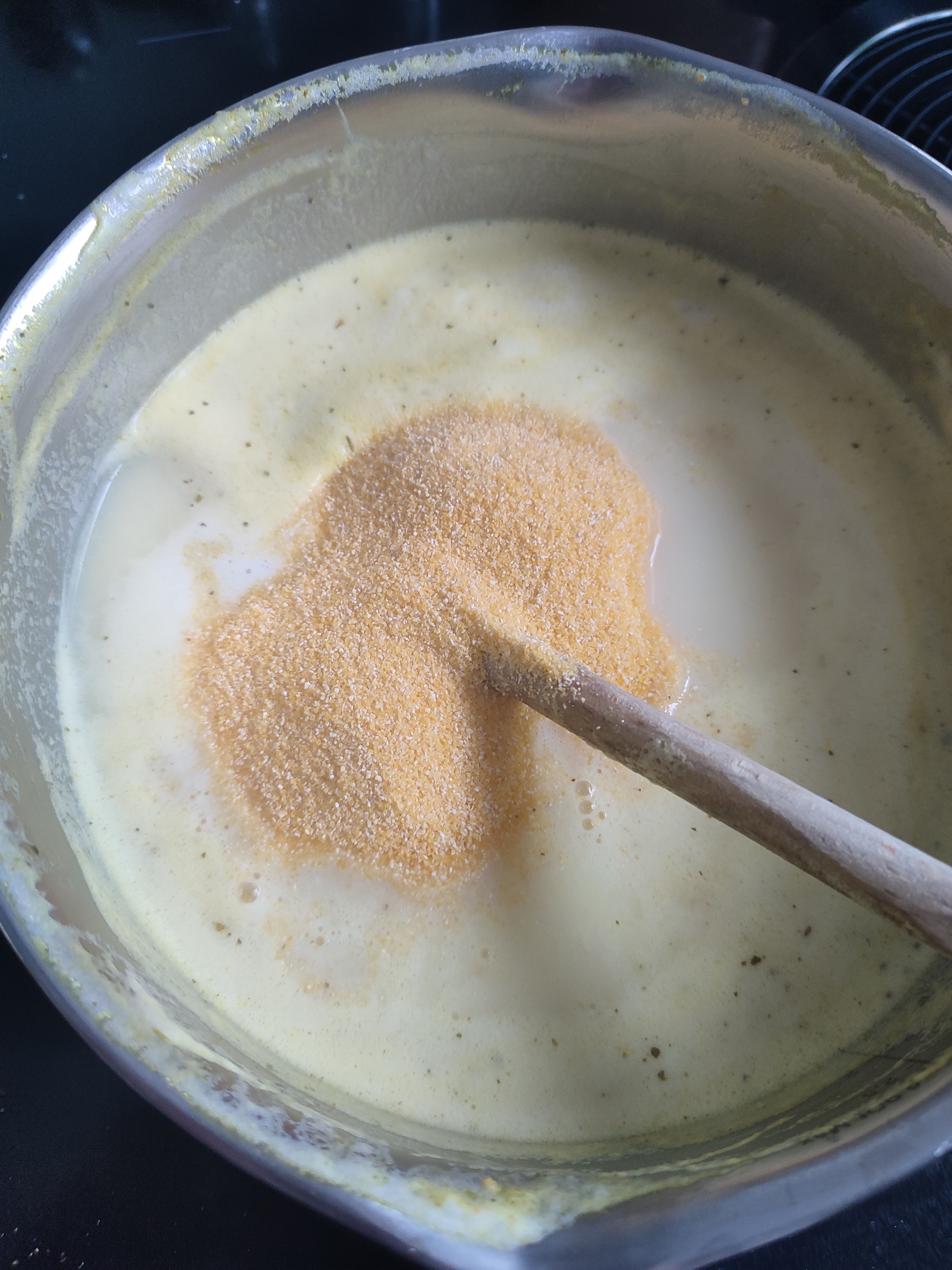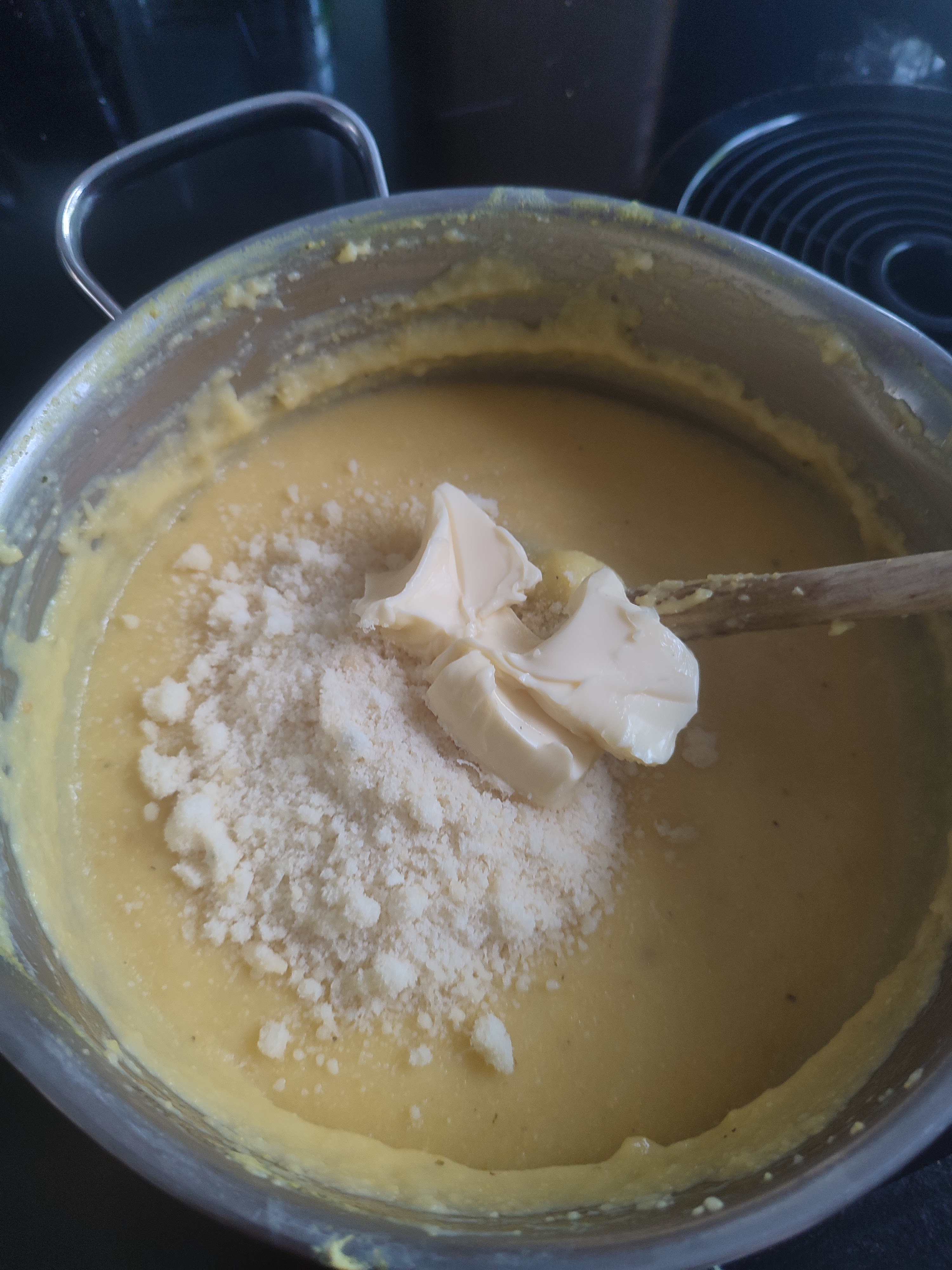 Breng in een pan het water, melk en bouillon blokjes aan de kook. Als deze kookt voeg dan de polenta toe en zet op laag vuur zodat deze zachtjes kookt. Laat de polenta nu ongeveer 25 tot 35 minuten koken onder af en toe roeren. De polenta is klaar als deze een stuk dikker is geworden en aan de randen los begint te komen van de pan. Haal de polenta dan van het vuur en roer er nu de boter en Parmezaanse kaas door serveer de polenta warm.