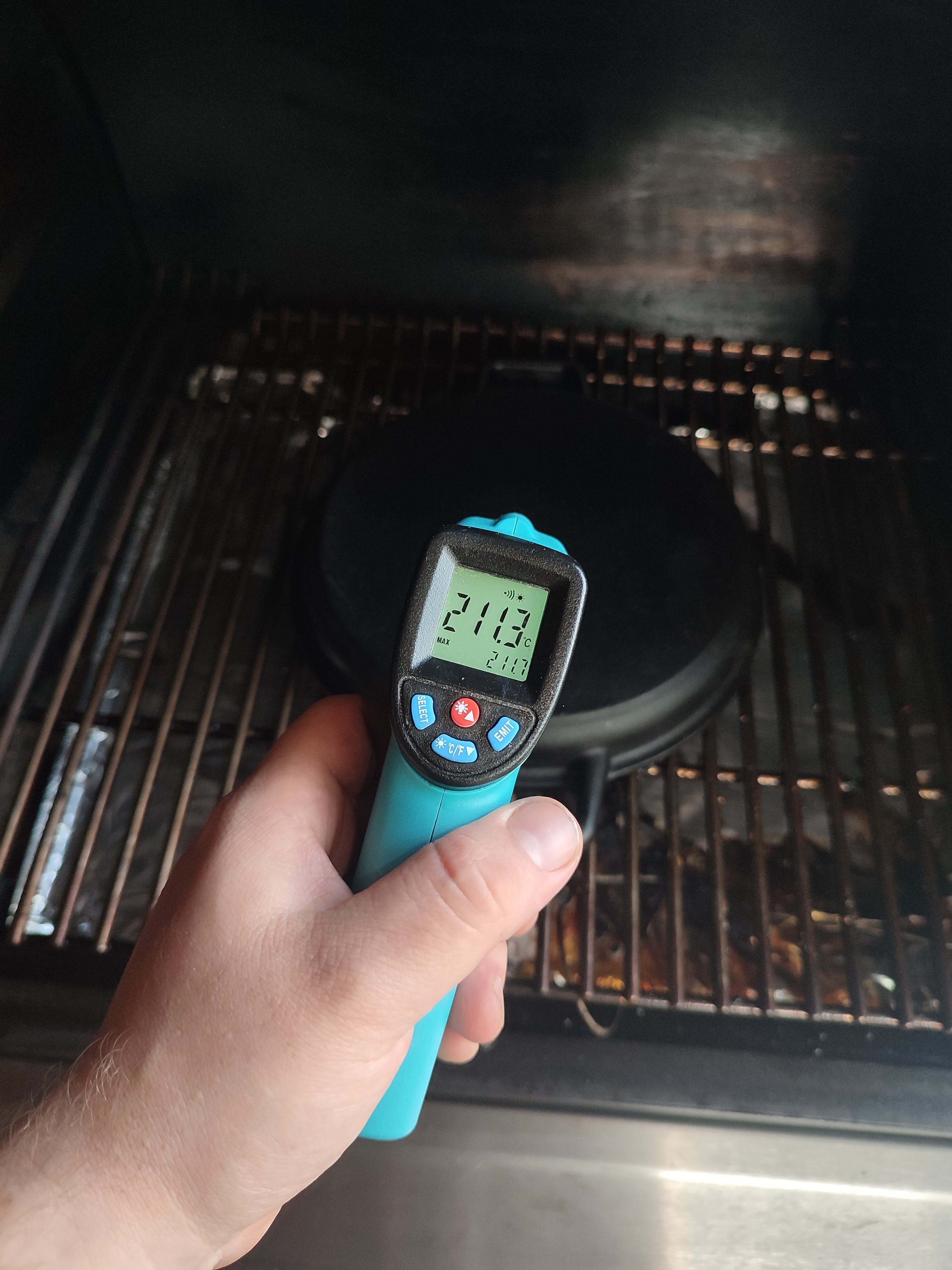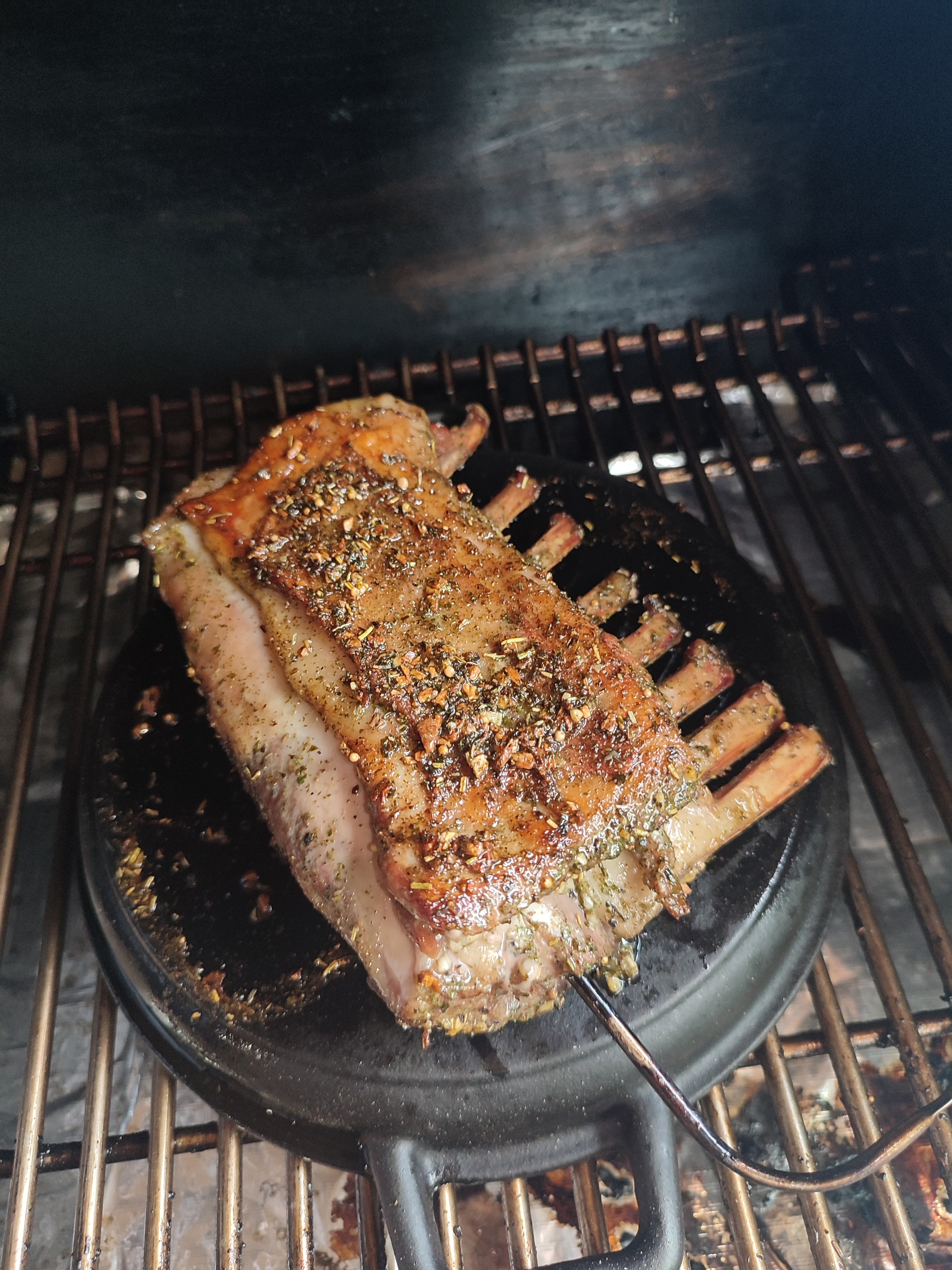 Als de bbq op temperatuur is doe dan het rook hout op de kolen en leg de lamsrack op de bbq. Rook deze nu zachtjes tot een kerntemperatuur van 48 graden ongeveer 45 minuten tot 1 uur. Zodra die dat heeft gehaald haal je hem van de bbq en dek je hem af met wat aluminiumfolie. Breng nu de bbq met de omgekeerde skillet naar de 220 graden. Als de bbq de juiste temperatuur heeft bak dan op de omgekeerde skillet de vet kant mooi aan. Je wilt uit eindelijk een kern van ongeveer 55 graden hebben. Als dat zo ver is haal de lamsrack van de bbq en laat nog even rusten.