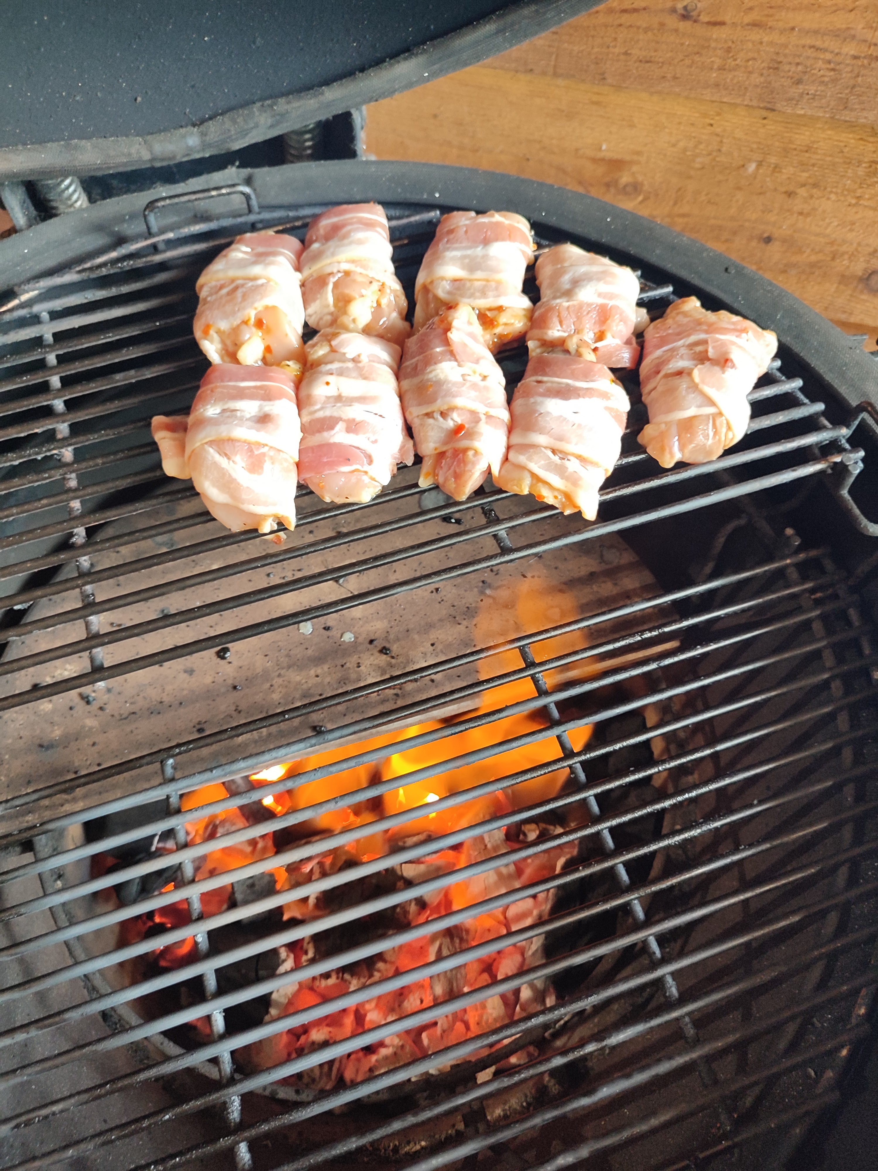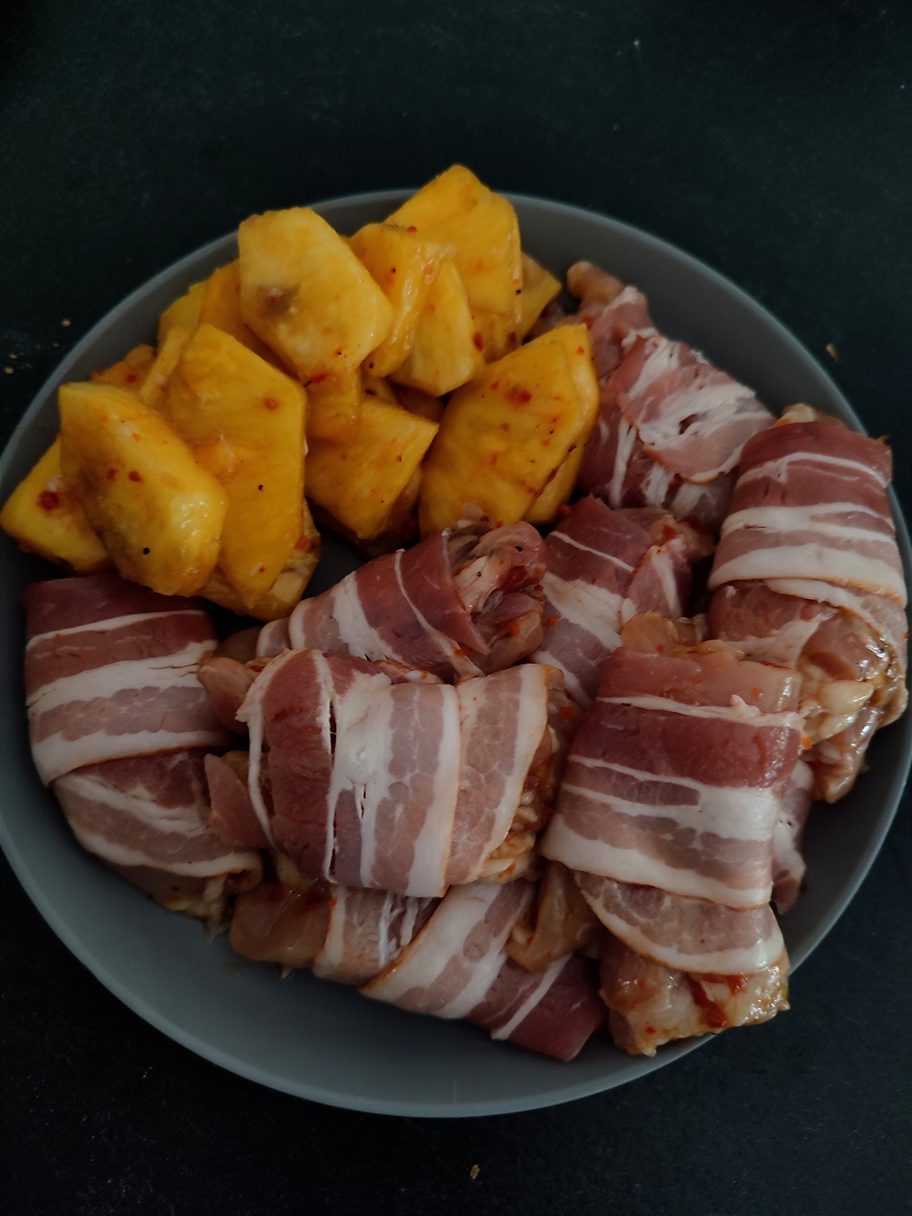 Snij de kippendijen door de midden en maak de ananas schoon en snij de helft in plakken. Maak nu de marinade door de rest van de ingrediënten door elkaar te mengen behalve het ontbijtspek en marineer hier de kippendijen en ananas in. Laat dit maximaal 4 uur marineren . Na de het marineren omwikkel dan elke stuk kippendij met een plak ontbijtspek en leg deze nu op de indirecte kant van de bbq bewaar de overgebleven marinade. Gaar de dijen nu tot een kern van 75 graden en besmeer af en toe met de overgebleven marinade. Grill ondertussen de ananas plakken op de directe zijde van de bbq.