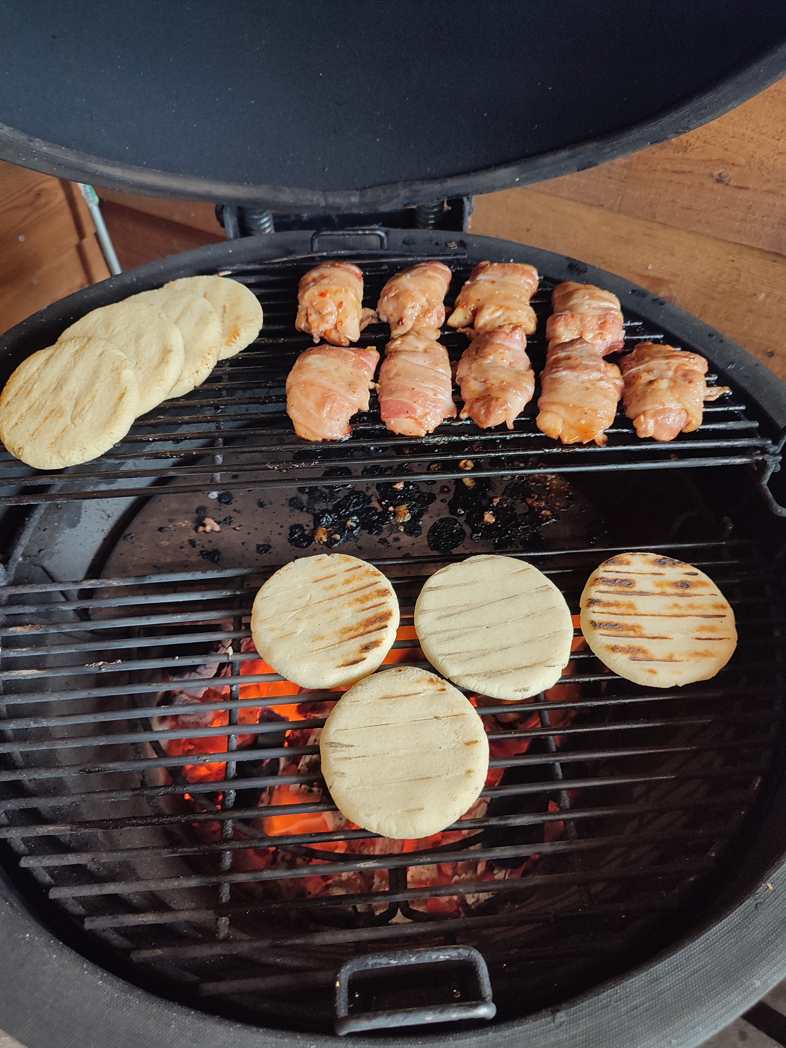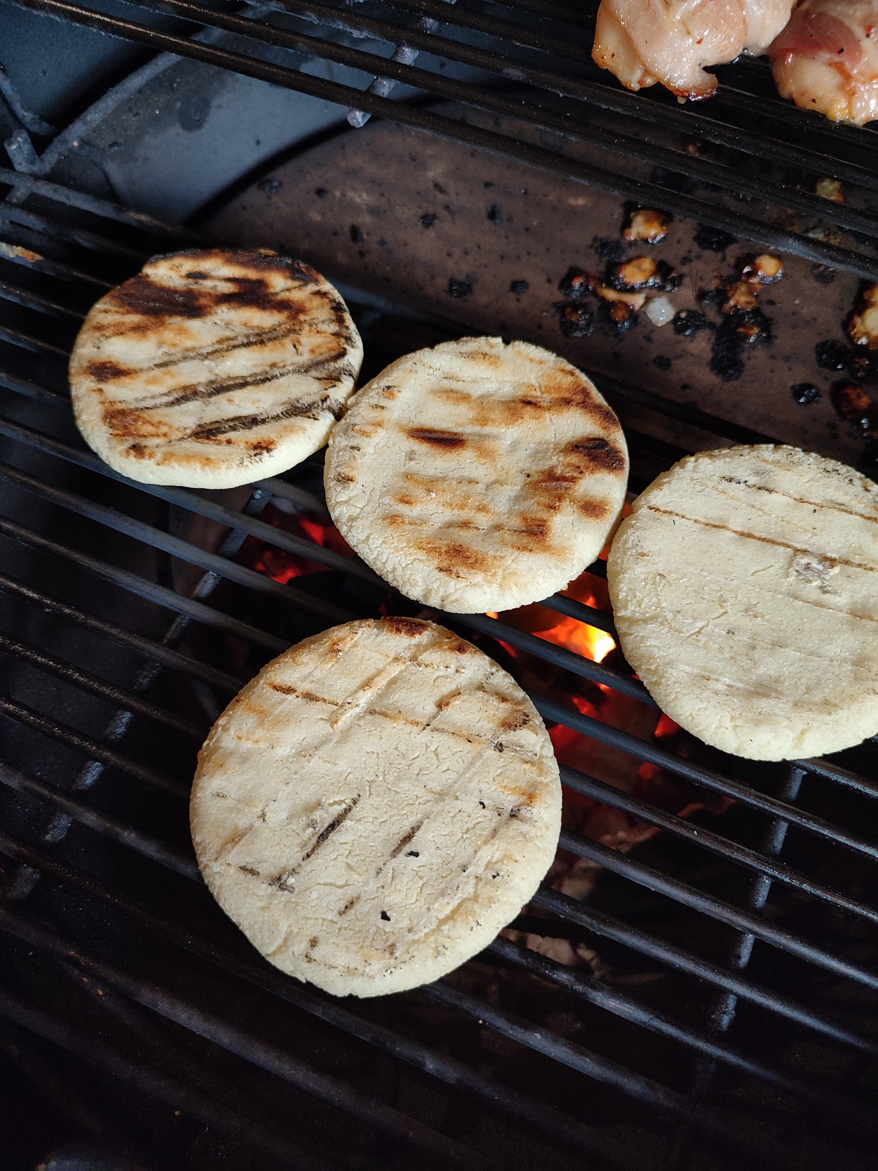 Meng de maismeel, water en olie door elkaar en kneed dit voor ongeveer 3 minuten door met de hand tot een mooi samenhangend deeg. Laat de deegbol nu 10 minuten rusten. Verdeel het deeg nu 8 bollen en duw deze dan platte tot een dikke schijf ter dikte van hoe dik je je arepa wilt hebben. Grillen de arepa’s nu op de directe zijden tot beide kanten mooie grill strepen hebben ongeveer 4 minuten aan iedere kant ligt aan hou sterk je kolen gloeien. Als ze mooi gekleurd zijn leg ze dan op de indirecte zijden en gaar ze nog voor ongeveer 10 a 15 minuten.