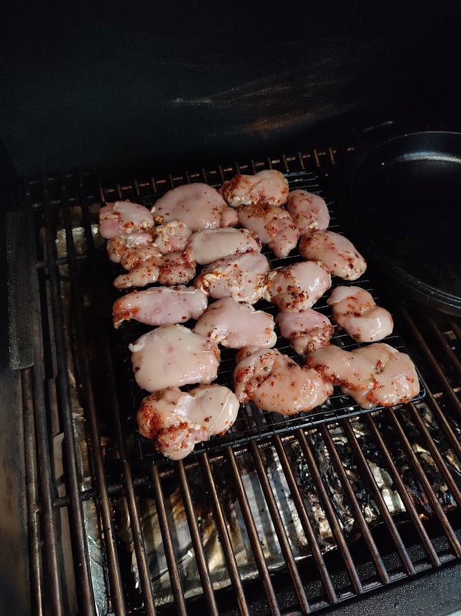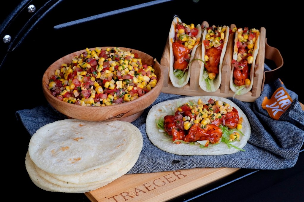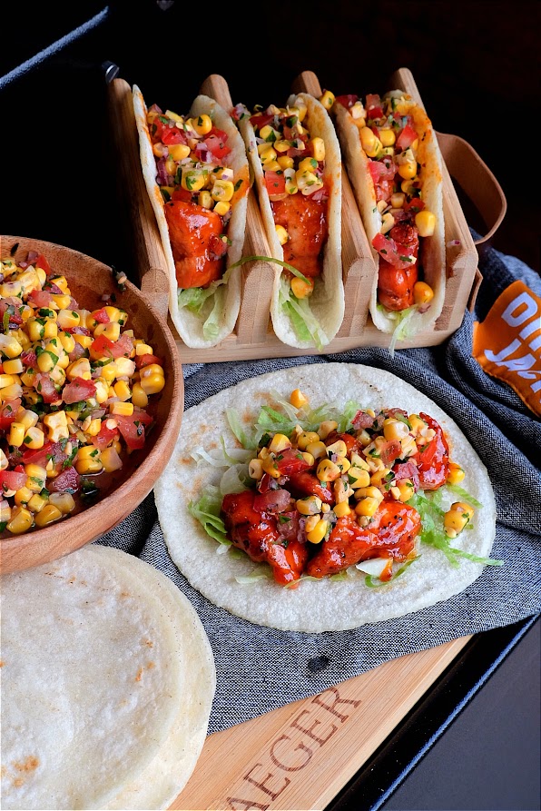 Net voor je de zwezerik op de bbq wil leggen haal ze uit de melk en dep ze droog. Meng nu de jalapeno bacon rub nu door de zwezerik. Leg het rookblokje op de kolen en rook de zwezerik nu voor ongeveer 45 minuten na die tijd moet de zwezerik lekker zacht aanvoelen en makkelijk uit elkaar te trekken zijn. Als dat zover is haal ze van de bbq en breng de bbq naar 220 graden verwarm een skillet mee op. Snijd ondertussen de zwezerik in stukken dat het hapklare stukjes zijn. Als de skillet warm is doe de olie in de pan en bak de zwezerik kort nog even aan. Voeg nu de bbqsaus toe en breng aan de kook en laat het iets inkoken tot een mooie sticky glaze. Verwarm ondertussen de mais taco’s op volgens verpakking.