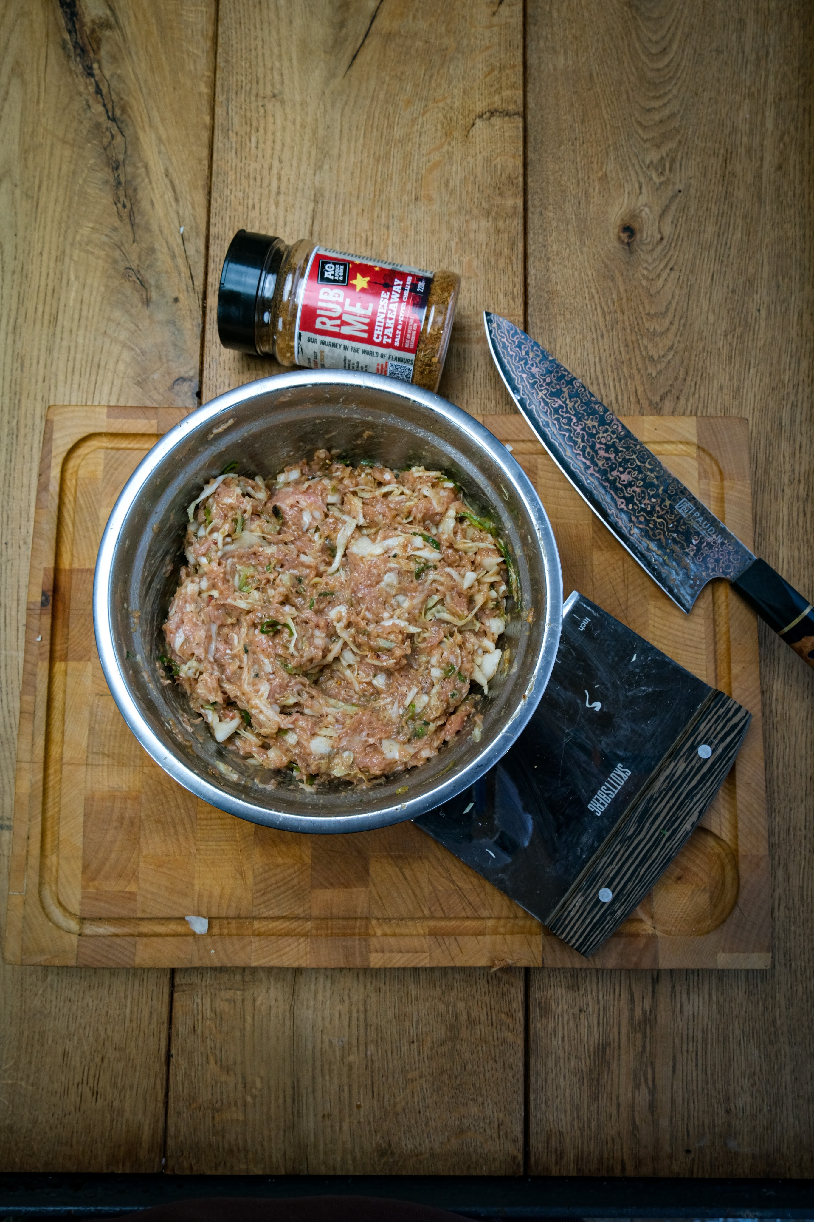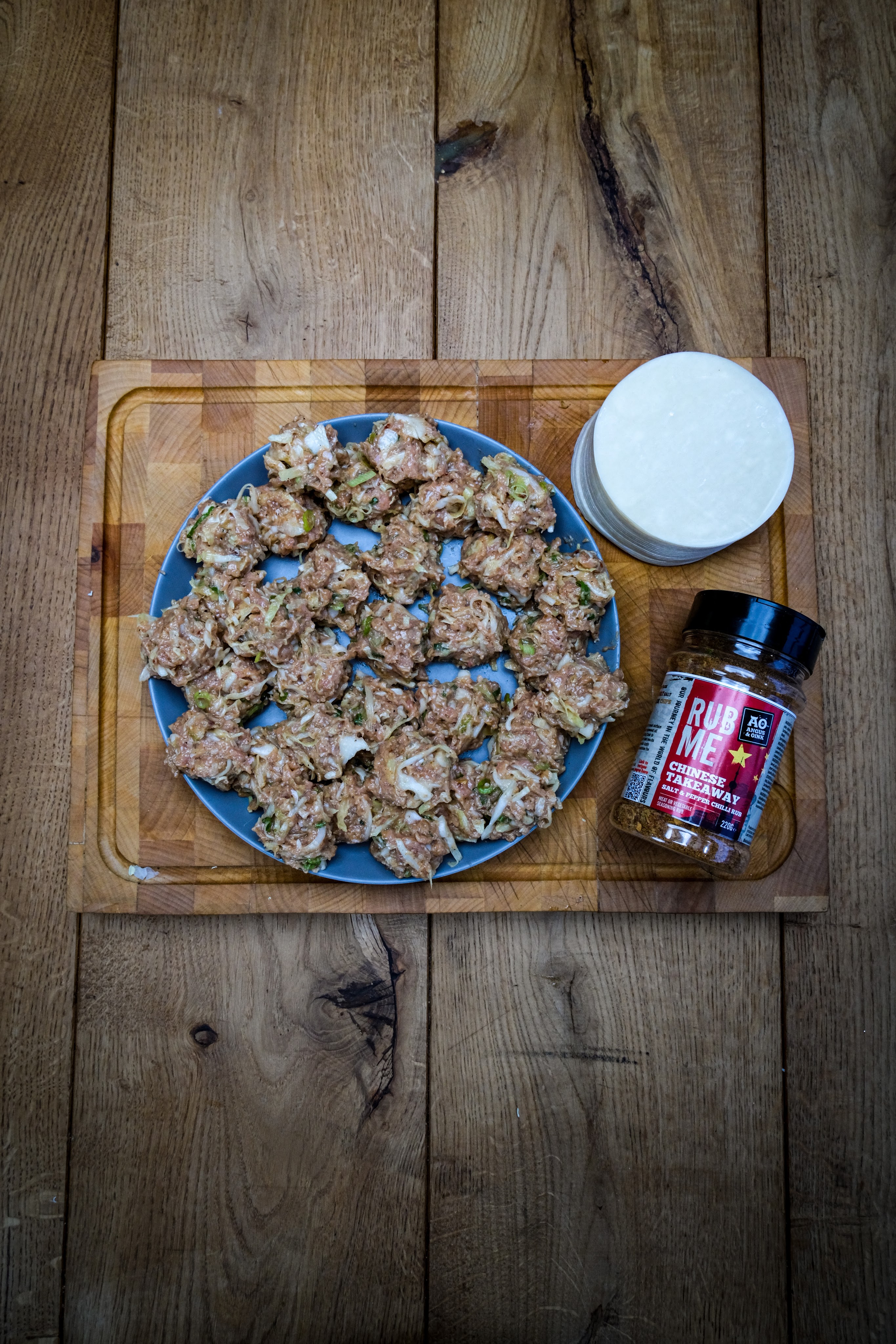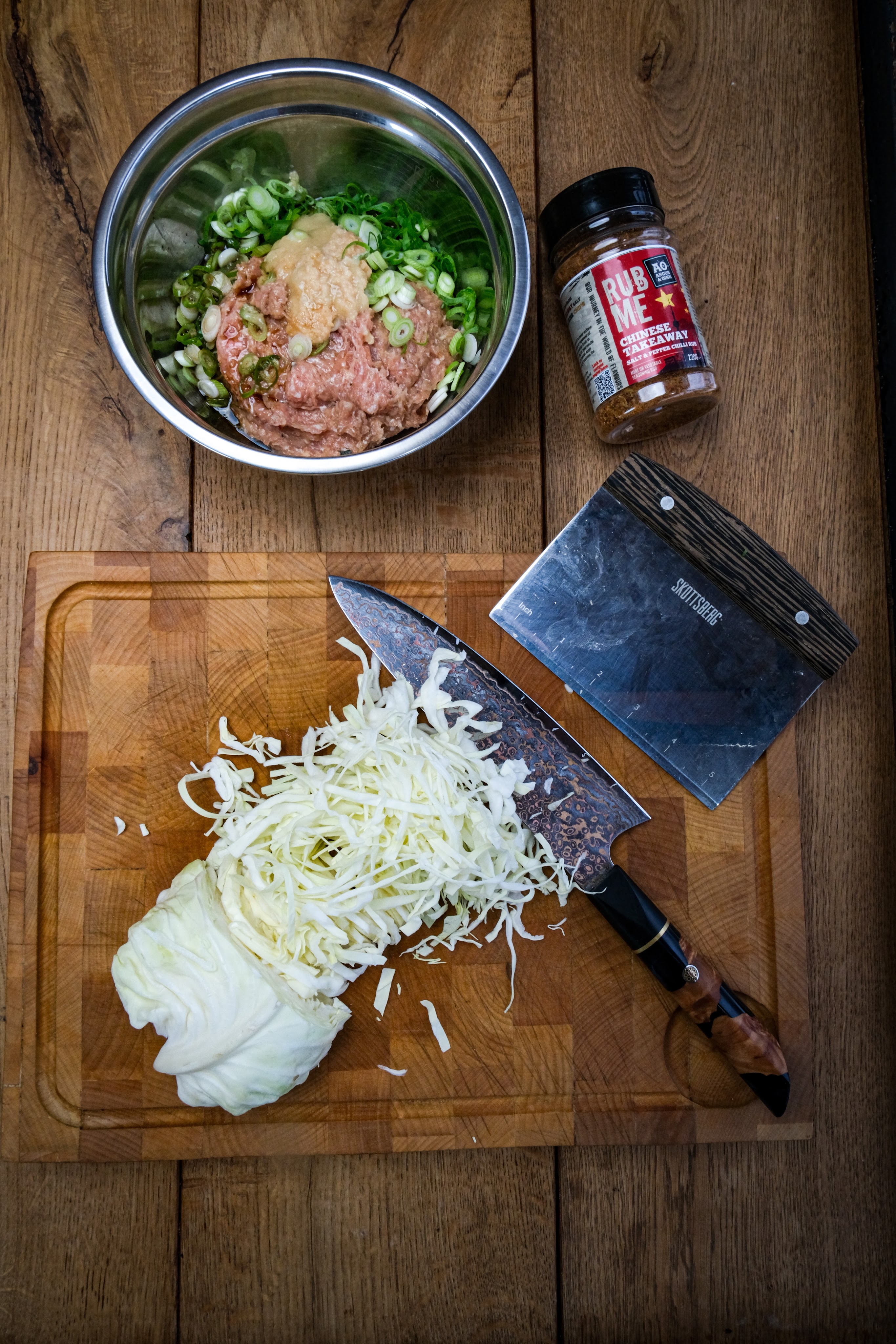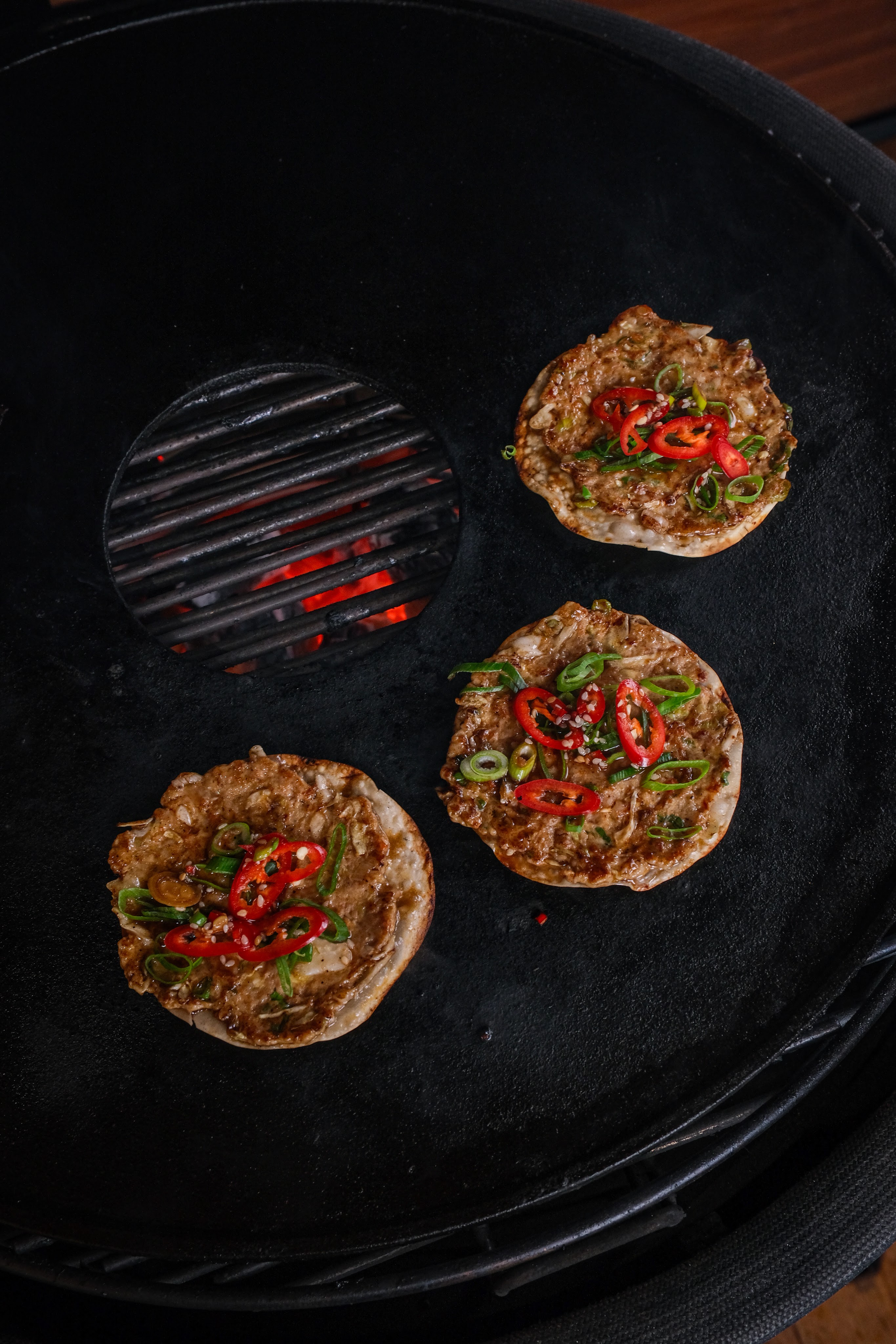 Snij als eerste de bosui in dunne ringen. Meng nu alle ingrediënten behalve de gyoza vellen goed door elkaar. Verdeel dit mengsel nu in 30 gelijke hoopjes. Vul nu een van de spuitflesjes met water en de andere met olie. Nu kun je de smashed gyoza gaan bakken op de bbq. Doe in klein laagje olie in de skillet of op de plancha. Leg een paar hoopjes van de mengsel erop met net genoeg ruimte dat je ze kunt smashen. Leg nu op elk hoopje een gyoza vel en smash deze nu met de spatel of smasher. Bak deze kort aan tot het gehakt gekleurd is dit heeft maar heel kort nodig. Draai de gyoza nu om en voeg een beetje olie toen en een flinke scheut water en dek de gyoza meteen af met de stoom dome of aluminium bakje zodat de stoom niet kan ontsnappen. Laat dit nu zo gaan tot het geluid van stomen omgaat naar bakken dit duurt ongeveer 1 minuut. Haal dan de dome eraf en kijk of ze al krokant genoeg zijn zo niet bak dan nog iets langer. Is de gyoza zo krokant als je wilt haal ze dan van de bbq. Herhaal dit tot alle gyoza zijn gebakken.