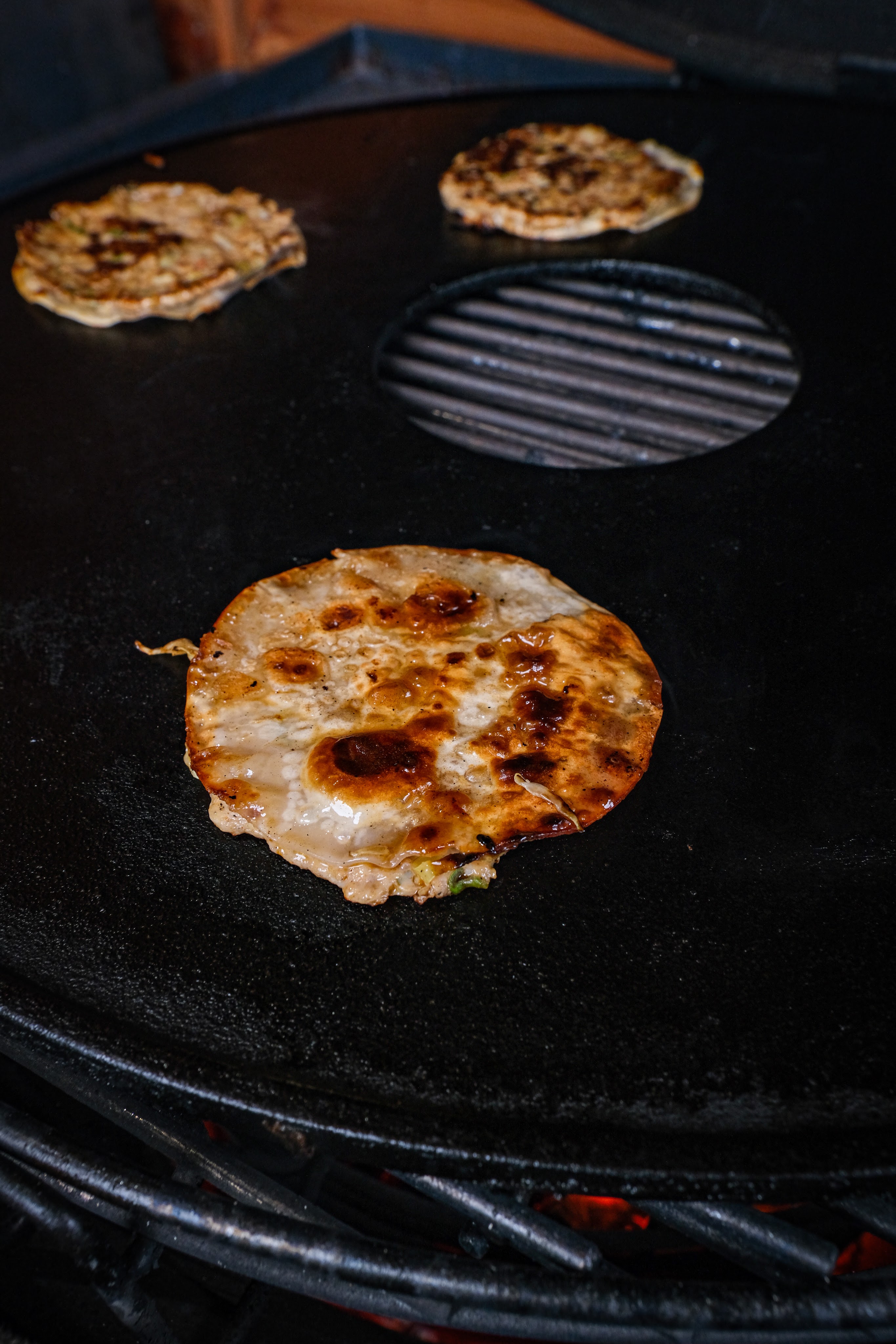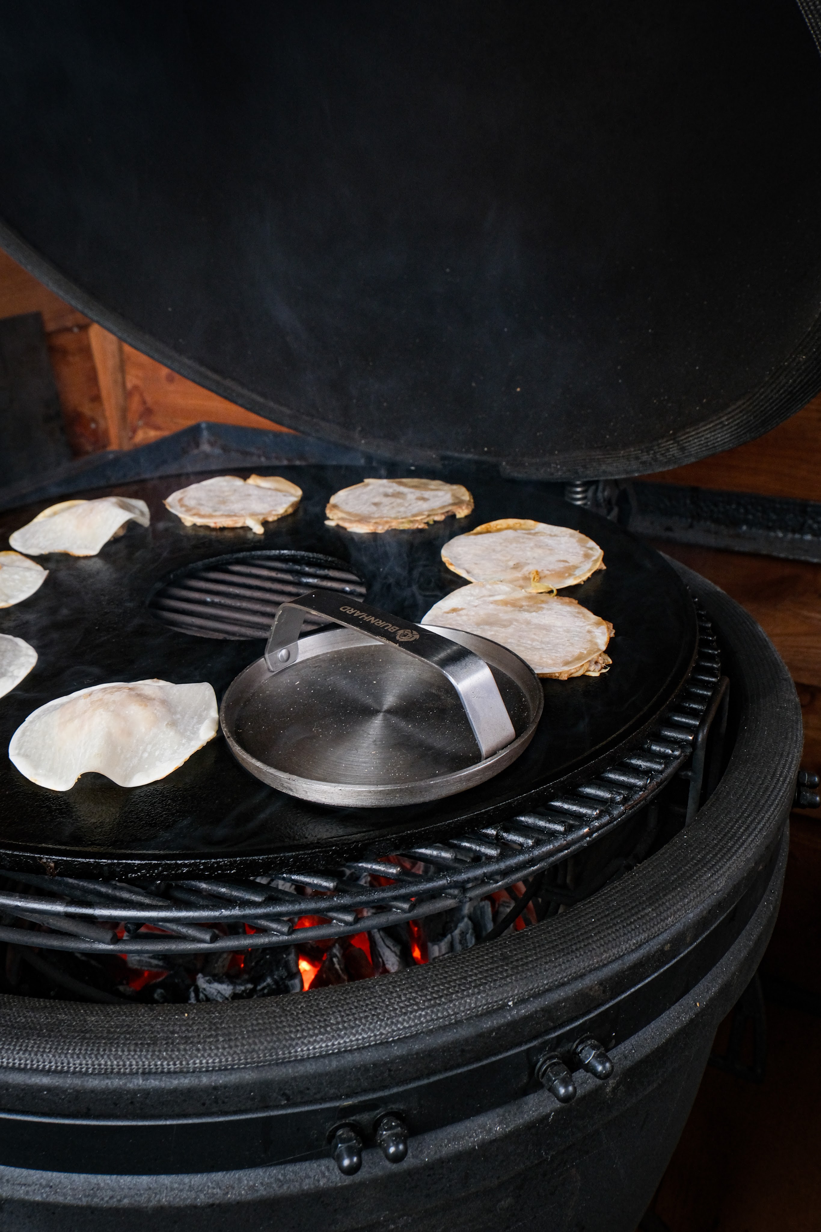 Begin met het aansteken van de bbq naar 180 graden directe hitte. Laat met een de plancha of skillets goed mee opwarmen.