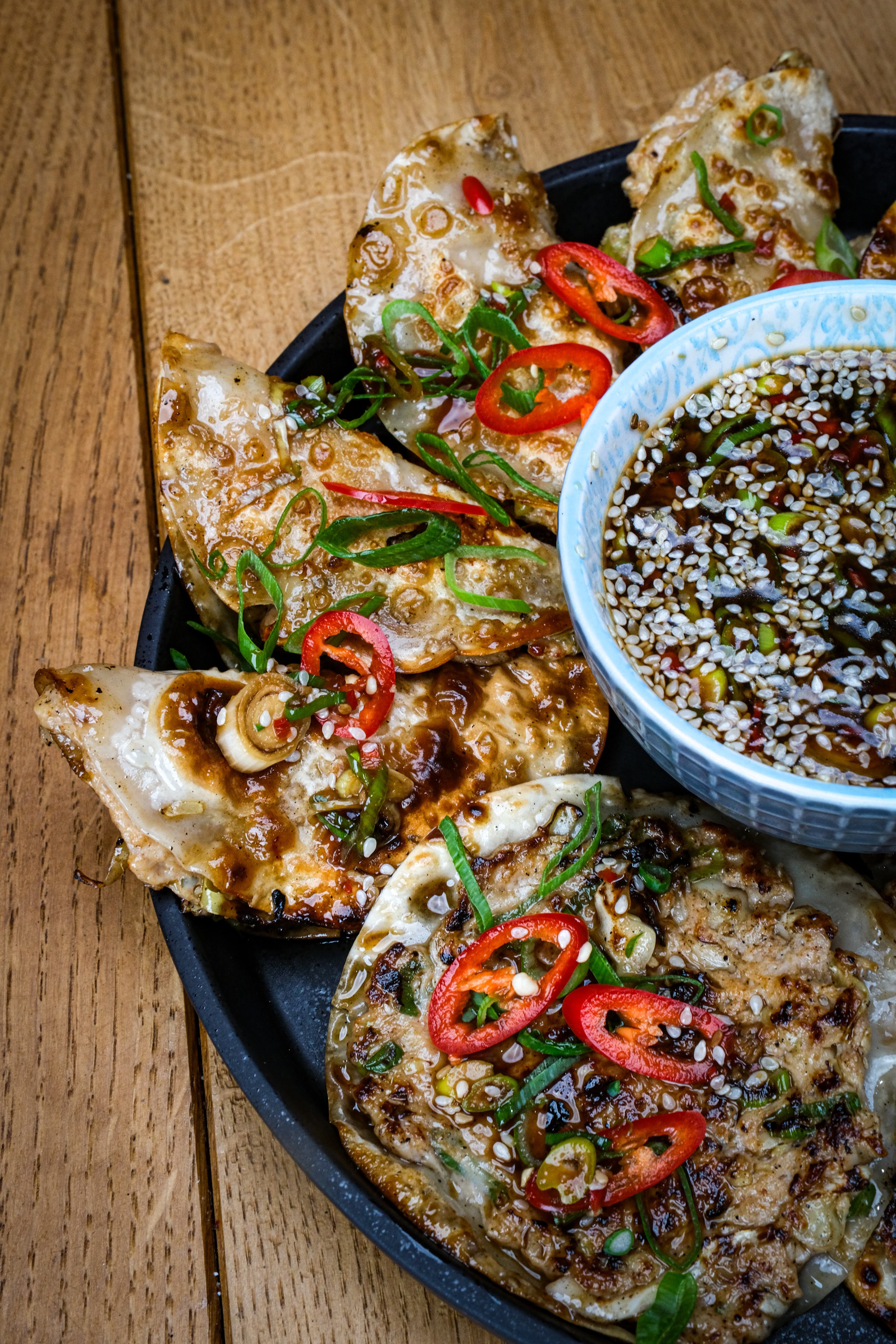 Serveer de gyoza samen met de dip saus zo snel mogelijk. Garneer eventueel af met wat extra rode peper, bosui en sesam zaadjes. Eetsmakelijk