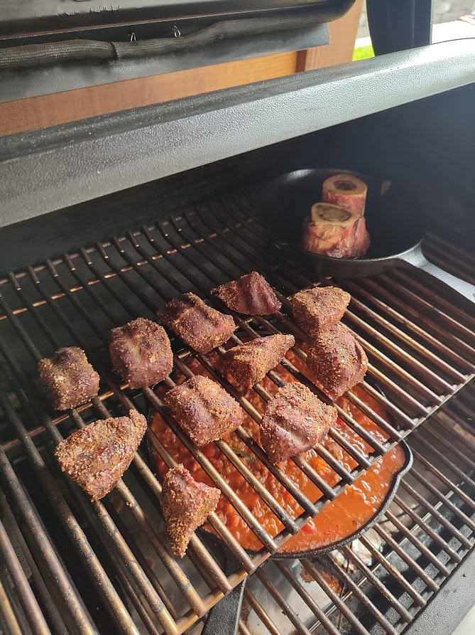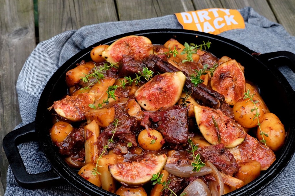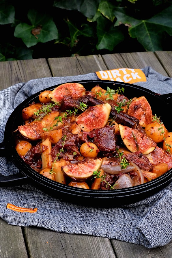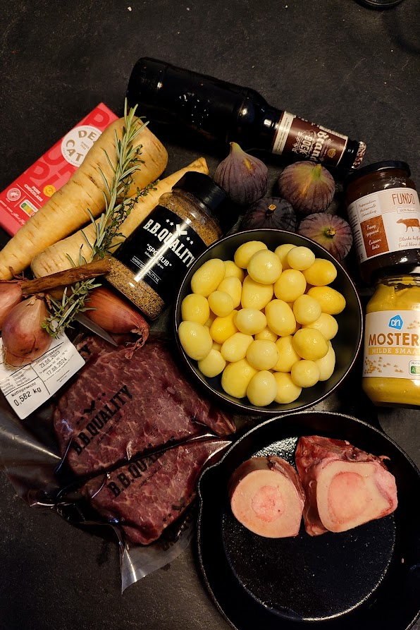 Snij de sukade in grote blokken en smeer deze in met een halve eetlepel mosterd en voorzie rijkelijk van de rub en leg de mergpijpjes in een skillet. Doe nu de rookhout op de bbq en leg de sukade en de skillet met mergpijpjes op de bbq. Rook dit nu 1 uur. Haal de sukade en mergpijpjes van de bbq en bereid de bbq nu zo dat je hem voor directe hitte kunt gebruiken. Zet de dutch oven op de bbq en breng de bbq nu naar 180 graden. Als de bbq de 180 graden heeft gehaald en de dutch oven goed heet is doe er dan een beetje olie in. Bak de sukade blokjes goed aan en als dat gebeurt is blus af met het bier. Voeg nu de mergpijpjes toe en laat dit 10 minuten sudderen. Na de 10 minuten voeg dan de fond, rest van de mosterd en de kruiden toe en breng aan de kook. Als het aan de kook is bouw dan snel de bbq weer terug naar indirecte hitte. Zet de dutch oven terug op de bbq en breng de bbq naar 150 graden. Laat dit nu ongeveer 2,5 uur garen. Maak ondertussen de sjalotten schoon als ze klein zijn laat ze heel anders snijd ze door de helft of in kwarten. Schil de pastinaak en snijd deze in grove blokken. Kijk de krieltjes na zitten er grote bij snij die dan door de midden en laat de rest heel. Na de 2,5 uur haal de mergpijpjes uit de stoofschotel en voeg dan de sjalotten, pastinaak en de krieltjes toe en gaar nog eens 40 minuten verder. Mochten de krieltjes na 40 minuten nog niet gaar zijn laat hem dan nog langer garen anders haal je de dutch oven van de bbq en snij de vijgen in kwarten en hak de pure chocolade voeg die toe aan de stoof en breng op smaak met peper en zout. Laat dit nu nog eens met gesloten deksel 10 minuten staan van de bbq af.