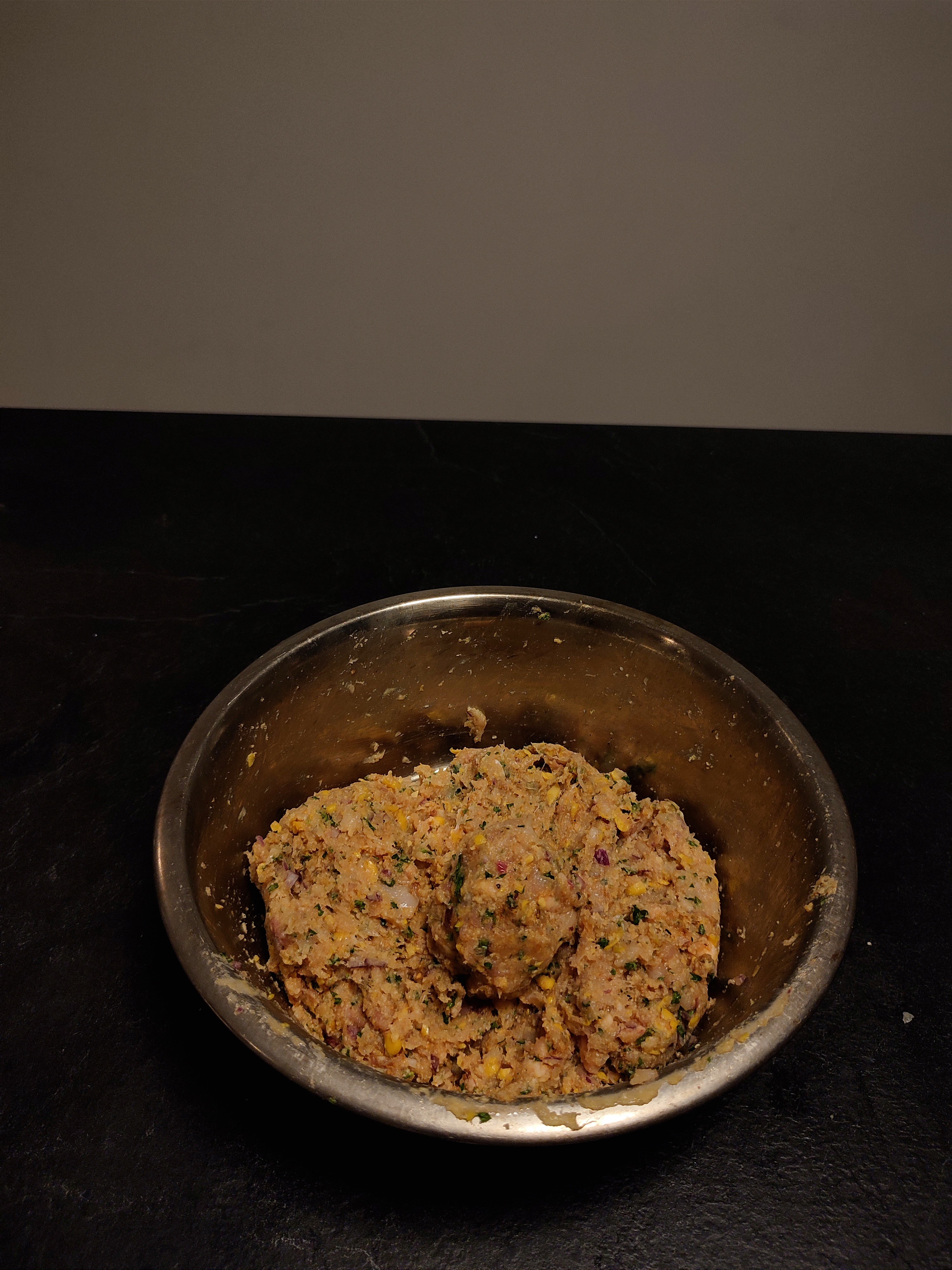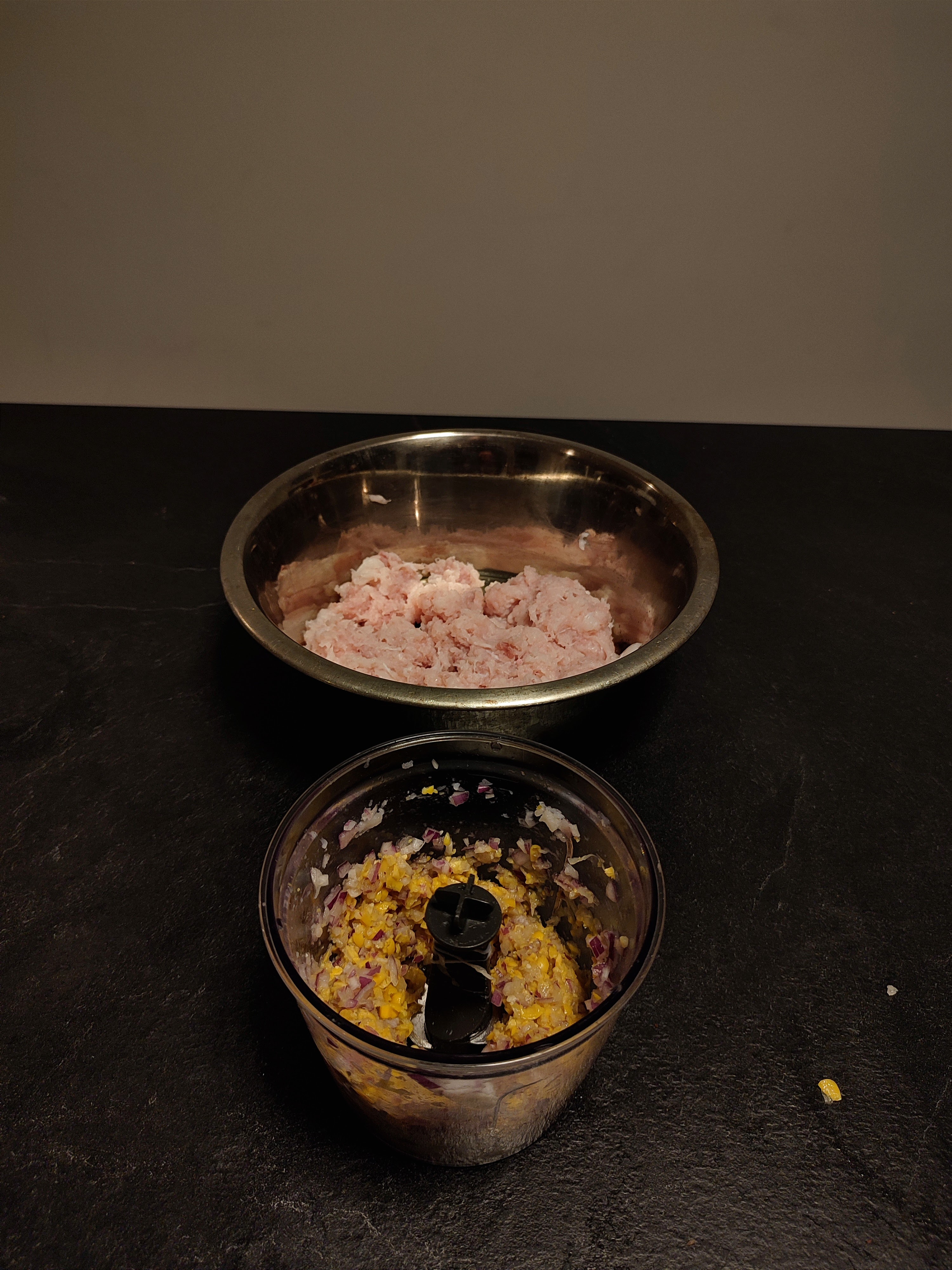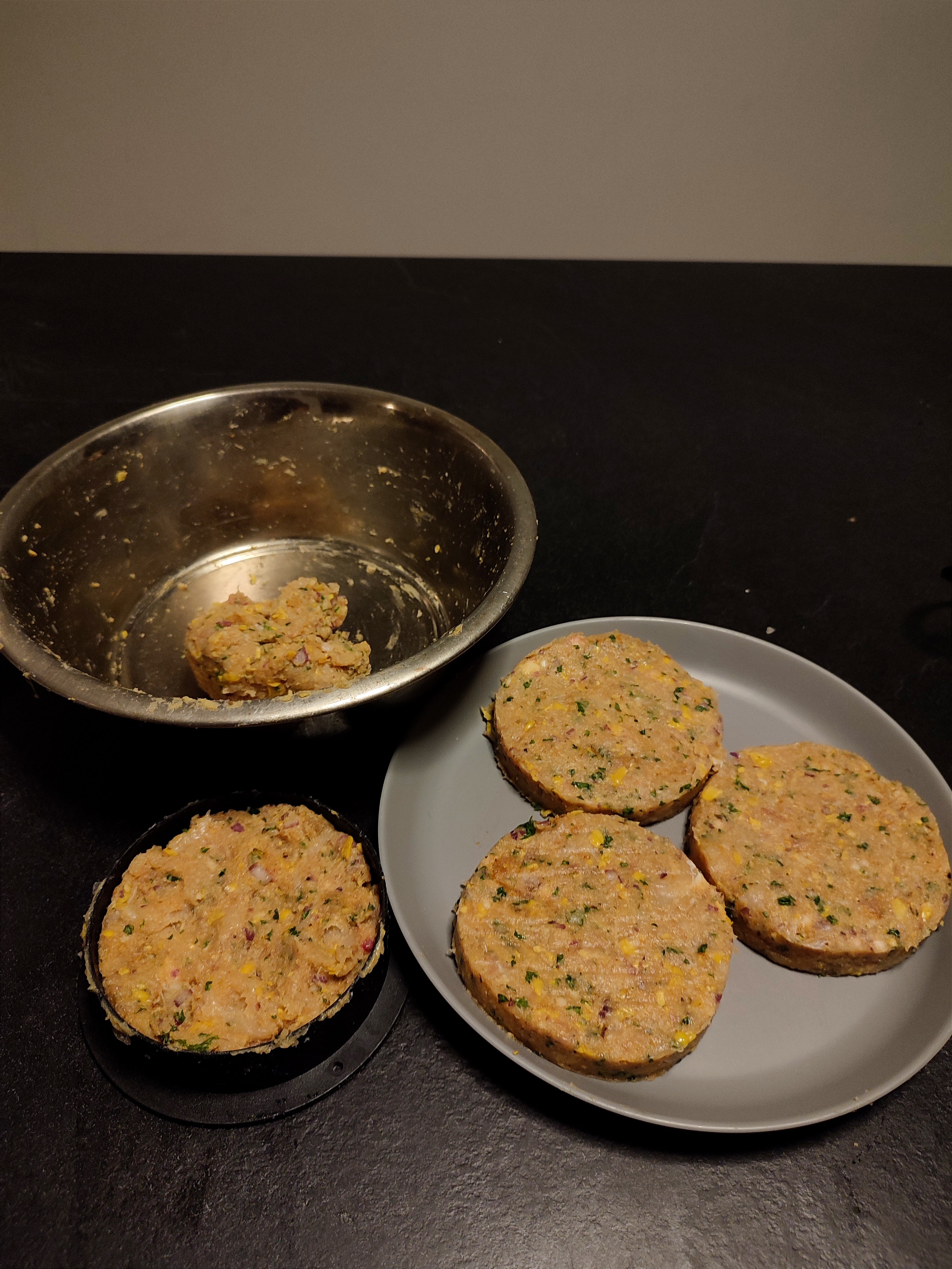druk uit de merg uit de mergpijpjes en hak dit fijn met een mes of hak alleen de bone marrow melt fijn. Snij de krokodil in kleine blokjes en snipper de rode ui. Haal de krokodil, mais en rode ui door de gehaktmolen of hak ze in de keukenmachine. Meng nu alle ingrediënten goed door elkaar en kneed dit tot een stevig deeg. Bak een klein beetje om te kijken of de smaak goed is anders voeg wat extra kruiden of zout en peper toe. Vorm ze nu in 5 burgers en laat minimaal een paar uur opstijven in de koelkast. Gril de burgers nu direct boven de kolen tot een kern van 72 graden.