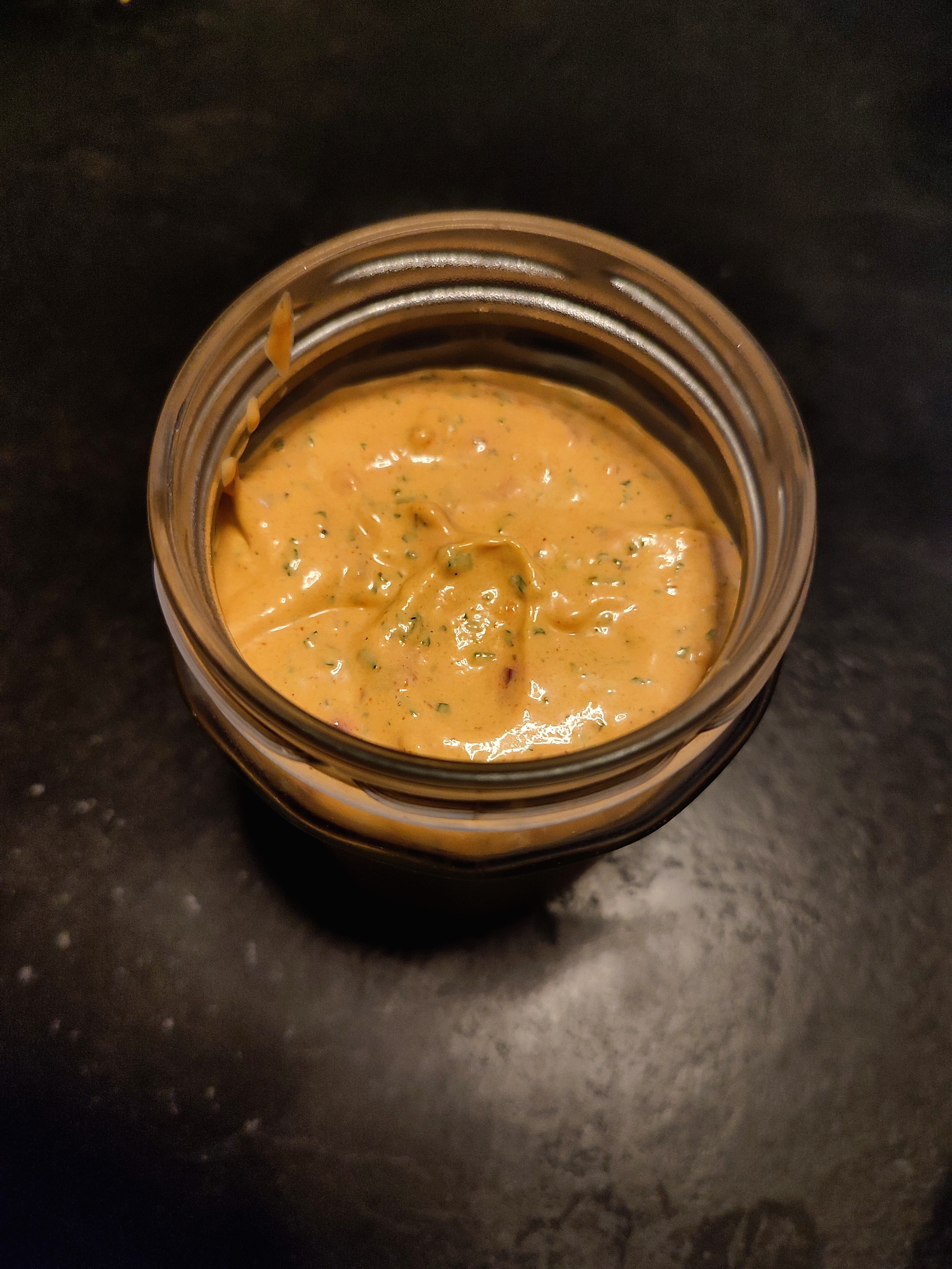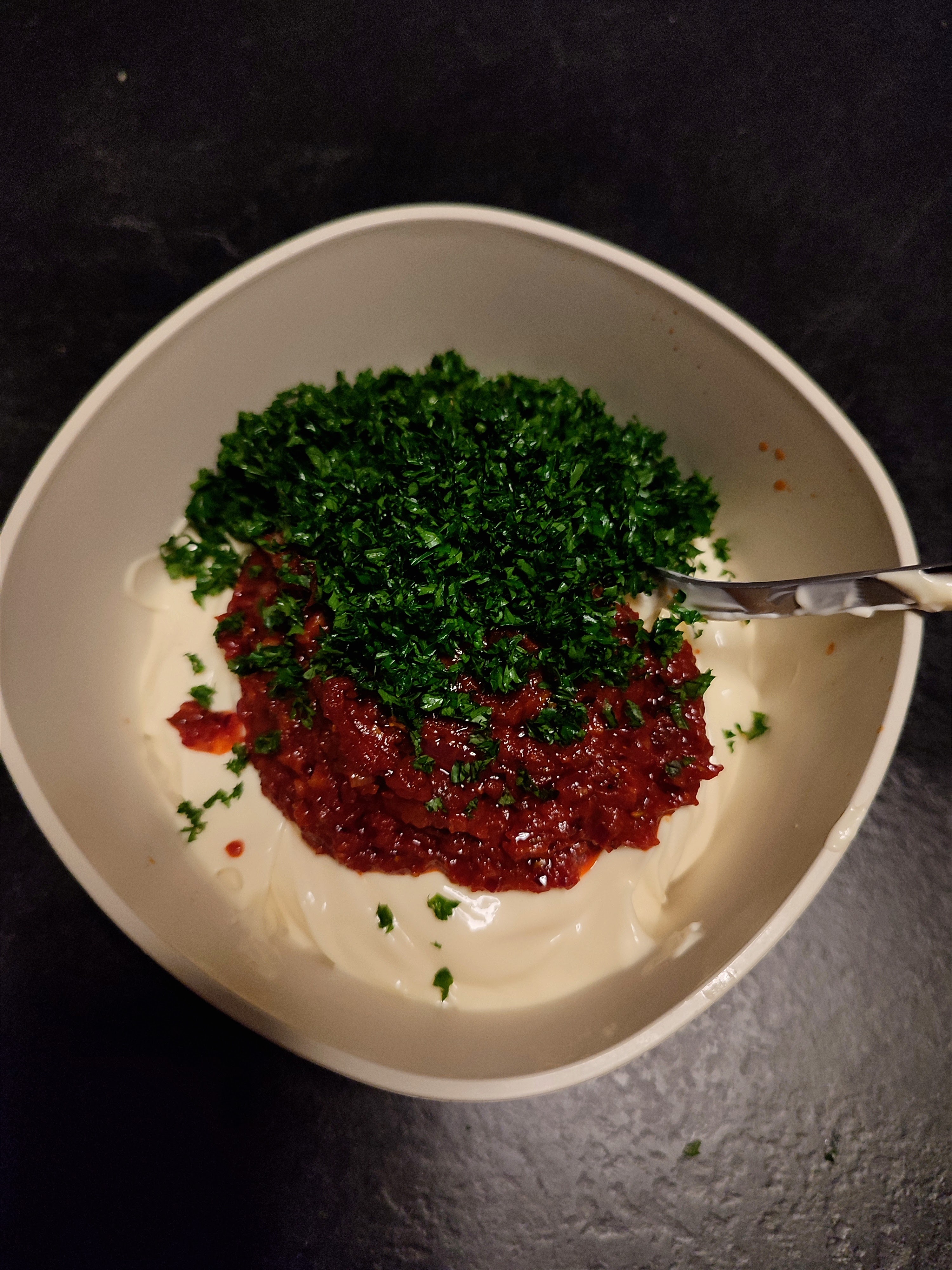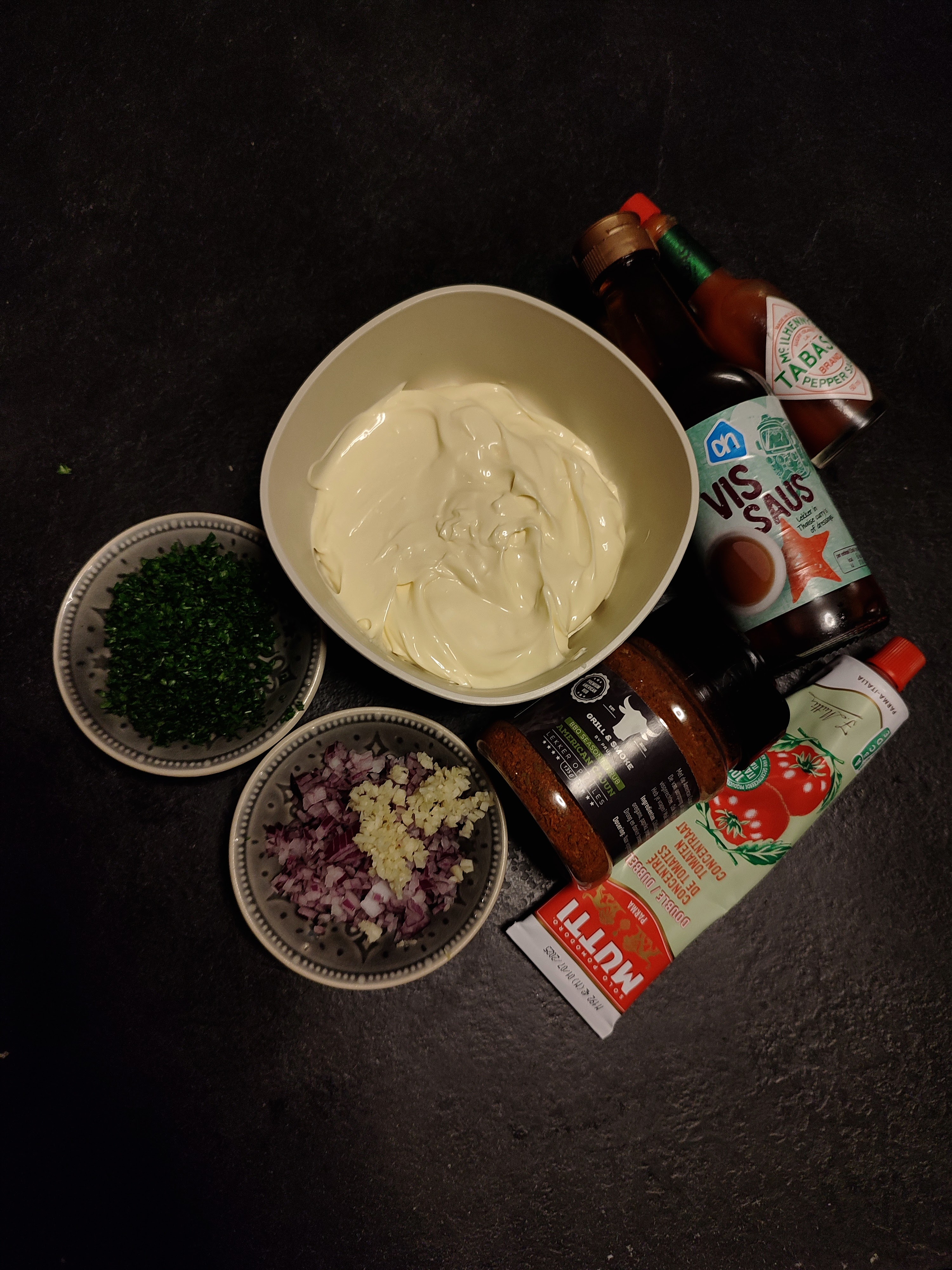 Snipper de kleine rode ui en hak de knoflook en peterselie. Fruit nu in een pannetje de rode ui en knoflook aan tot ze glazig zijn. Voeg de tomaten puree, rub, vissaus en tabasco toe en bak dit nog even kort aan. Meng dit mengsel nu met de mayonaise en de peterselie. Breng op smaak met peper en zout.