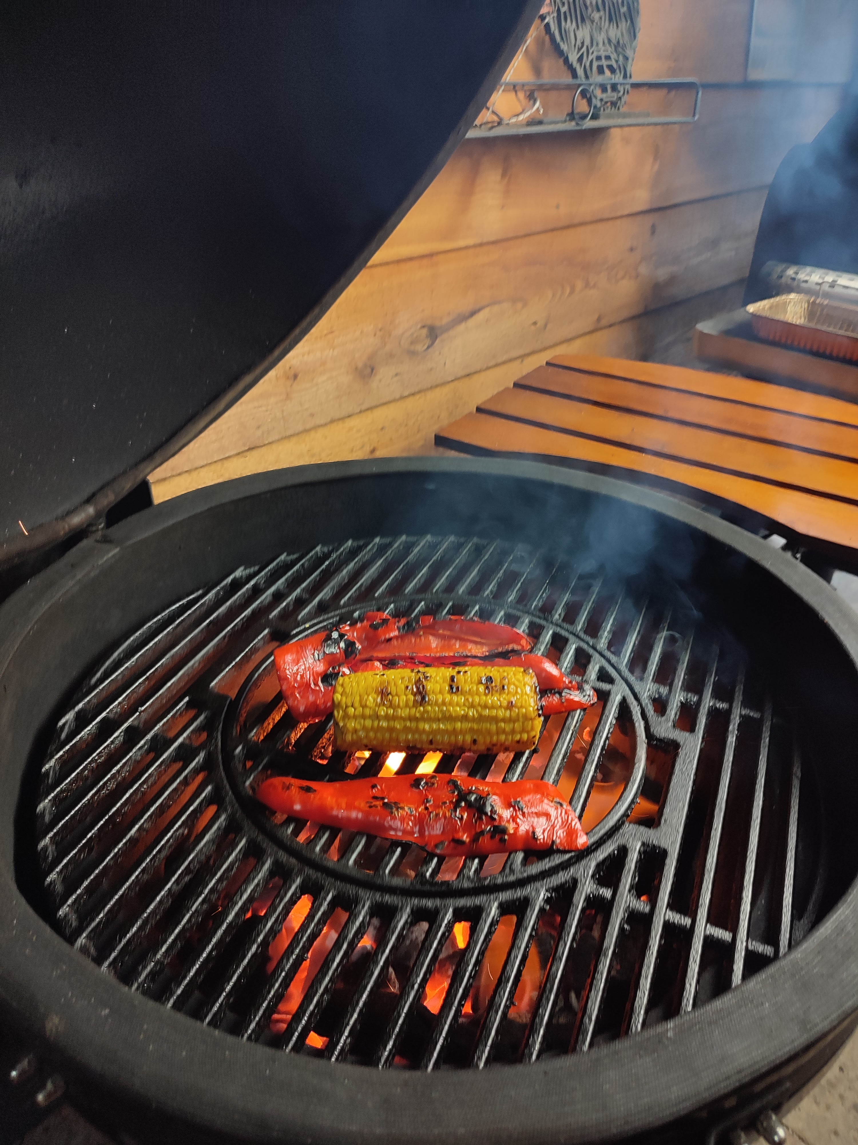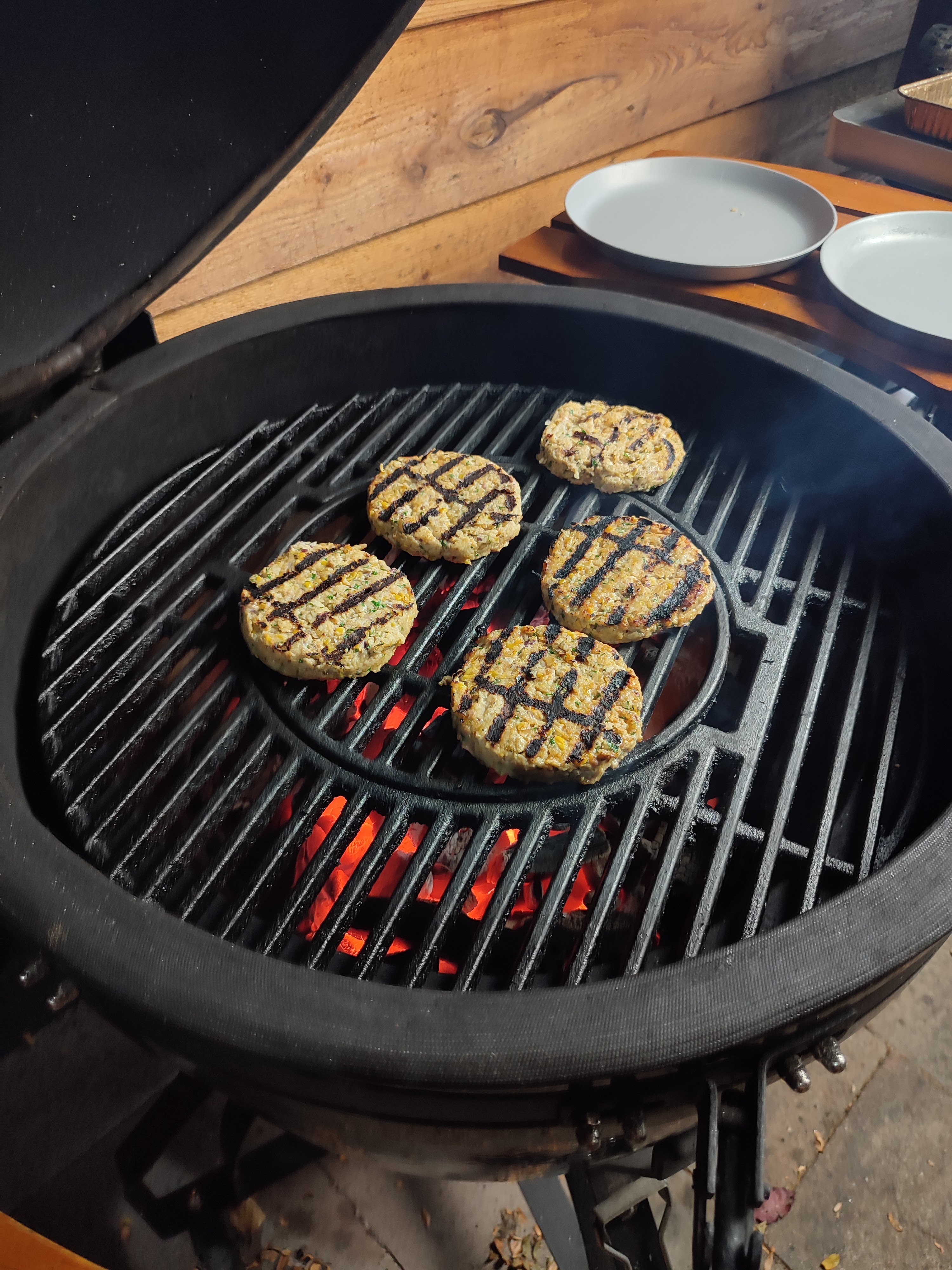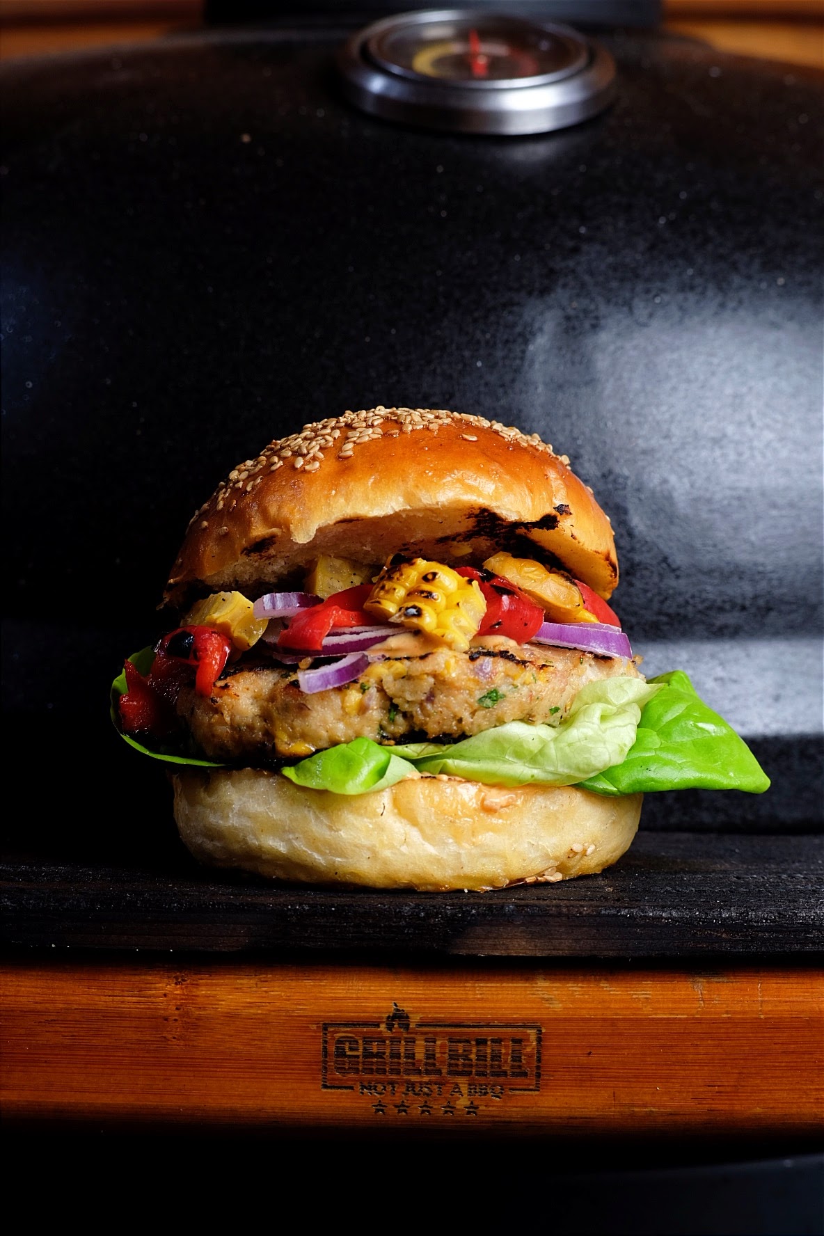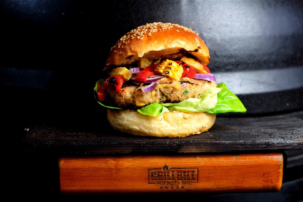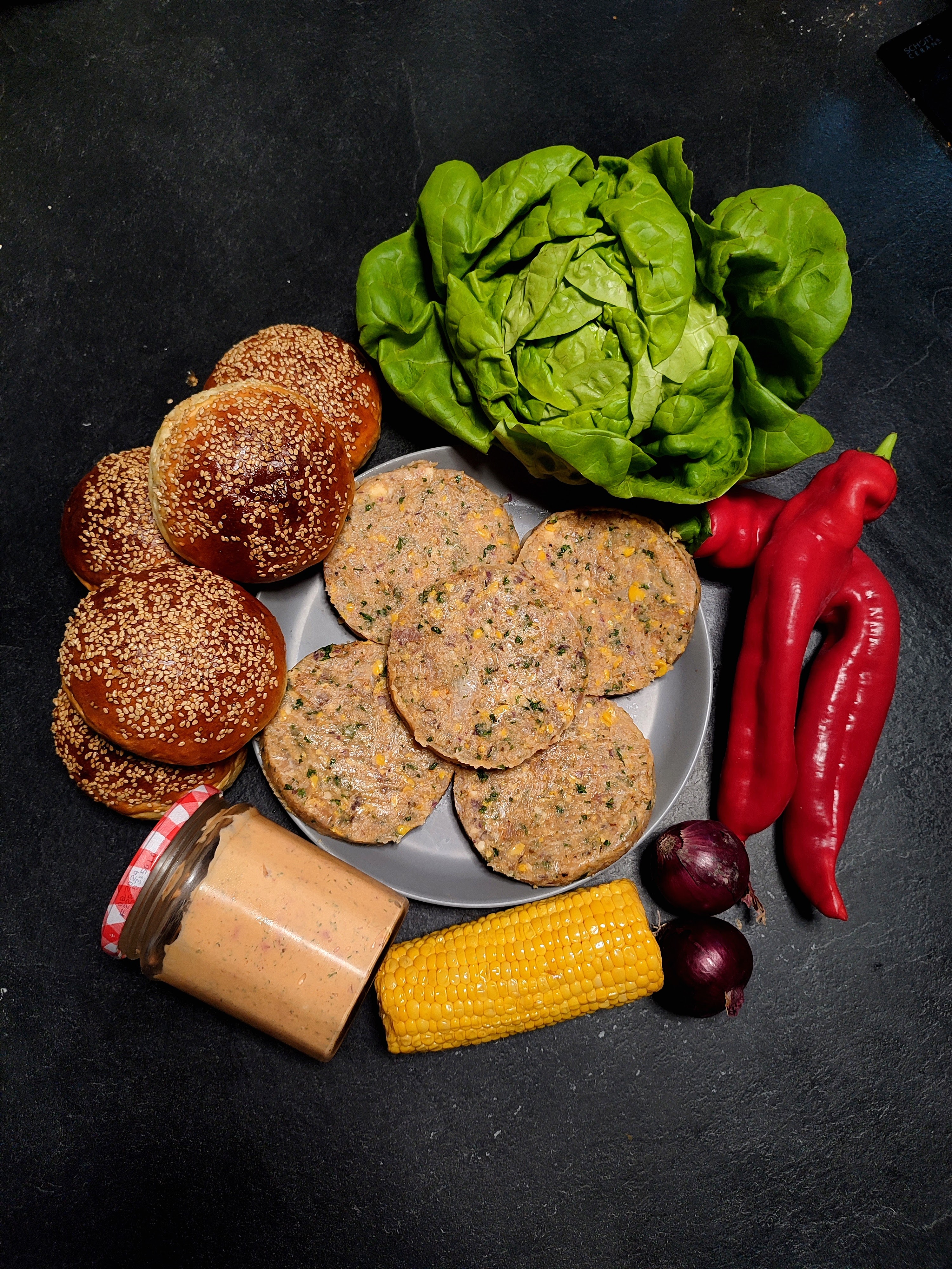 Maak het hamburgerbroodjes recept als je die zelf wilt maken. Snij de paprika door de midden en haal de zaadjes eruit. Gril nu de maiskolf en paprika tot deze mooi gekleurd zijn en haal ze van de bbq. Snij de maiskorrels van de maiskolf en snij de rode ui en paprika in halve ringen. Snij de burger broodjes door de midden en gril deze even kort voor mooie gril strepen. Was de bladsla.
