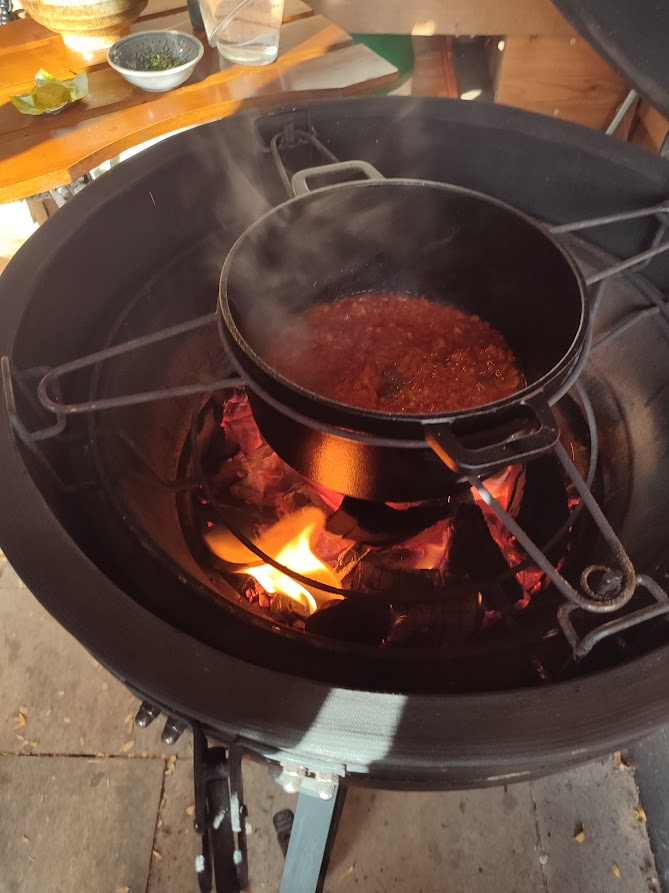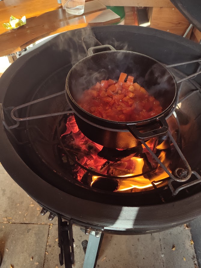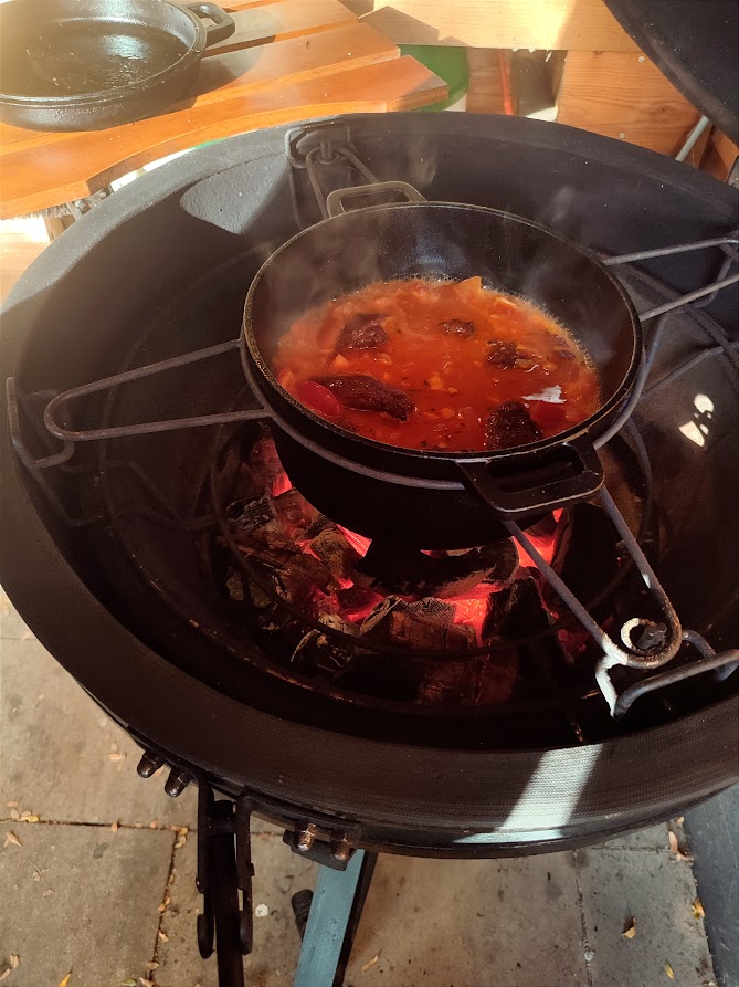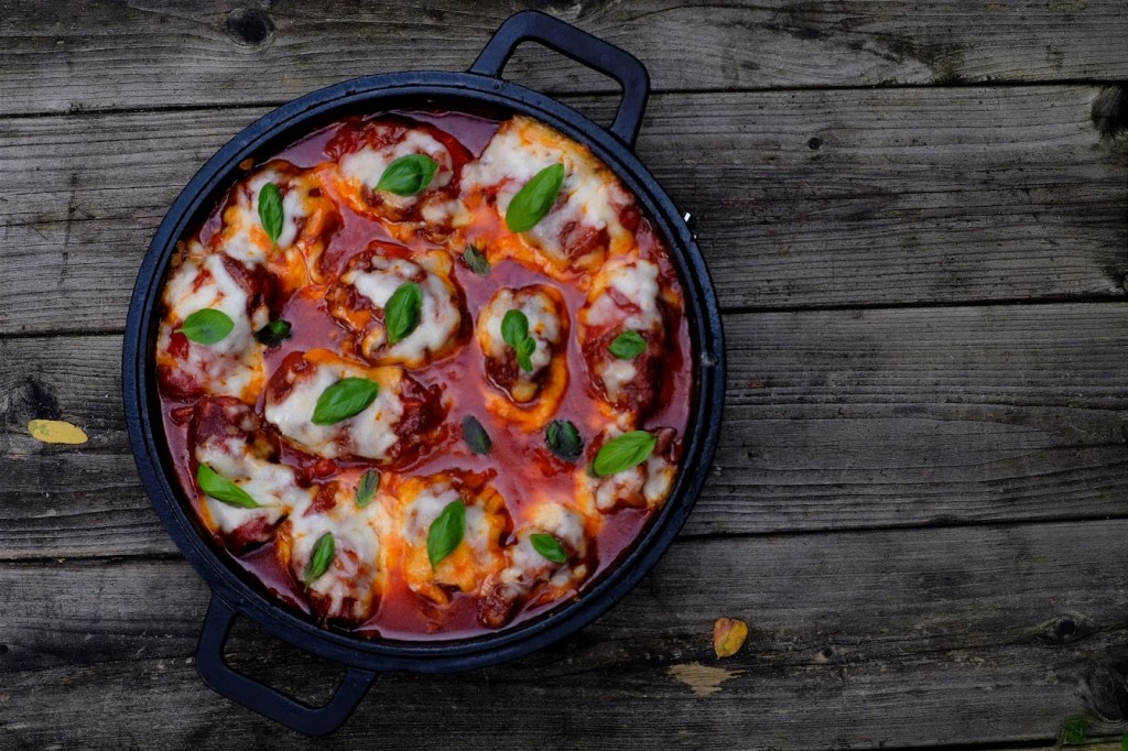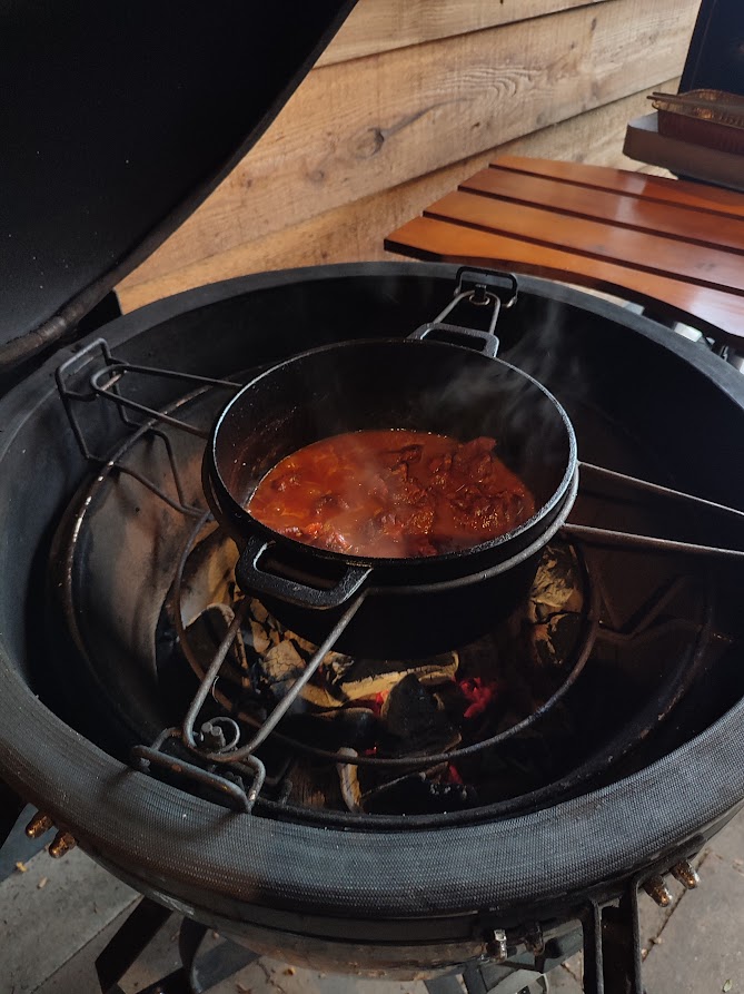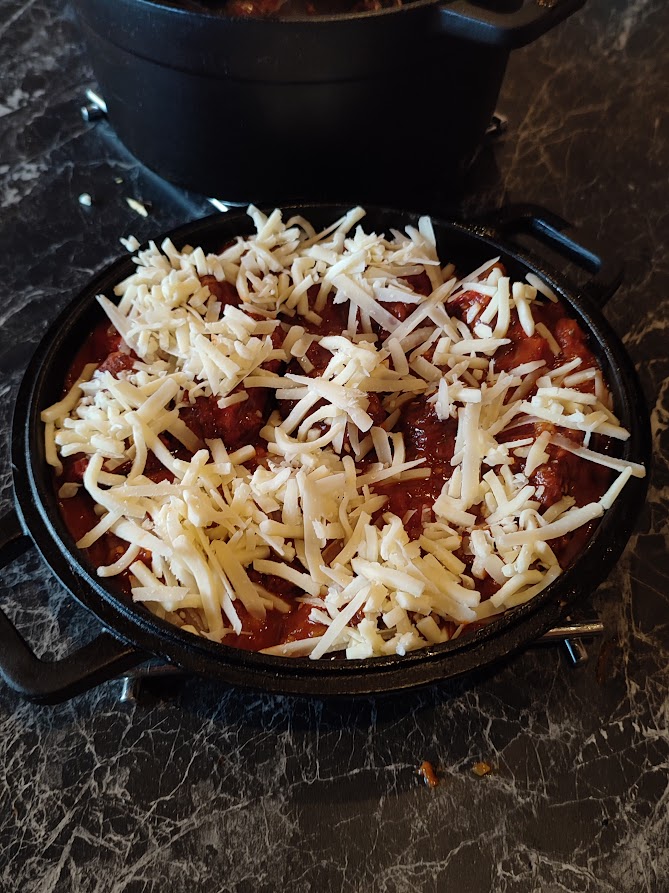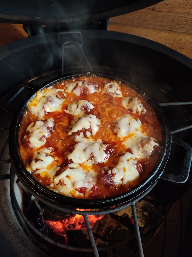 Mocht je wangetjes hebben waar nog vlies op zit verwijder deze dan eerst en voorzie ze van de rub. Snipper nu de ui en hak de knoflook. Ris de blaadjes van de tijm en rozemarijn en hak deze fijn en snij de tomaten in blokjes. Als de bbq op temperatuur is leg dn het rookhout op de kolen en de wangetjes op het rooster. Rook de wangetjes nu voor 30 minuten en haal ze van de bbq. Bouw de bbq nu op zodat de dutch oven direct boven de kolen kan en breng de bbq naar 200 graden. Smelt de boter in de dutch oven en bak nu de ui en de knoflook aan tot glazig. Voeg nu de tomatenpuree tot en bak deze even mee aan nu kunnen de tomaten, kruiden en bouillon erbij. Breng dit aan de kook en voeg nu de wangetjes toe aan de dutch oven en doe de deksel erop. Breng de bbq nu terug naar 160 graden en gaar deze nu 2 tot 4 uur tot de wangetjes heerlijk zacht zijn en net niet uit elkaar vallen roer wel af en toe door. Als de wangetjes zover zijn meng dan de mozzarella en parmezaanse kaas door elkaar en leg op elk wangetje een hoop kaas. En laat ze nu zonder deksel nog even garen tot de kaas gesmolten is.