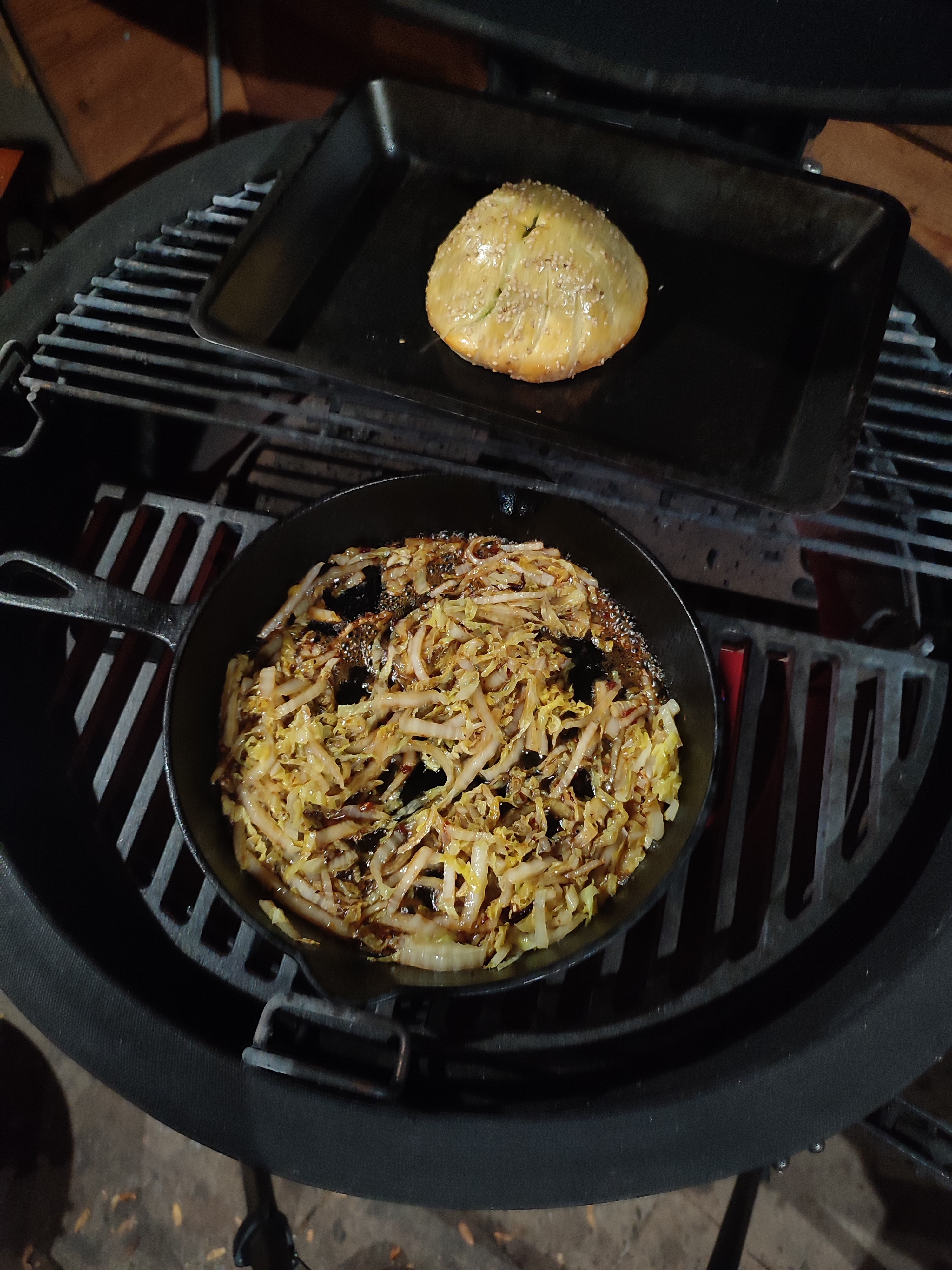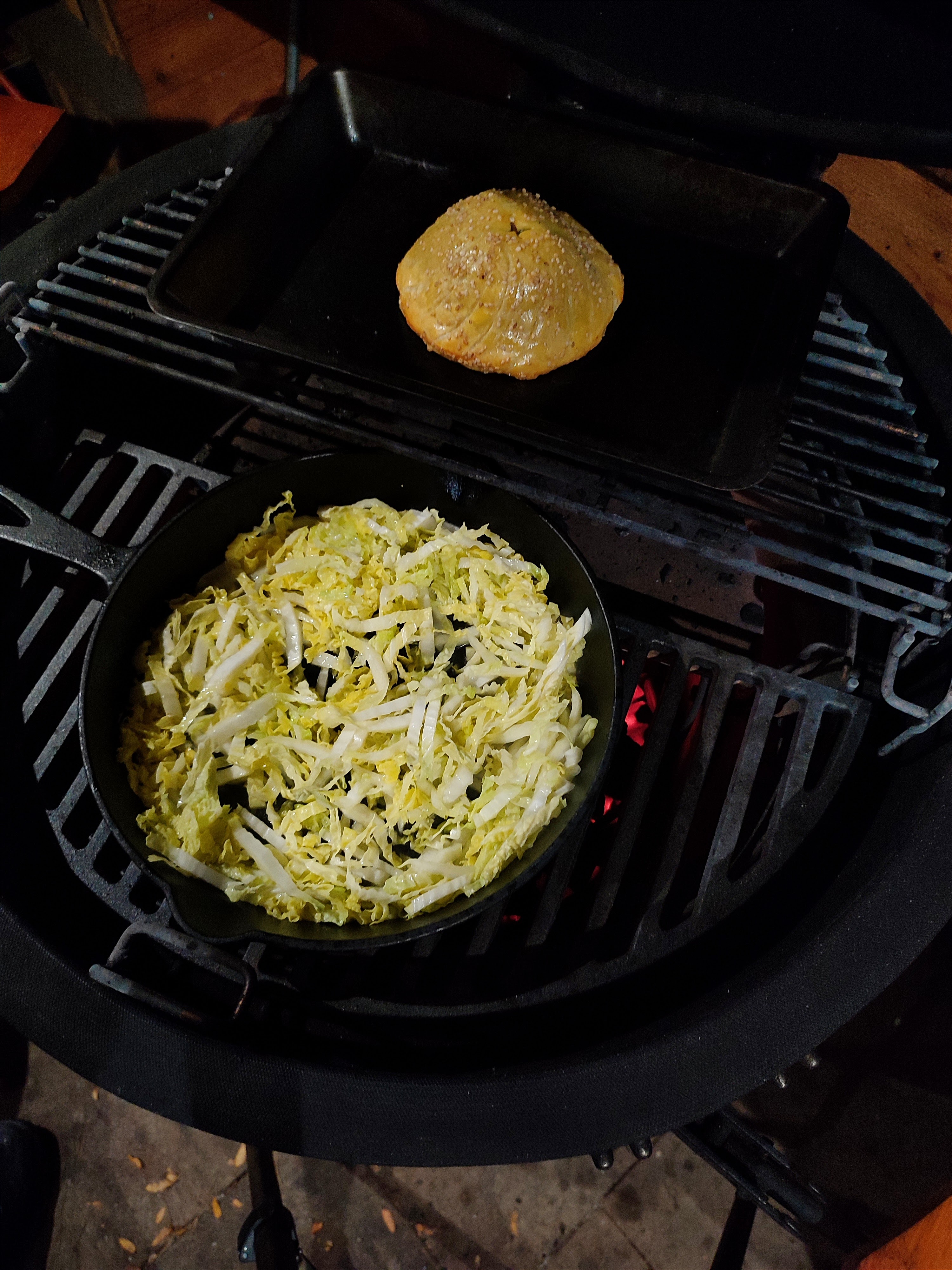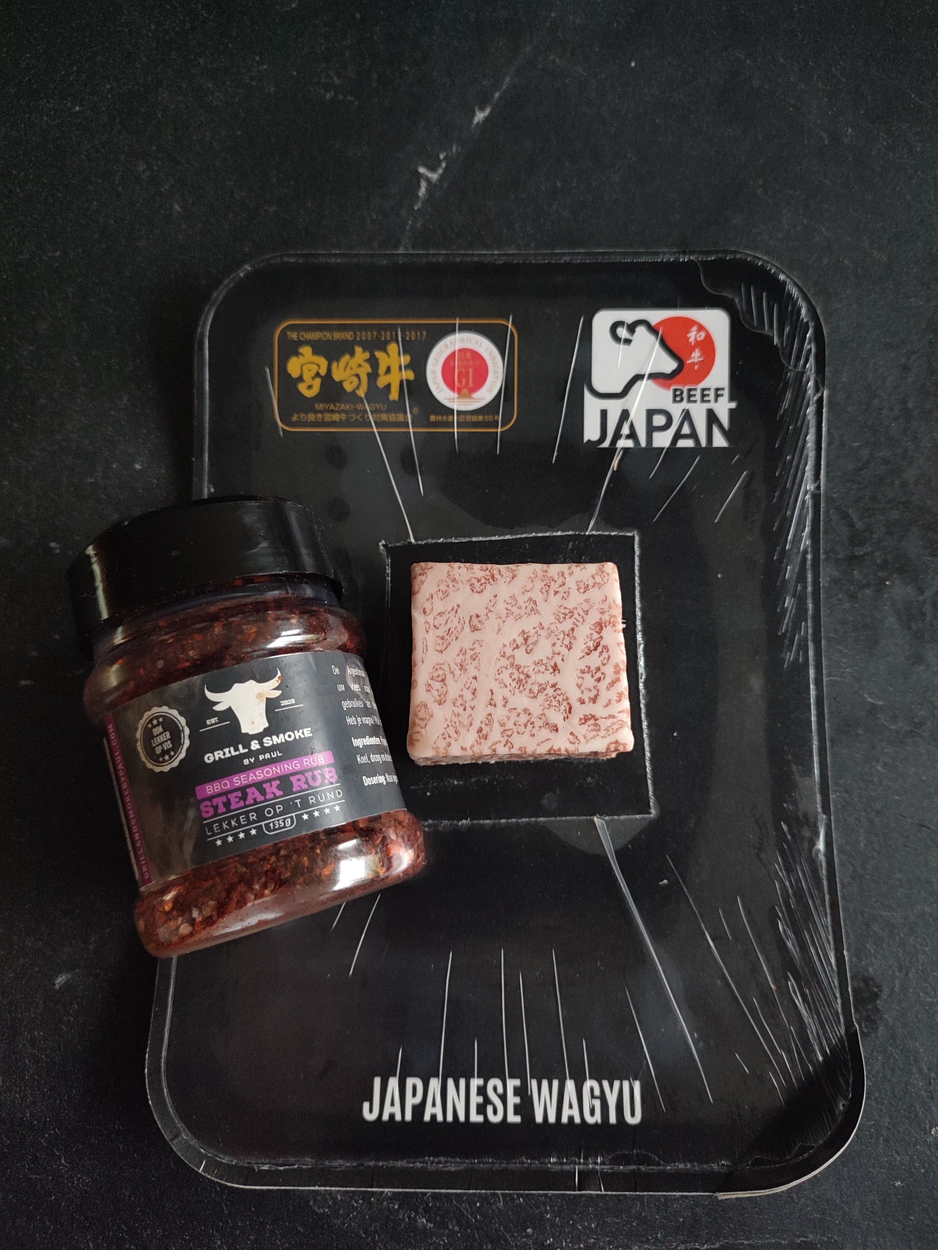 Voorzie het blokje wagyu van de steak rub en grill deze kort aan alle kanten aan op de bbq op hoge temperatuur. Zet hem daarna meteen in de vriezer zodat deze snel weer goed koud wordt. Hak de paddenstoelen fijn en bak deze in de pan goed aan voeg daarna 1 tl. Knoflookpulp, 1 el. sojasaus en ½ el. mirin aan de duxelle toe en bak dit tot het vocht opgenomen is. Haal van de chinese kool 3 bladeren en snij de kerf ervan af. blancheer deze voor 30 seconden in koken water en koel meteen terug in ijswater. Leg wat plasticfolie neer en leg de chinese kool in een vierkant erop. Verdeel hier de duxelle overheen en laat een stukje van de randen vrij. Leg het blokje wagyu in het midden hiervan en klap de plasticfolie over de wagyu zodat deze helemaal bedekt is en leg dit kort in de vriezer. Zodra het koud is leg 1 blaadje bladerdeeg onder op en leg het wagyu blokje zonder de folie in het midden van de bladerdeeg. Leg de andere twee bladen op elkaar en rol deze in een iets grotere vierkant. Leg deze over het wagyu blokje en druk de randen goed aan en snij het overtollige bladerdeeg aan de rand weg. Voorzie de wellington van een mooi motiefje en besmeer met een losgeklopte eidooier. Strooi er een beetje sesam zaad overheen. Zet de wellington op een bakplaatje op de indirecte zijden op de bbq en bak deze voor ongeveer 20 tot 25 minuten tot een kern van 48 graden. Zet ondertussen de skillet op de directe zijde en snij de rest van de chinese kool in reepjes. Meng ook de rest van de sojasaus, mirin, knoflookpulp en de bacon jalapon rub door elkaar. Bak nu de chinese kool kort aan in de skillet voeg daarna de kippenfond toe en laat dit even stoven tot de fond helemaal opgenomen is. Voeg nu de saus die je net gemengd hebt toe aan de chinese kool en bak deze nog even tot bijna helemaal opgenomen is. Haal als de wellington klaar is deze van de bbq en laat even rusten.