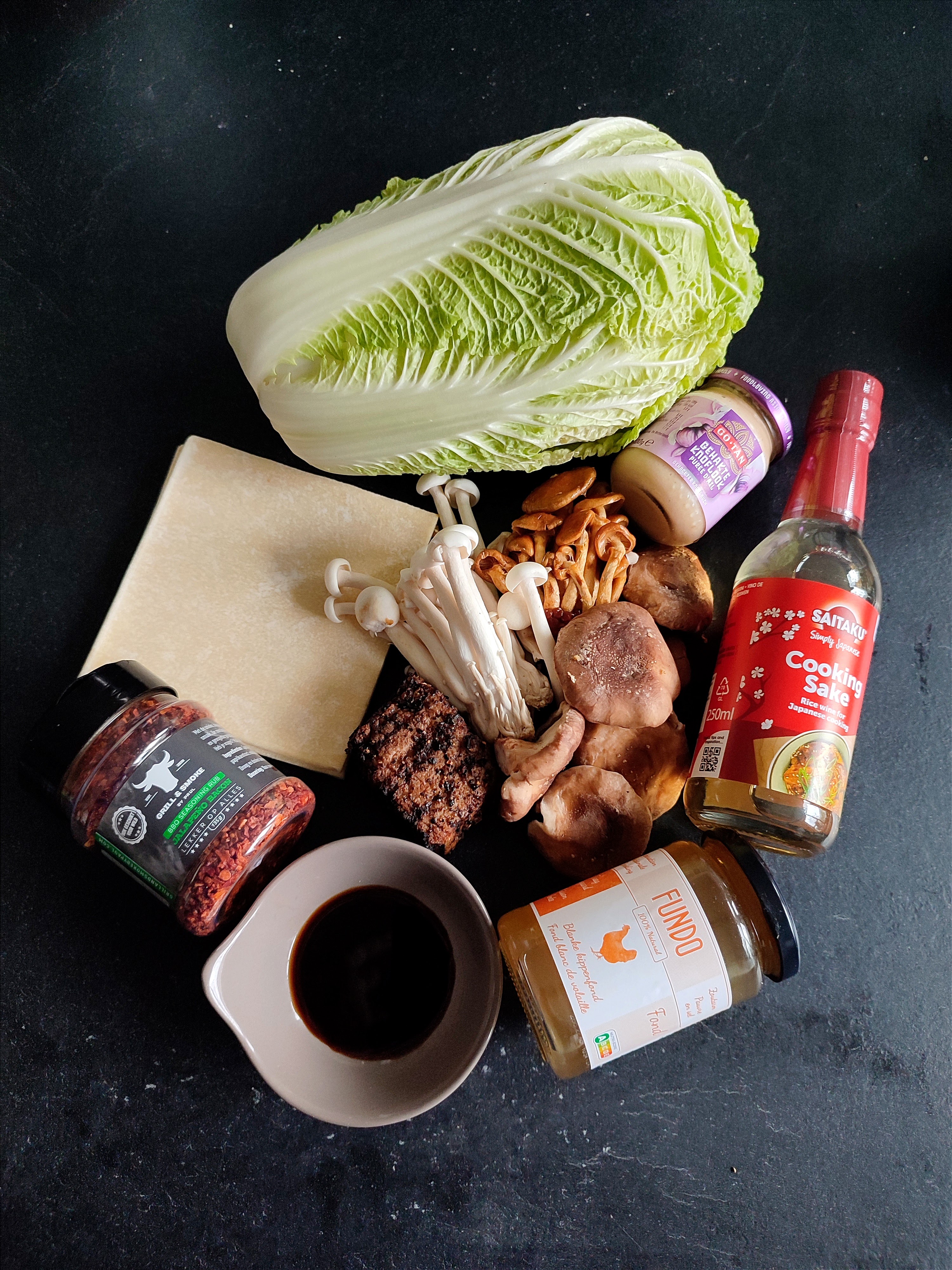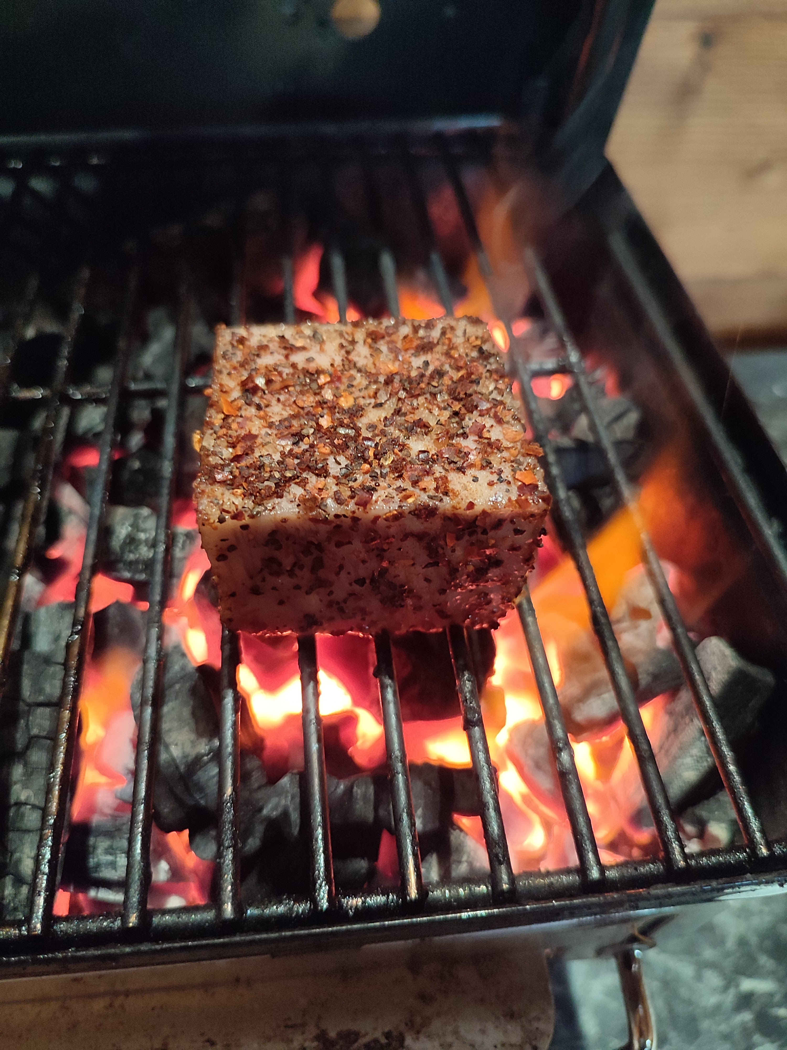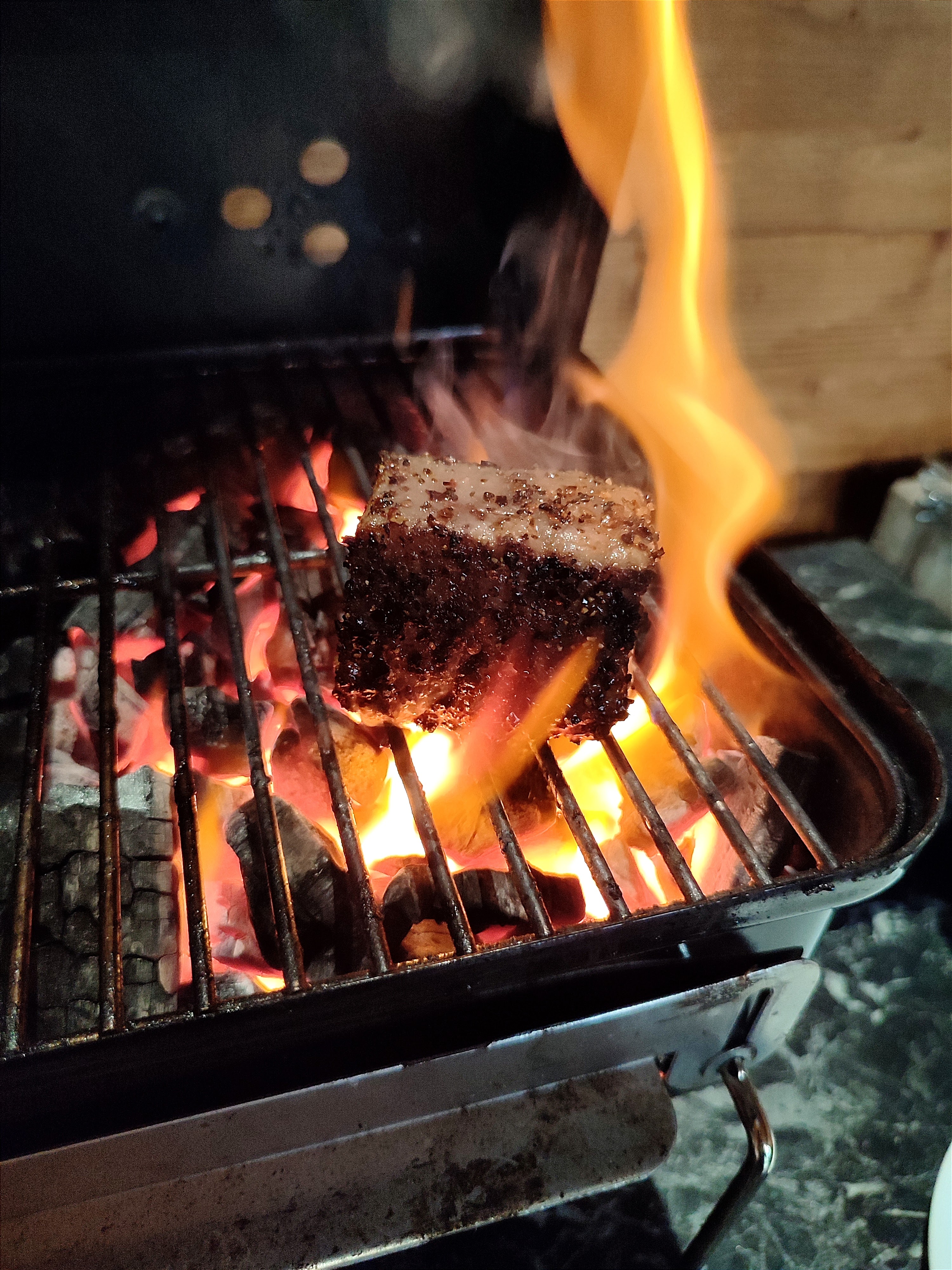 Voorzie het blokje wagyu van de steak rub en grill deze kort aan alle kanten aan op de bbq op hoge temperatuur. Zet hem daarna meteen in de vriezer zodat deze snel weer goed koud wordt. Hak de paddenstoelen fijn en bak deze in de pan goed aan voeg daarna 1 tl. Knoflookpulp, 1 el. sojasaus en ½ el. mirin aan de duxelle toe en bak dit tot het vocht opgenomen is. Haal van de chinese kool 3 bladeren en snij de kerf ervan af. blancheer deze voor 30 seconden in koken water en koel meteen terug in ijswater. Leg wat plasticfolie neer en leg de chinese kool in een vierkant erop. Verdeel hier de duxelle overheen en laat een stukje van de randen vrij. Leg het blokje wagyu in het midden hiervan en klap de plasticfolie over de wagyu zodat deze helemaal bedekt is en leg dit kort in de vriezer. Zodra het koud is leg 1 blaadje bladerdeeg onder op en leg het wagyu blokje zonder de folie in het midden van de bladerdeeg. Leg de andere twee bladen op elkaar en rol deze in een iets grotere vierkant. Leg deze over het wagyu blokje en druk de randen goed aan en snij het overtollige bladerdeeg aan de rand weg. Voorzie de wellington van een mooi motiefje en besmeer met een losgeklopte eidooier. Strooi er een beetje sesam zaad overheen. Zet de wellington op een bakplaatje op de indirecte zijden op de bbq en bak deze voor ongeveer 20 tot 25 minuten tot een kern van 48 graden. Zet ondertussen de skillet op de directe zijde en snij de rest van de chinese kool in reepjes. Meng ook de rest van de sojasaus, mirin, knoflookpulp en de bacon jalapon rub door elkaar. Bak nu de chinese kool kort aan in de skillet voeg daarna de kippenfond toe en laat dit even stoven tot de fond helemaal opgenomen is. Voeg nu de saus die je net gemengd hebt toe aan de chinese kool en bak deze nog even tot bijna helemaal opgenomen is. Haal als de wellington klaar is deze van de bbq en laat even rusten.