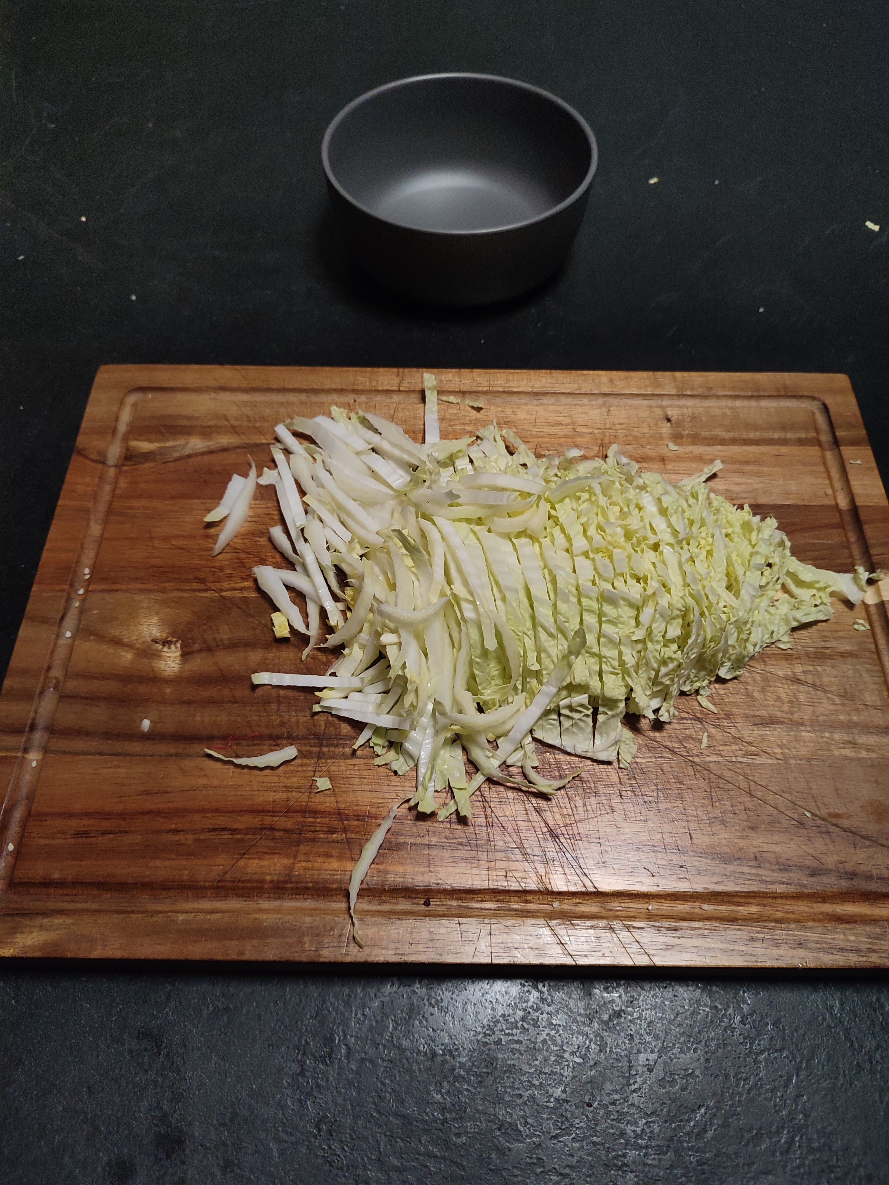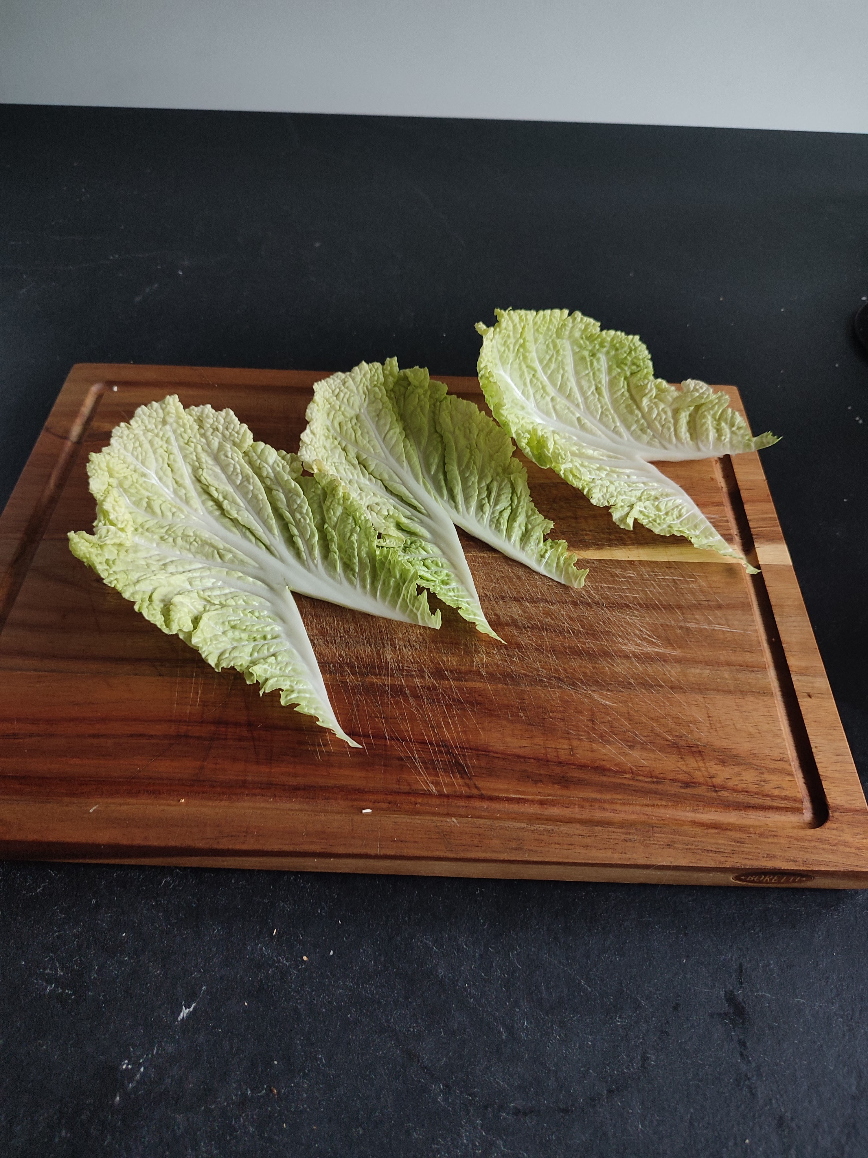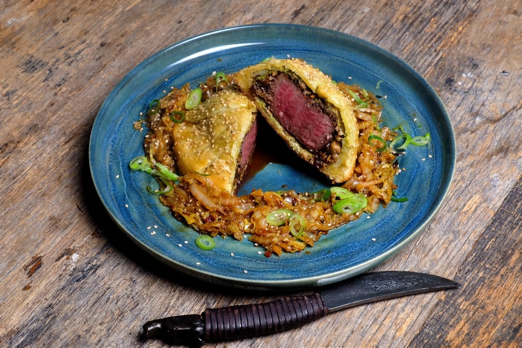 Snij de wellington door de midden na het rusten. Leg op elk bord de helft van de gestoofde chinese kool en leg hier de helft van de wellington op. Garneer eventueel af met een beetje bosui en sesamzaadjes. Eetsmakelijk.