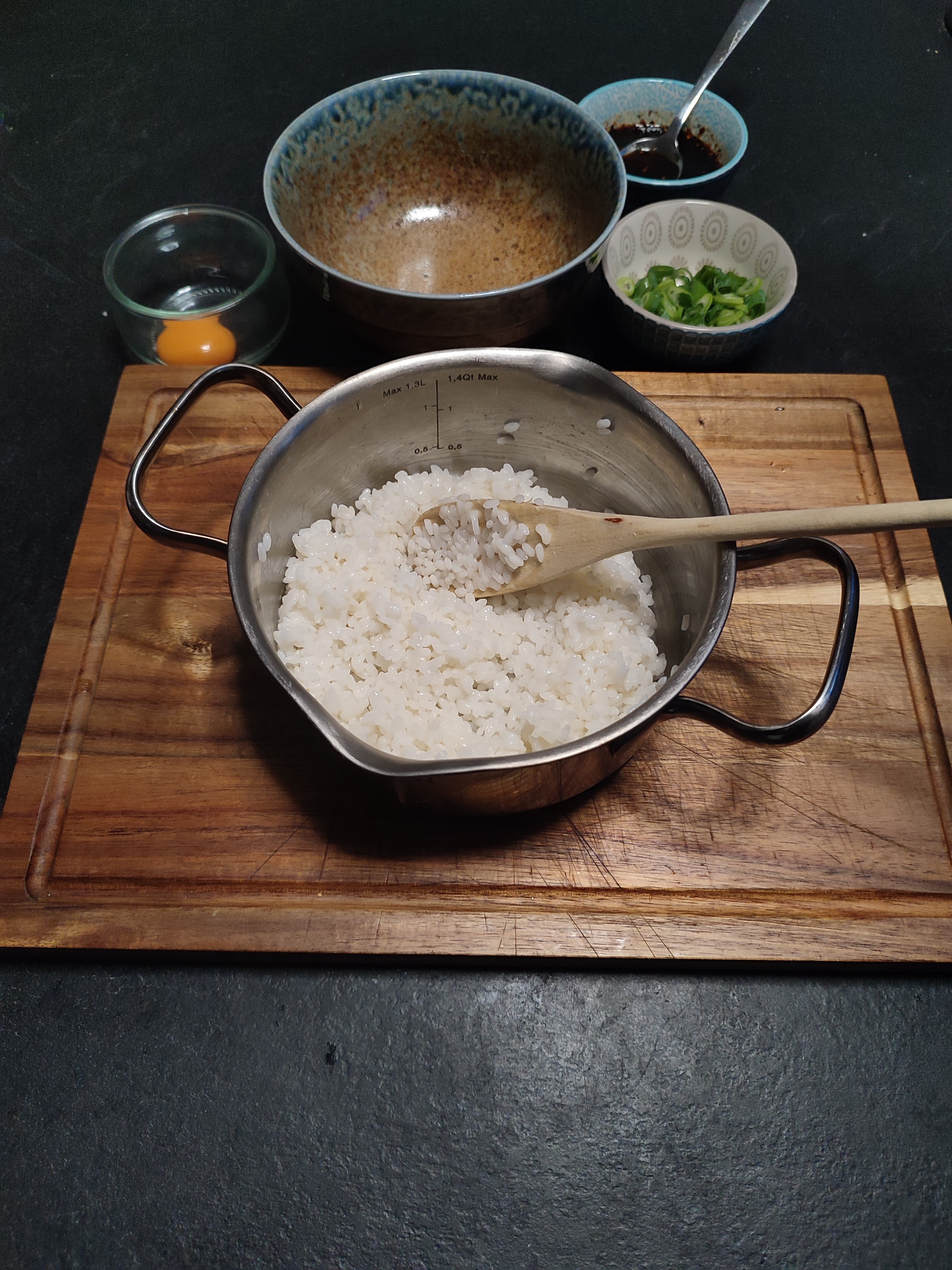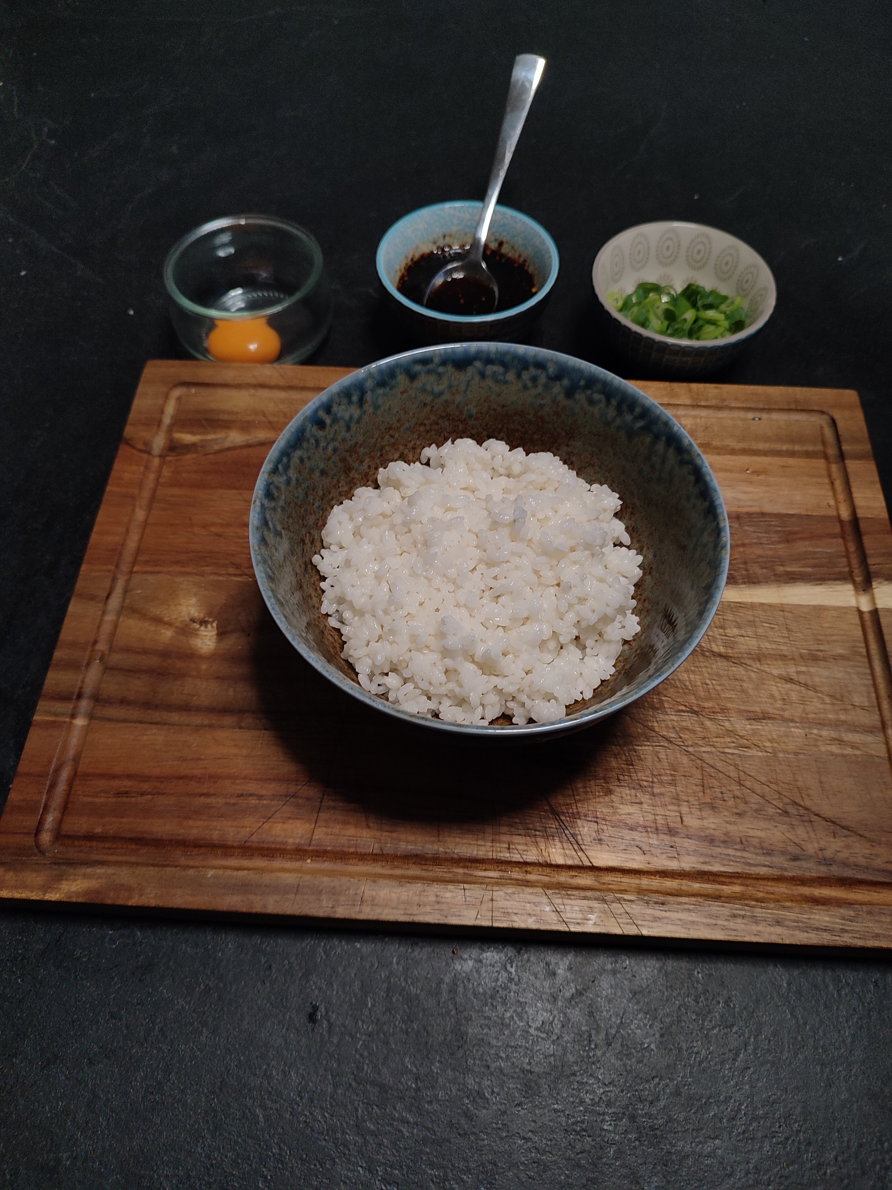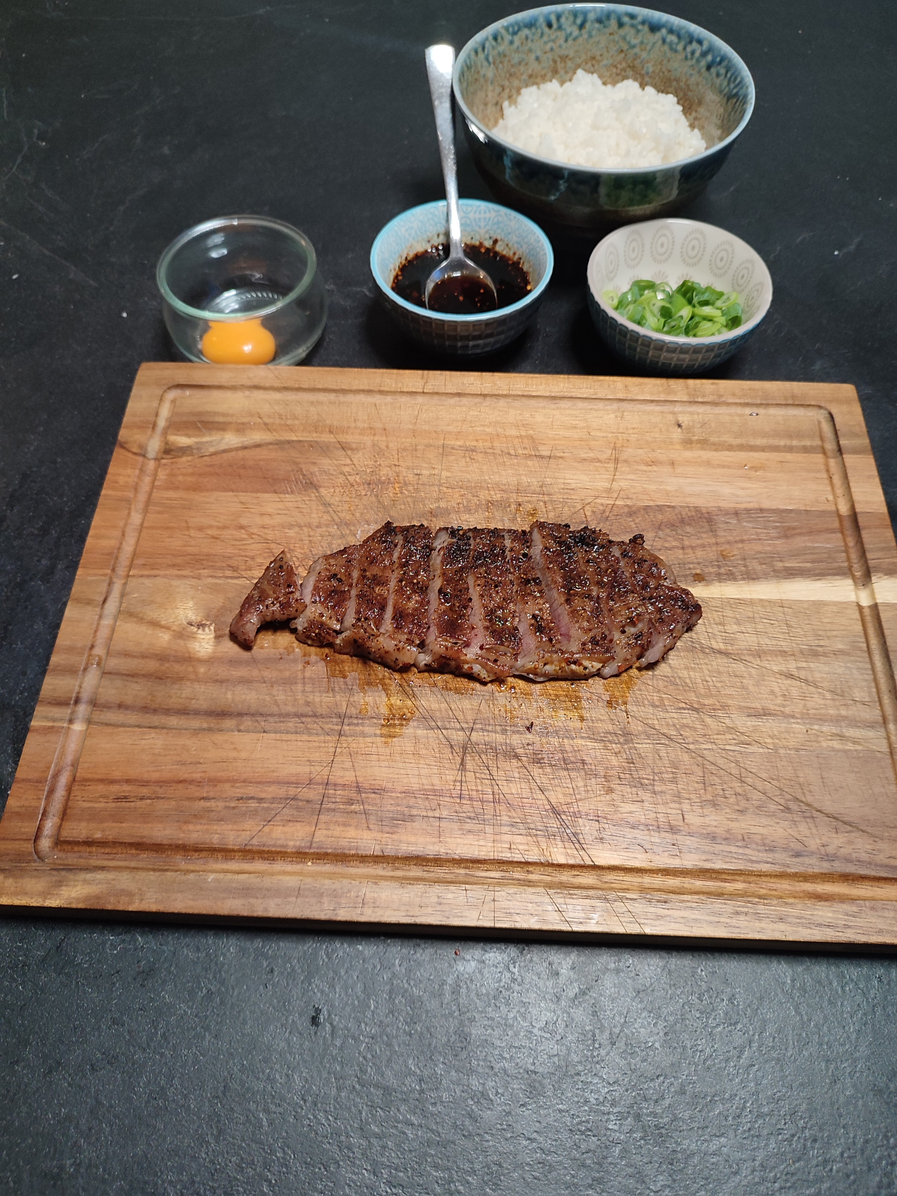 Donburi is eigenlijk een schaal rijst met een topping en saus. Een veel gegeten gerecht in Japan en een geweldig gerecht voor een wagyu steak. Meer heeft het echt niet nodig lekkere rijst mooi saus en om het af te maken een eidooier een heerlijke begeleiding voor een wagyu steak.