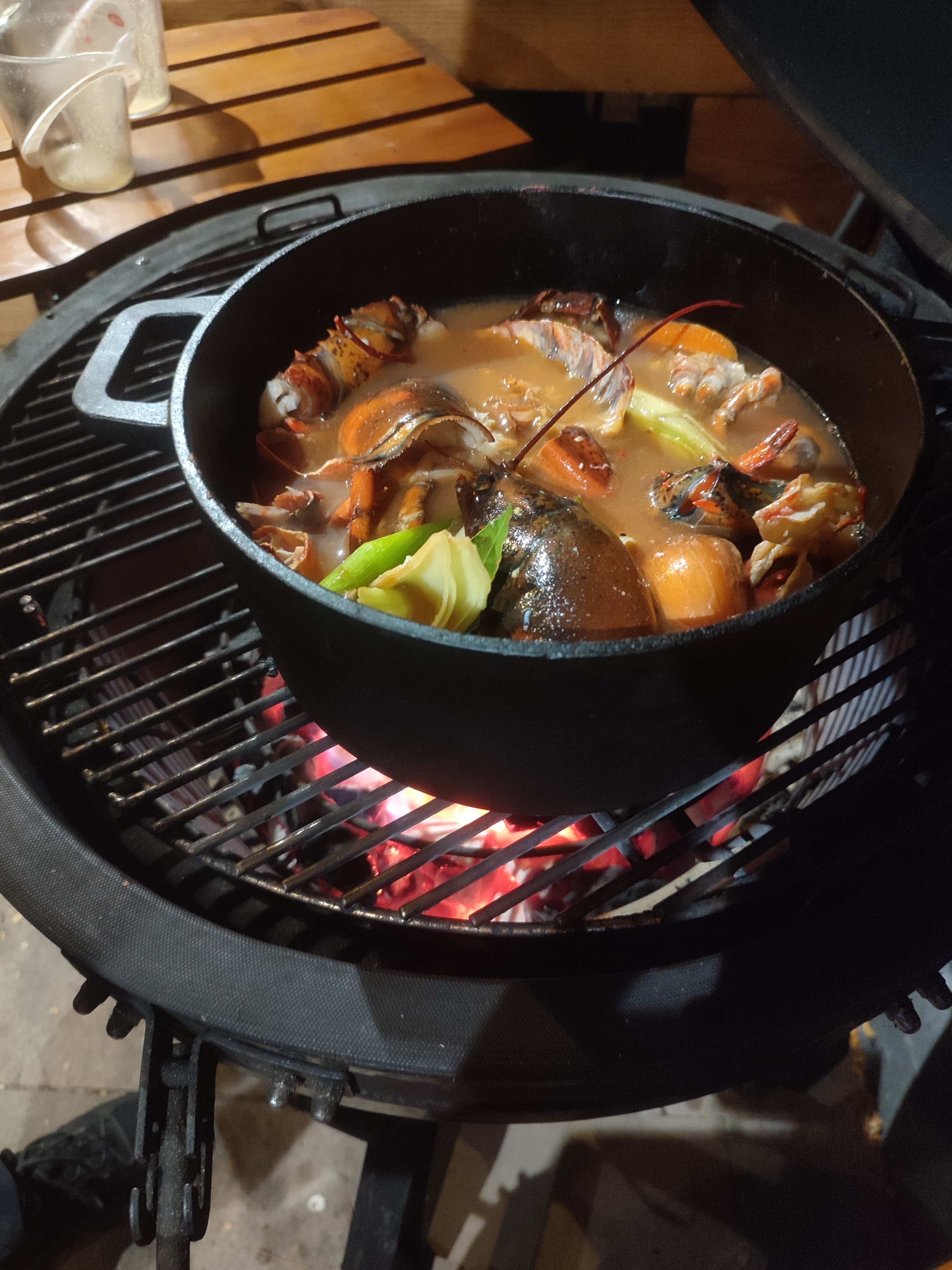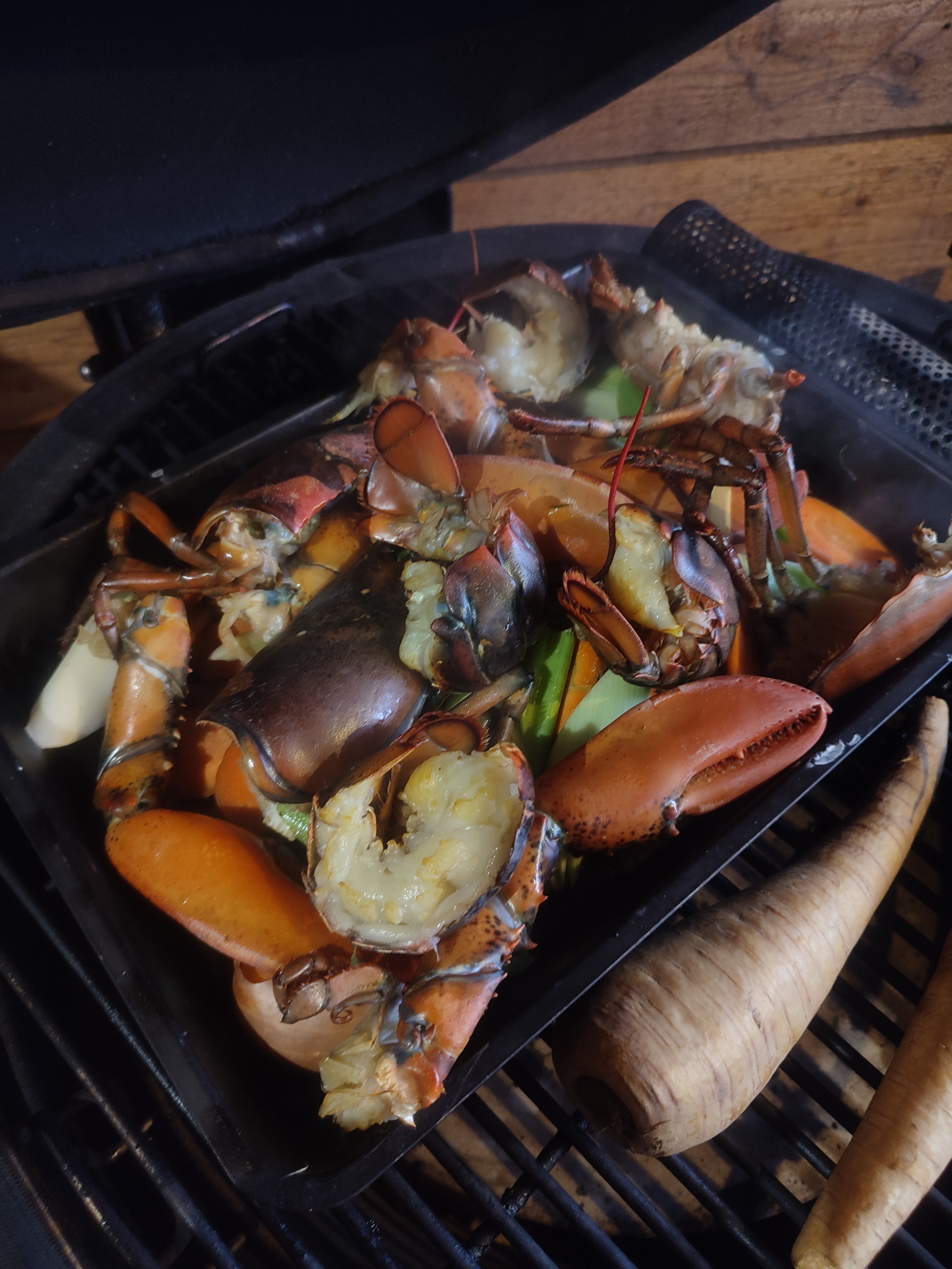 Snij de wortel, ui en selderie grof en plet de knoflook. Doe dit in de ovenschaal gebruik je verse kreeft hak dan de staart en kop door de midden en trek de scharen eraf. Gebruik je soepkreeft had deze dan in zijn geheel in grove stukken. Het vlees van de soepkreeft gaan we niet gebruiken die van de verse kreeft kun je wel gebruiken. Leg de kreeft bovenop de groenten in de oven schaal. Leg het rook hout op de kolen en de schaal op het rooster. Rook dit 1 uur gebruik je verse kreeft haal dan de staarten na 30 minuten al van de bbq. Als alles gerookt is haal het dan van de bbq en bouw de bbq om voor directe hitten en zet de dutch oven erop en breng hem naar 220 graden. Heb je verse kreeft gebruikt haal dan het vlees uit de kreeft zodat je alleen nog de schalen overhoudt. Als de skillet goed warm is bak dan de groenten, kreeftenschalen en de tomatenpuree aan. Als alles goed aangebakken is voeg dan 50 ml cognac toe pas op dit kan een vlam geven. Mocht dit niet uit zijn eigen gebeuren help het even met een klein vlammetje zodat je de cognac kunt flamberen en de alcohol eraf brandt. Als de vlam uit is voeg dan de witte wijn, visbouillon, laurier, tijm en de jalapeno bacon rub toe. Brengt dit aan de kook en brengt de bbq terug naar 160 graden. Laat dit nu rustig voor 1 uur zachtjes koken zonder deksel van de dutch oven met gesloten dome. Haal nu de pan van de bbq en ga er met de staafmixer doorheen dat het meeste van de groenten puree zijn. Giet nu alles door een zeef en zorg dat je alles vocht overal eruit duwt. En doe terug in de pan voeg nu 125 ml van de slagroom toe en breng op smaak met peper en zout. Heb je verse kreeft gebruikt kun je het kreeftenvlees in stukken snijden en de staarten eventueel heel laten. Meng nu het gehakte kreeftenvlees met de uitgelekte krabvlees en doe dit in de soep en houdt deze warm. Klop de slagroom tot deze lobbig is maar niet helemaal stijf en voeg daar de rest van de cognac aan toe. Snij de bieslook in ringen.