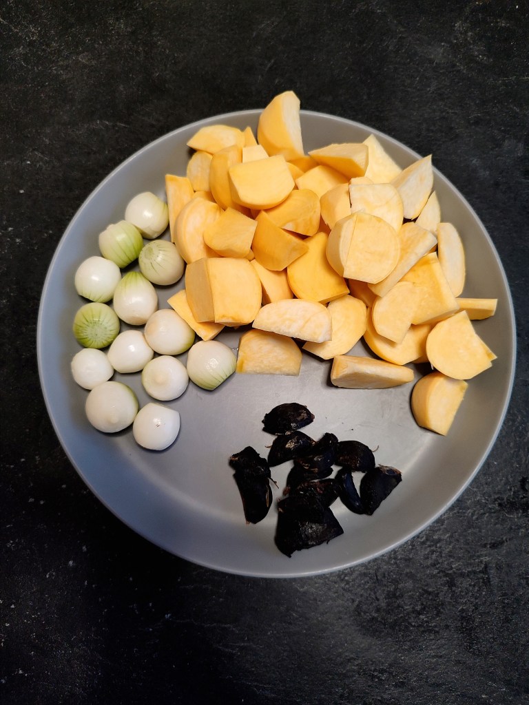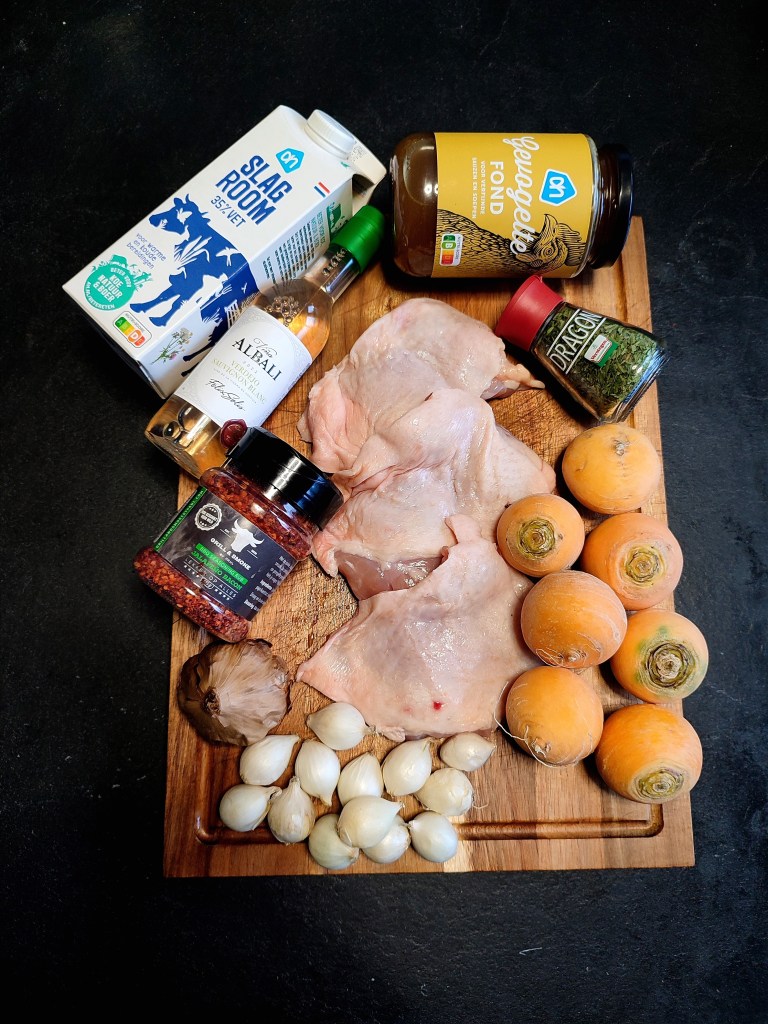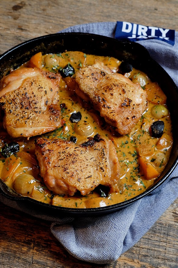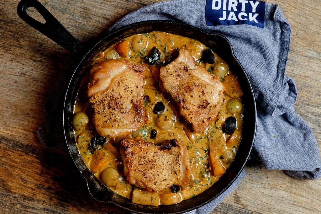Heerlijke stoof met kippendijen met krokant velletje. De combinatie van de romige saus met de zoete zwarte gefermenteerde knoflook, dragon en licht pittige jalapeno bacon rub past goed bij de gestoofde boterraap en zilveruitjes.