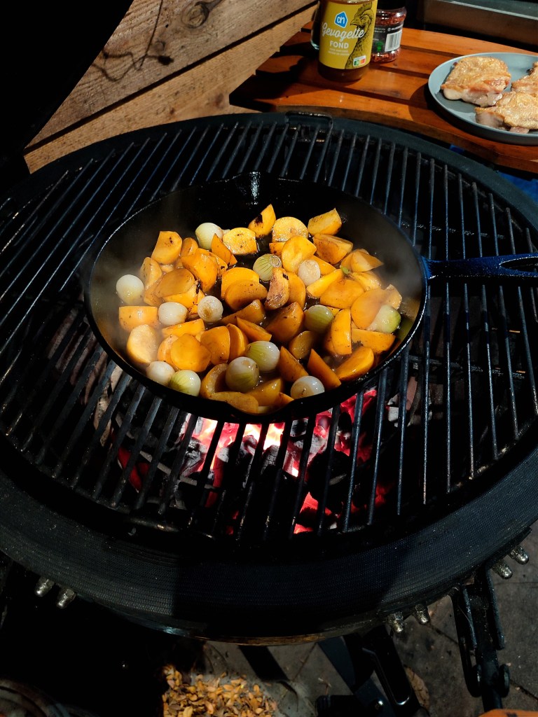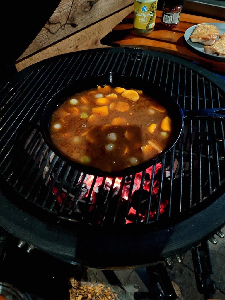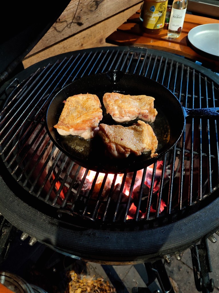 Begin met het aansteken van de bbq voor directe hitte en breng hem naar de 200 graden verwarm de skillet meteen mee op.
