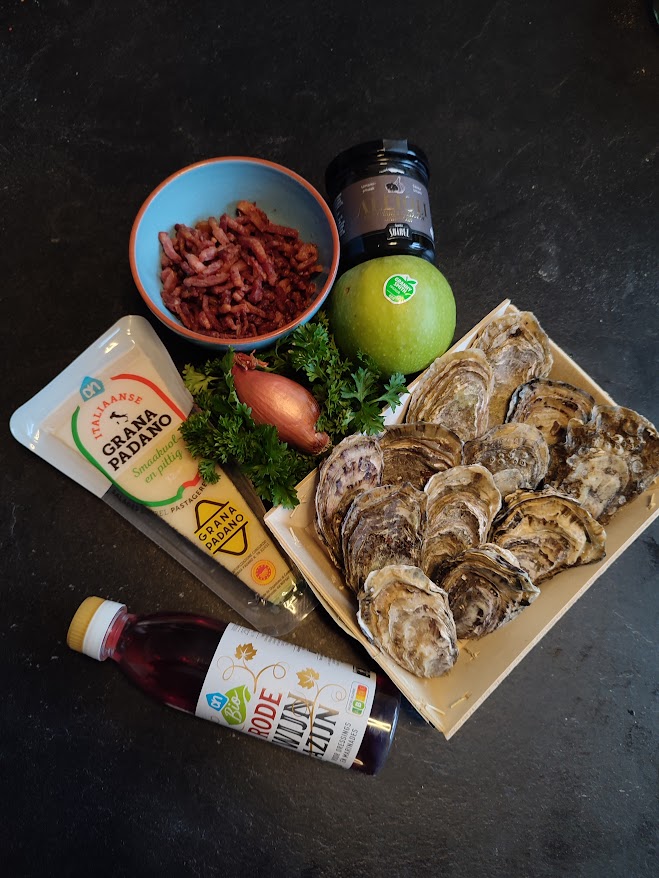 Snipper de sjalot en meng deze met de rodewijn azijn. Snij de granny smith eerst in dunne plakken en daarna in dunne reepjes. Hak de peterselie fijn. Vul een klein spuitflesje met de zwarte knoflook aioli. Maak nu de oester schoon en zet op iets wat vuur kan hebben. Je kunt ze goed stevig vast zetten door eerst wat grof zeezout hoopjes neer te leggen en daar de oesters op te zetten. Zorg dat je veilig dicht bij de plek kunt staan bij waar de flambadou aan het opwarmen bent. Zorg dat de oester op een stevige ondergrond staan. Haal nu de flambadou die roodgloeiend is uit het vuur en houdt hem zo snel mogelijk boven de oesters. Doe er meteen wat van de reuzel in de flambadou en beweeg deze over de oesters. Voeg daarna de rest van de reuzel aan de flambadou toe. Zodra de flambadou uitgebrand is zet hem dan veilig weg.