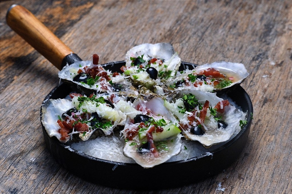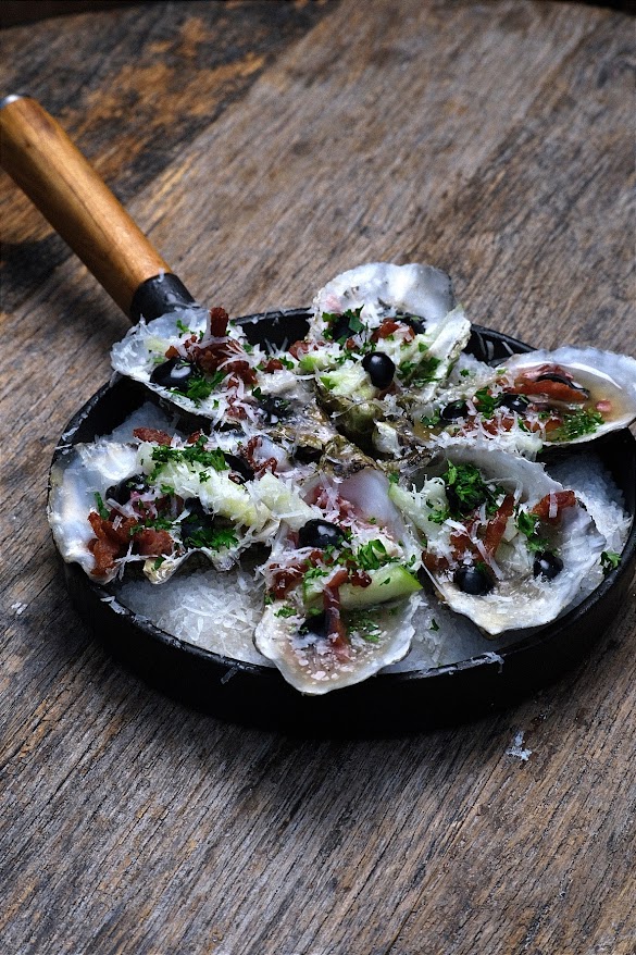 Als de flambadou klaar is garneer de oester dan snel af met de rodewijn azijn mengsel, appel, spekjes, parmezaanse kaas, zwarte knoflook aioli en peterselie. Serveer zo snel mogelijk eetsmakelijk