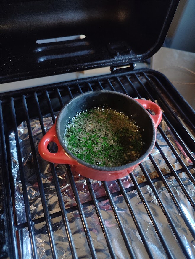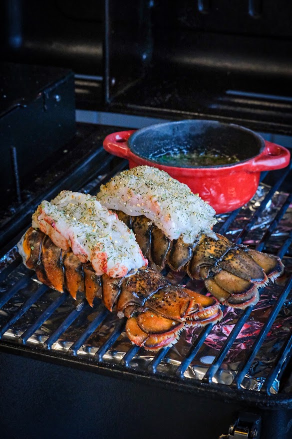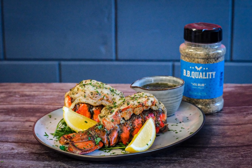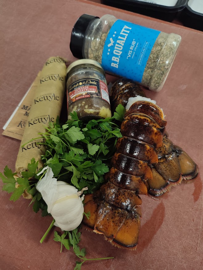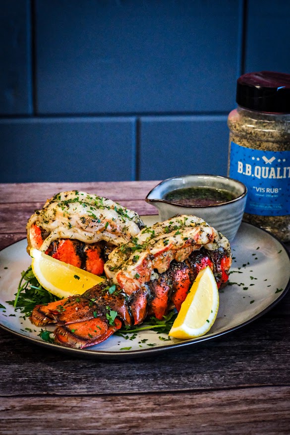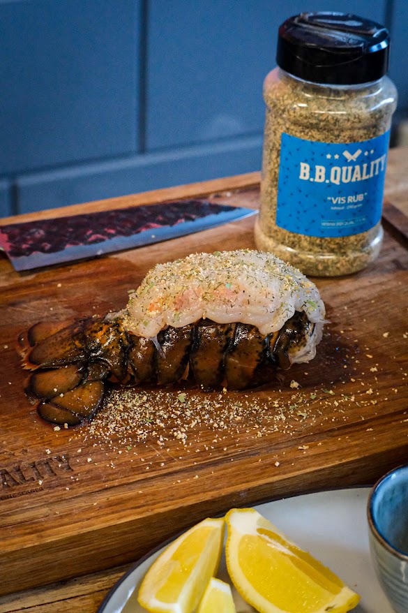 Begin met het hakken van de peterselie en de knoflook en zet vast een skillet op met de bone marrow melt om te laten smelten. Nu gaan de we kreeften staarten voor bereiden hiervoor beginnen we door met een schaar door het midden van de bovenkant van de schaal te knippen tot het einde van de staart. Als je dat gedaan hebt breek dan bij de laatste schildjes aan de staart einde aan beide kant van de snede kleine stukjes eraf. Laat de andere schildjes erop zitten. Nu gaan wel heel voorzichtig met de vingers het vlees los maken aan de binnenkant van de schaal. Probeer de schildjes niet te breken ga met je vingers helemaal rond het vlees. Als het los is van de schaal maar het achterste puntje nog vast zit gaan we de schildjes een beetje open drukken en het vlees omhoog halen. Als dat gebeurt is en nog op het einde vast zit kun je het nu bovenop de schaal leggen. Strooi dan de vis rub over het vlees van de kreeft. Meng nu door de gesmolten beenmerg de truffel, knoflook en peterselie houdt een beetje peterselie voor garnering achter. Breng dit op smaak met peper en zout. Leg de staarten nu op de bbq en bestrijk meteen met wat van de beenmerg mengsel. Gaar de kreeft nu tot een kern van ongeveer 52 graden en bestrijk tussendoor nog een paar keer met de beenmerg mengsel. Zodra het vlees de temperatuur behaald heeft breng dan op smaak met peper en zout en haal van de bbq.