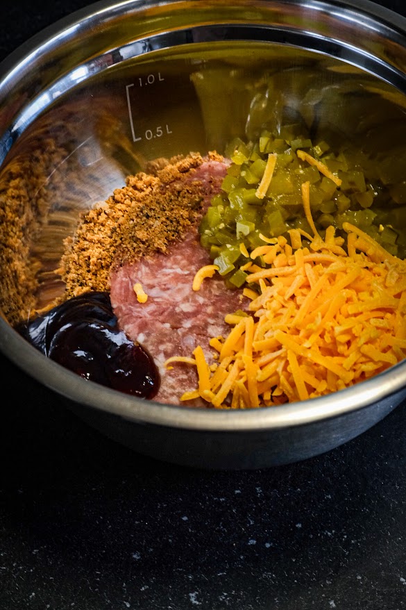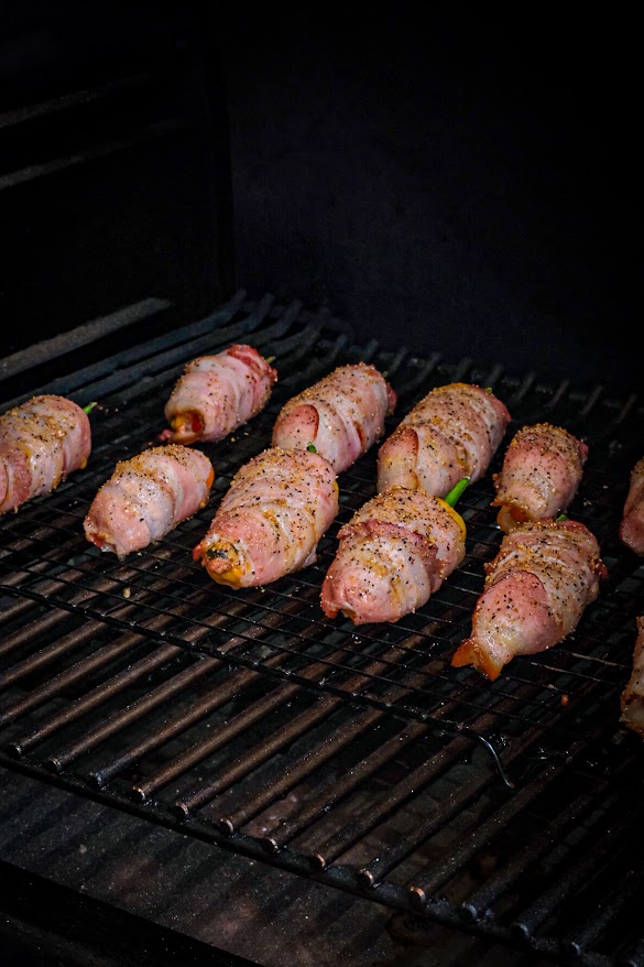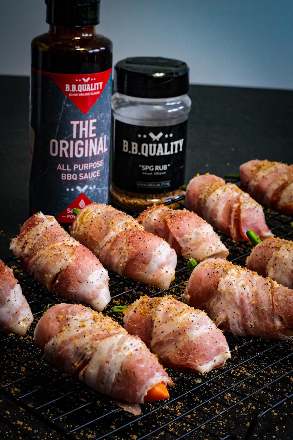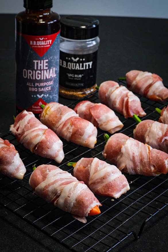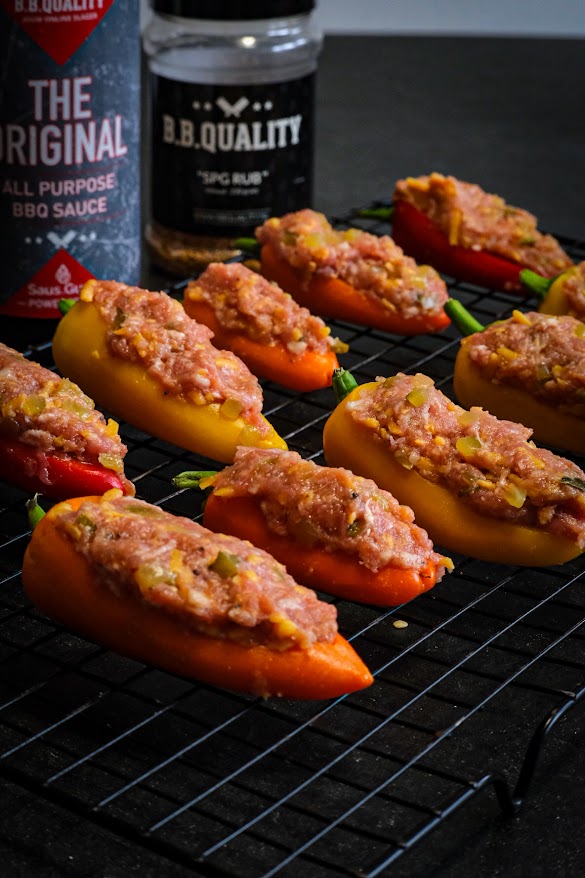 Snij de augurk zo fijn mogelijk in blokjes. Doe nu in de kom het gehakt, augurk, 50 gr. cheddar, 1 el. spg rub en 1 el. bbq saus en meng dit dan goed door elkaar. Snij in de lengte een klein stukje van de boven kant van de mini paprika’s af zodat je bootjes krijgt de afsnijdsels kun je voor een ander gerecht gebruiken. Haal ook de zaadjes uit de mini paprika. Verdeel nu het gehakt mengsel over de paprika’s en stop ze zo vol mogelijk. Rol elke popper nu in ontbijtspek en strooi de rest van de rub eroverheen. Zet ze nu op de bbq en gaar ze nu 20 minuten. Smeer ze na de 20 minuten in met bbq saus en verdeel de rest van de cheddar kaas eroverheen. Laat ze nu verder garen tot een kern van 68 graden ongeveer na 20 minuten. Haal ze nu van de bbq.