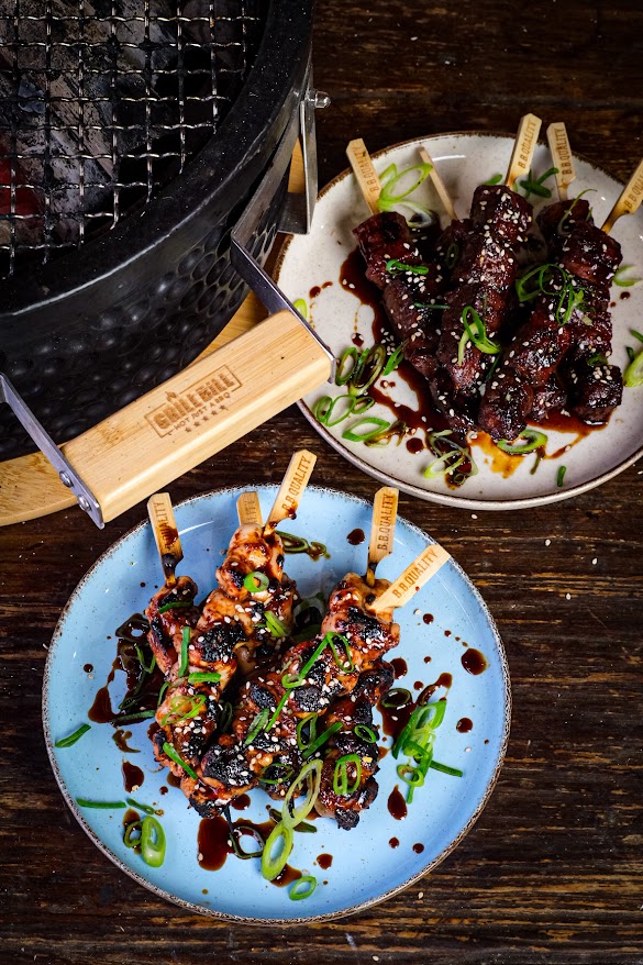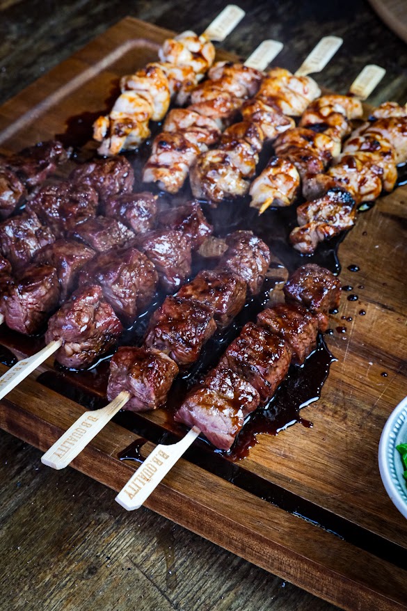 Hiervoor beginnen we met de spiesen minimaal 30 minuten te laten weken in water. Ondertussen kunnen we de flat iron en kippendij allemaal in gelijke kleine blokje snijden voor aan de spiesen. Als de spiesen geweekt zijn rijg dan het vlees aan de spiesen zodat je spiesen met flat iron hebt en spiesen met kippendij. Als de bbq op zijn heetst is mogen eerst de kippendij spiesen erop deze hebben het langste nodig. Grill ze eerst 5 minuten aan een kant en draai ze om. Leg nu de flat iron spiesen er nu ook op grill deze 3 minuten aan een kant en dan 3 minuten aan de andere kant. Nu zijn ze allebei de soorten ongeveer ver genoeg gaar om de yakitori saus eroverheen te smeren. Haal de spiesen van de bbq en smeer ze aan alle kanten goed in met de saus. Leg ze terug op de bbq en grill ze aan alle kanten snel zodat de saus mooi kan karamelliseren. En haal ze dan van de bbq.