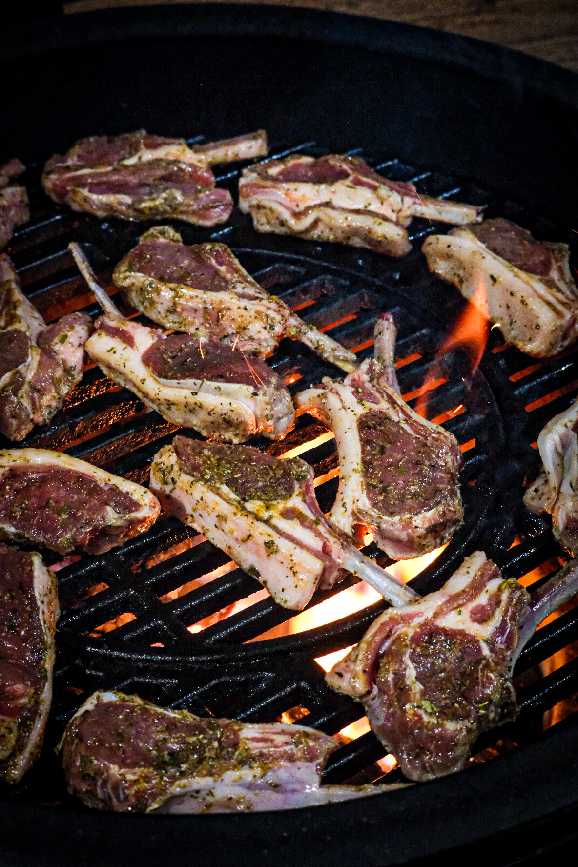 Snij de lamsrack na elk botje los zodat je koteletten overhoud. Doe dit in een kom en voeg de rub en wat olijfolie toe en meng door elkaar. laat dit minimaal 15 minuten intrekken langer mag ook. Grill nu de lam snel boven de kolen tot beide kanten mooi gekleurd zijn en ze een kern van 52 graden hebben bereikt. Haal ze dan van de bbq en laat ze minimaal 5 minuten rusten.
