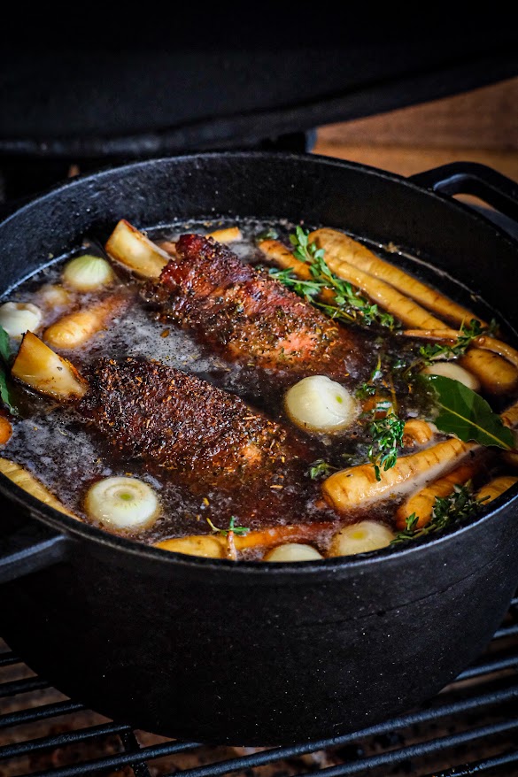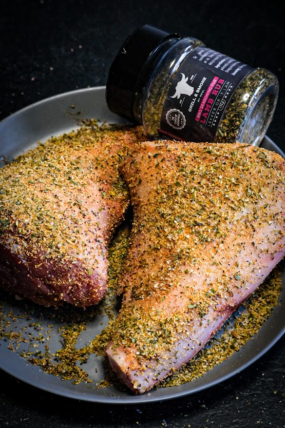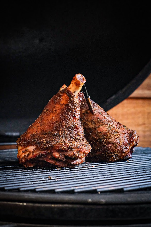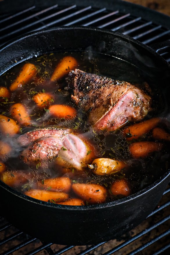 Doe de rub op de lamsschenkel en leg nu de rookhout op de kolen en de schenkels op het rooster. Gaar nu de schenkels rustig tot 72 graden kern. Maak nu de groente schoon en snij deze in grove stukken. Als de schenkels de 72 graden zijn zet dan een ducth oven op de bbq en doe hier nu alles in behalve de maizena. Laat dit geheel nu rustig stoven voor ongeveer 2 uur bekijk tussendoor hoe de schenkels zijn. Mochten de schenkels en de groenten klaar zijn haal ze dan van de bbq. Haal de groenten en schenkels even uit de dutch oven en breng de saus aan de kook en bindt deze na gewenste dikte af met maizena met water en breng op smaak met peper en zout.