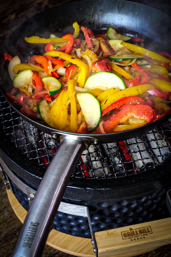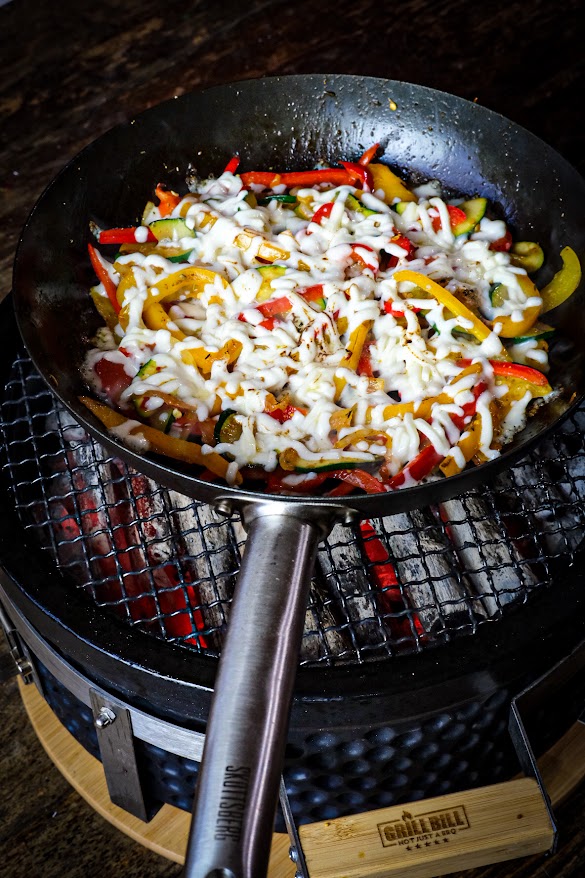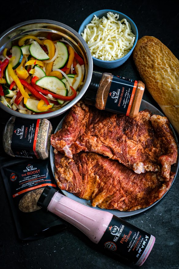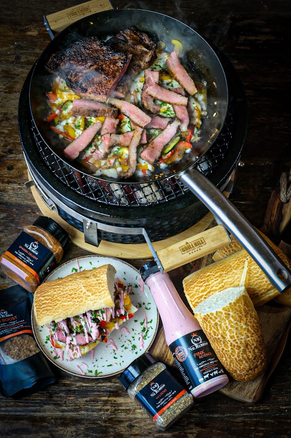 Haal als eerste de eventuele overtollig stukken vet weg dat zijn de plekken en randen waar veel vet zit daar mag wat vanaf. Smeer de secreto in met de spanish delight. Snij de paprika in repen de courgette in halve plakken en de ui in halve ringen. Bak als dat nog nodig is het stokbrood af en snij die daarna in vier delen. Zet een skillet op de bbq en laat deze goed warm worden. Grill eerste de secreto direct boven de kolen aan beide kanten mooi aan en tot een kern van 60 graden. Haal de secreto dan van de bbq en laat deze rusten. Ondertussen als de skillet warm is doe dan een beetje olie erin en bak alles groenten mooi aan tot ze een mooi kleurtje beginnen te krijgen. Voeg dan the looks toe en the boost naar smaak meng dit nog goed door elkaar. Strooi nu de fior di latte over de groenten en laat dit nog even mooi smelten en gratineren. Als dat gebeurt is haal dan de skillet van de bbq.
