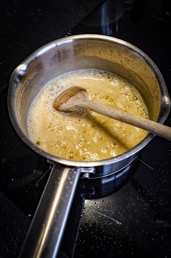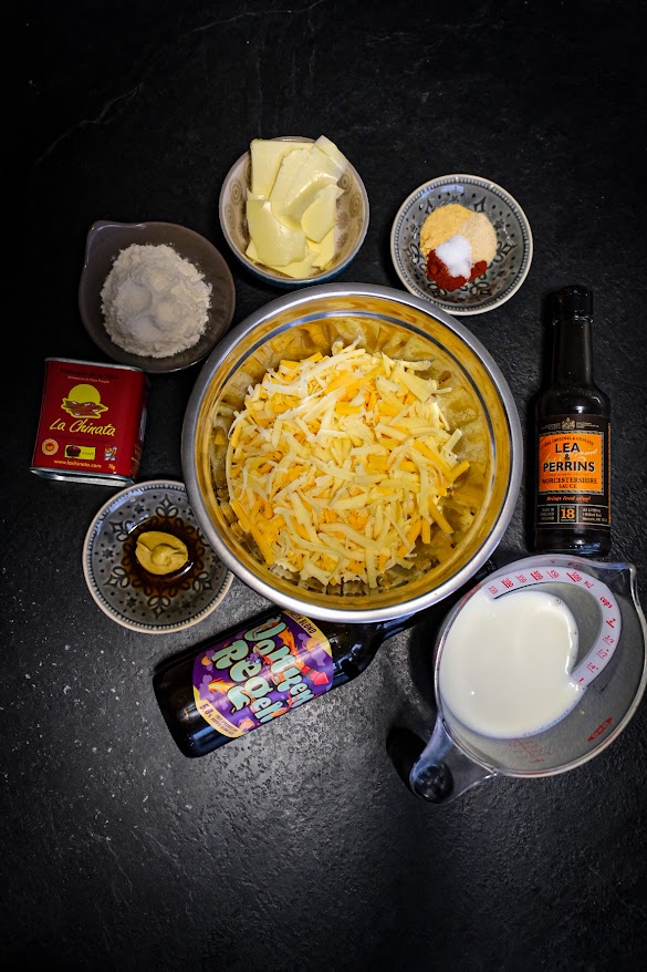 Smelt de boter op een laag vuur tot de boter niet meer bruist. Voeg dan de bloem toe en blijf dit met een houten lepel goed door roeren zodat het niet kan aanbranden. Als het naar licht geroosterde noten begint te ruiken dan is de bloem genoeg gegaard. Nu mag er een kwart van de bier en melk erbij en blijft tegelijkertijd goed roeren met de houten lepel. Als het dik is geworden en weer aan de kook is doe er dan nog een kwart van de vloeistof bij en begin nog eerst met de houten lepel te roeren en als die vloeistof bijna helemaal opgenomen is ga dan verder met de garde door te roeren zodat hij mooi glad wordt. Kookt het weer voeg dn weer en kwart toen en blijf roeren en doe het zelfde met het laatste kwart. Als alles goed gemengd is een mooi glad is zet dan het vuur op laag. Nu mogen de kruiden en de mosterd en worcestershiresaus erbij en roer dit er goed door. Nu mag er beetje bij beetje steeds wat kaas erbij roer dit er weer door met de houten lepel en voeg steeds wat toe als het eerste kaas gesmolten is.