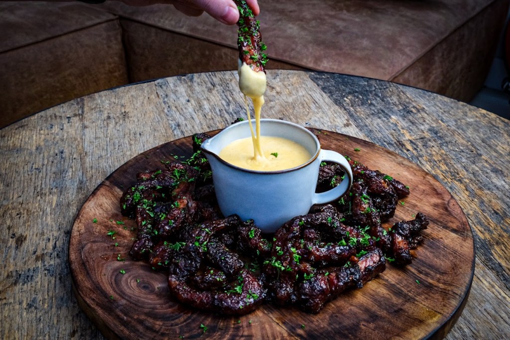 Lekkere snack om uit te delen of om zelf op te eten deze iberico ribfingers met bier kaas saus