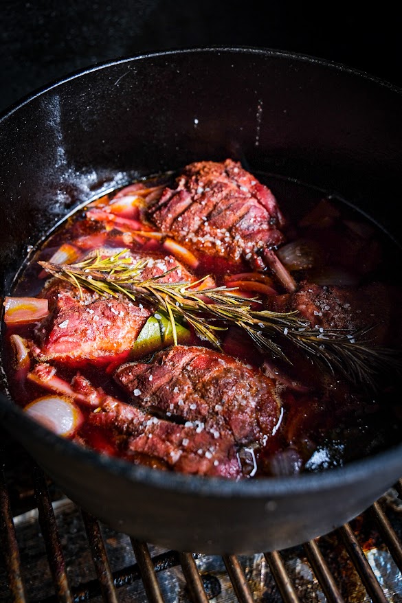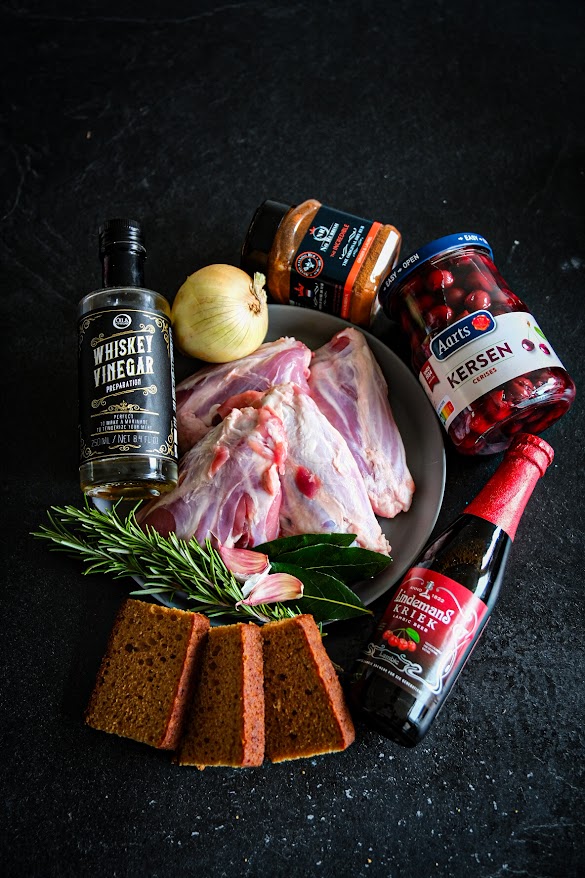 Oerhammetjes die eerst zijn gerookt en daarna lekker gestoofd in de kriekbier waar we een lekkere kersensaus mee maken.