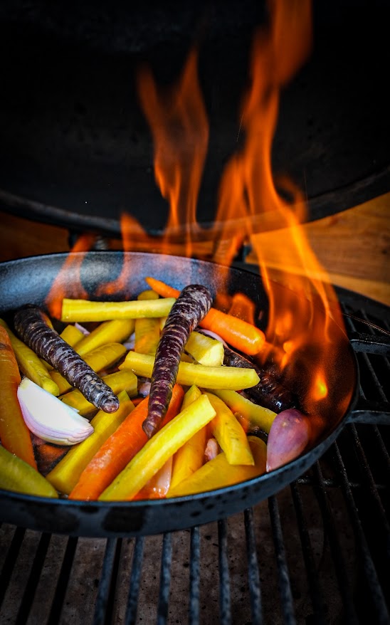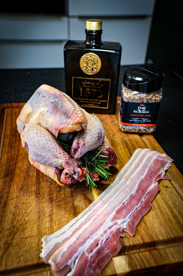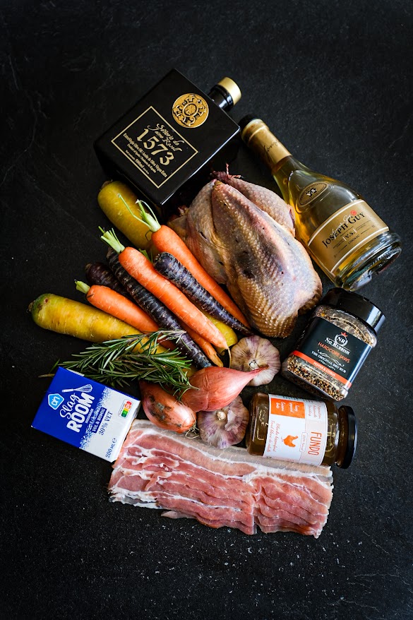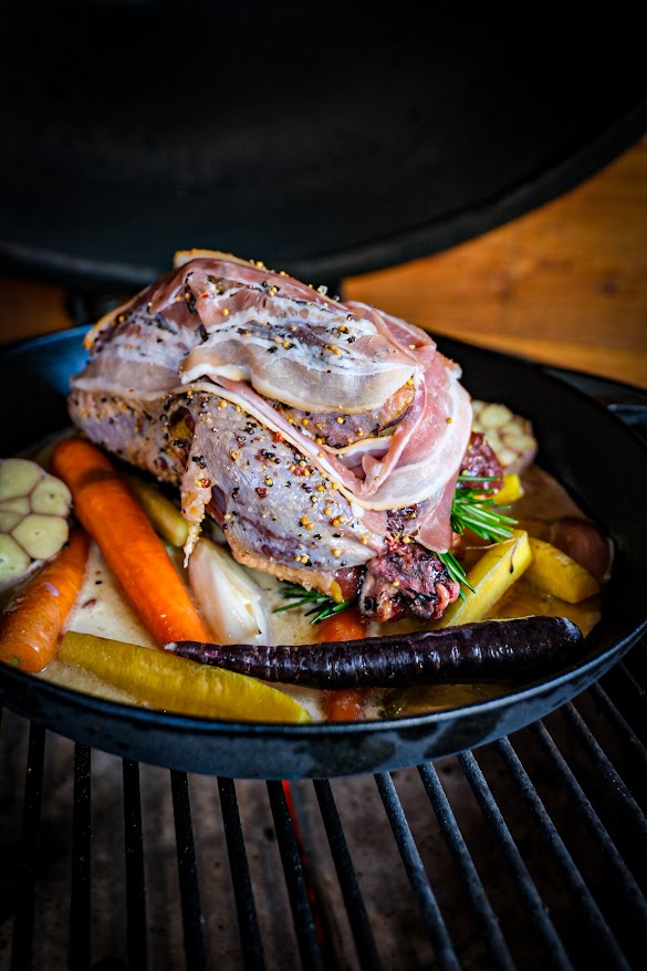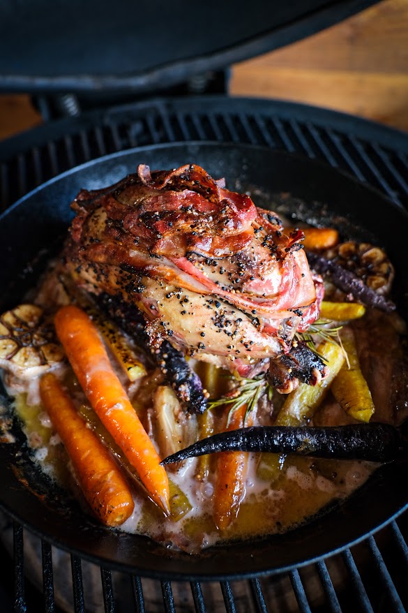 We beginnen met alle groenten voor te bereiden. Mocht je mooie kleine dunnere wortels hebben hoef je ze alleen te wassen. Mochten er wat grote dikkere bij zitten of allemaal zijn dan zou je ze in kwarten kunnen snijden. Maak de sjalotten schoon en snij deze in kwarten. Voor de knoflook snij deze door midden zodat je een boven en onderkant krijgt. Nu gaan we de fazant voor bereiden deze gaan we vullen met een halve sjalot, een halve bol knoflook, 4 takjes rozemarijn en zout. Bindt nu de pootjes bij elkaar zodat de dijen dicht tegen elkaar zitten. Smeer de fazant in met olijfolie als binder en strooi de rub over de fazant. Pak nu met de helft van de spek de borst van de fazant in. Laat de skillet mee opwarmen met de bbq en doe hier een beetje olie in als deze goed warm is. Snij de rest van de spek in grove repen en bak deze samen met de sjalot in de skillet even kort aan. Voeg nu de wortels toe en roer deze ook even door. Nu mag de cognac erbij pas op deze kan flam pakken mocht dit niet van zelf gaan steek deze dan nog aan zodat de alcohol er goed vanaf kan branden. Als deze uitgebrand is voeg dan de rest van de rozemarijn toe en giet de kippenfond, azijn en room erbij. Leg nu de knoflook er ook bij met de gesneden kant naar boven en doe hier een beetje olie op en wat zout zodat deze ook een beetje kunnen poffen. Zet nu in de midden boven op de wortel de fazant. Gaar nu de fazant tot deze een kern van 55 graden heeft gehaald bij de borst. Haal dan deze van de bbq. Haal de fazant, wortel, sjalot en knoflook uit de saus en zet apart. Verwijder de rozemarijn en gooi deze weg. Breng nu de saus met de spek weer aan de kook en knijp 1 van de halve bollen knoflook in de saus. Laat een beetje indikken en roer er een de koude boter direct uit de koelkast in kleine blokjes toe en roer dit door de saus deze zal nu mooi indikken en gaan glazen. Haal bij de juiste dikte van de bbq en breng op smaak met peper en zout.