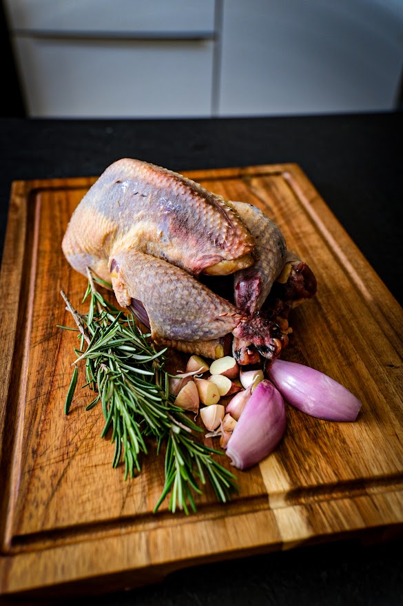 Doe nu doe nu weer alle groenten terug in de saus en roer even door. Leg de fazant terug op de groenten knijp de laatste knoflook uit over de groenten aan tafel en laat deze grof. Eetsmakelijk.