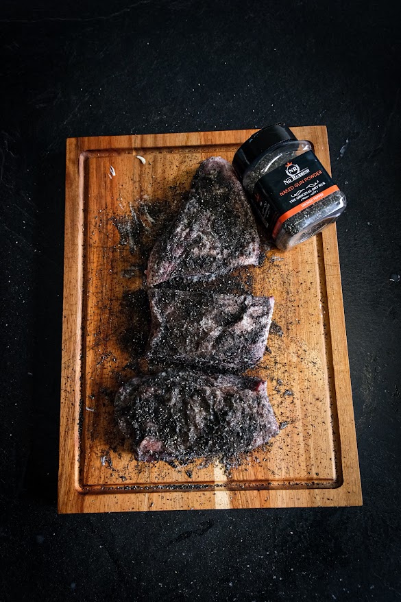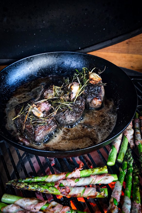 Als eerste beginnen we met de asperges snij hier als eerste het hardste onderste gedeelte af. Smeer ze nu in met olijfolie en doe er The hulk rub overheen en rol ze in met de ontbijtspek. Snij nu de maminha in mooie steaks en snij deze met de draad mee zodat we na het bakken ze tegen de draad in kunnen aansnijden. Smeer de steaks nu in met de mayonaise rondom en strooi er de naked gun powder er overheen. Doe nu de olie in de pan en smelt er ook de boter in. Plet ondertussen de teentjes knoflook. Als de boter gesmolten is leg er dan de knoflook en rozemarijn in de skillet zodat de smaak in de olie boter mengsel kan trekken. Leg nu de steaks met de vet kant naar beneden in de skillet en bak deze nu mooi aan tot een mooie korst. Leg ondertussen ook de asperges op het rooster bij de kolen en draai deze regelmatig om tot ze mooi gaar zijn. Als de steaks aan de vet kant een mooie korst hebben draai ze dan om en doe dit zo met elke kant van de steak tot overal een mooie korst hebben. En schep ook regelmatig met een lepel de boter olie mengsel over de steaks voor extra smaak. En als aan alle kanten een mooie korst zit en de kerntemperatuur van 49 graden niet gehaald is blijft dan regelmatig draaien en bakken tot de kern behaald is. Als alles de juiste gaarheid heeft haal dan alles van de bbq en laat het vlees 5 tot 10 minuten rusten.
