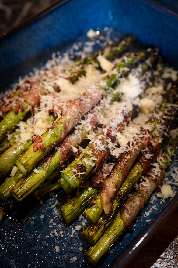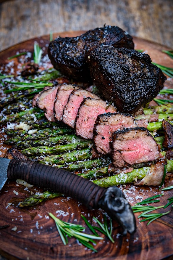 Na het rusten kun je de steaks tegen het draad in plakken snijden en pecorino romana over de asperge raspen. Eetsmakelijk.