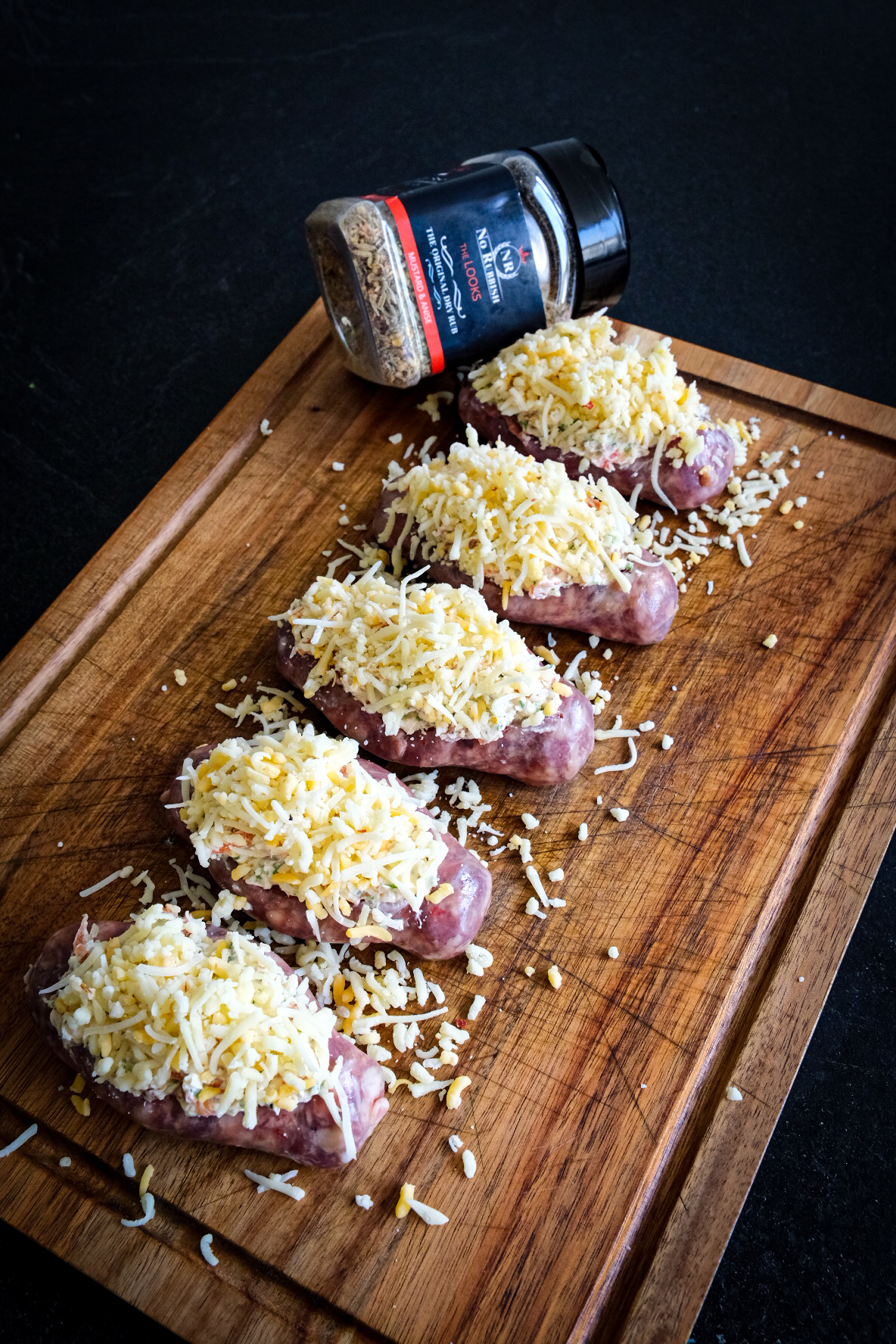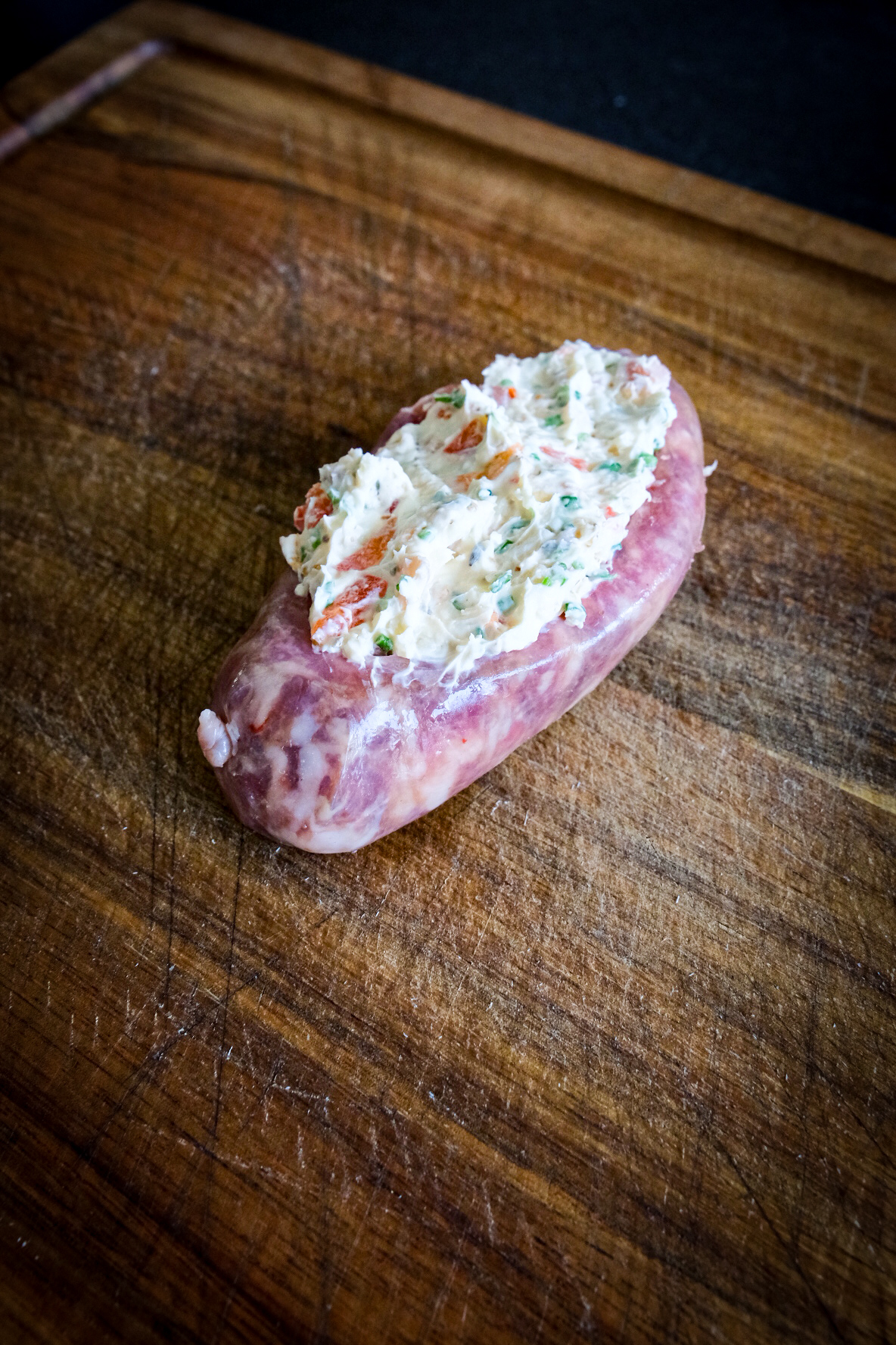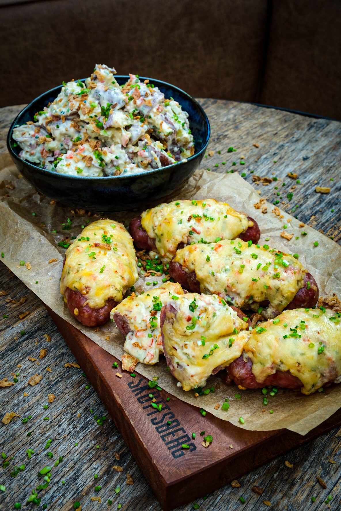 We beginnen met de vulling te maken hiervoor hak je de knoflook en snij je de bieslook in fijne ringen. Snij ook de paprika of jalapeno fijn. Meng nu de roomkaas, 15 gr. cheddar, knoflook, spekjes, rub en de bieslook houdt een beetje bieslook voor garnering achter. Nu kun je een snee in de lengte van de worsten maken maar niet helemaal door en duw met je vinger de worsten wat uit elkaar zodat ze een kommetje in de vorm van een boot worden. Verdeel hier nu het mengsel die je gemaakt hebt in en strooi de rest van de cheddar er overheen. nu mogen ze samen met het rook hout op de bbq en gaar ze nu voor 30 tot 45 minuten tot een kern van 70 graden. Haal ze dan van de bbq