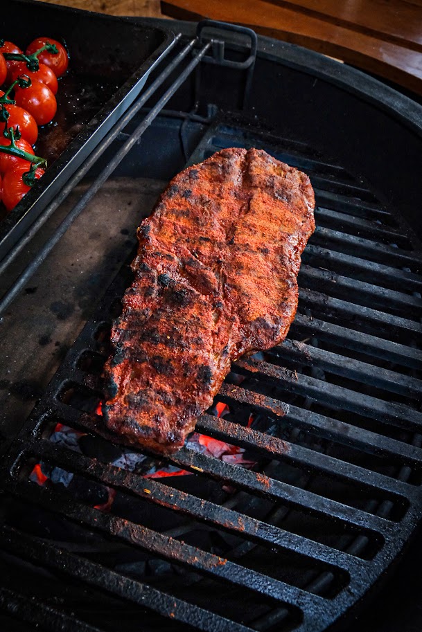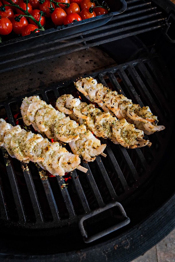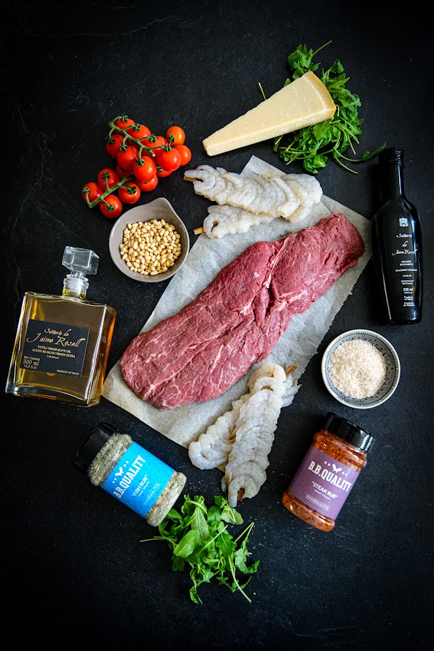 Haal de flat iron minimaal 1 uur van te voren uit de koelkast zodat deze op temperatuur kan komen. Voorzie de garnalen van de fish rub en de flat iron van de steak rub en zet aan de kant. Doe een beetje olijfolie en zout over de tomaatjes en leg deze op de indirecte zijden en laat deze voor ongeveer 10 tot 15 minuten lekker roosteren. Laat ondertussen een skillet op de directe zijde opwarmen zodra deze warm is rooster dan voorzichtig de pijnboompitjes zonder olie en haal ze dan uit de pan. Grill hierna de flat iron aan beiden kanten mooi aan op de directe zijde tot een kern van 50 graden en haal hem dan van de bbq en laat deze rusten. Grill nu de garnalen voor een paar minuten die hebben niet lang nodig zodra ze een kleur aan de buitenkant hebben zijn ze al goed en haal ze dan ook van de bbq. Zodra de tomaatjes mooi geroosterd zijn haal deze er dan ook vanaf.