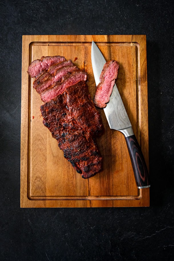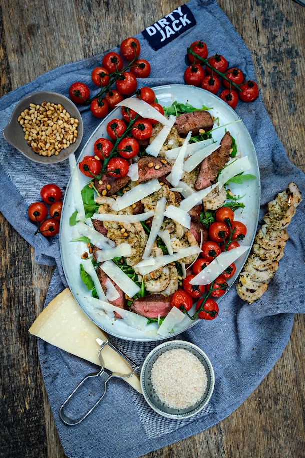 Pak hiervoor nu een grote schaal of plank en leg hier een mooie laag rucola op giet hier een beetje olijfolie overheen. Snij nu de flat iron aan in plakken en verdeel deze over de rucola en leg hier speels de garnalen en tomaatjes overheen. Giet nu overal een beetje balsamico azijn overheen en strooi de pijnboompitjes ook er overheen. Nu raspen of schaven we de pecorino eroverheen en brengen we het op smaak met het gerookt zeezout. Eetsmakelijk.