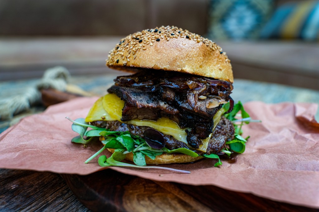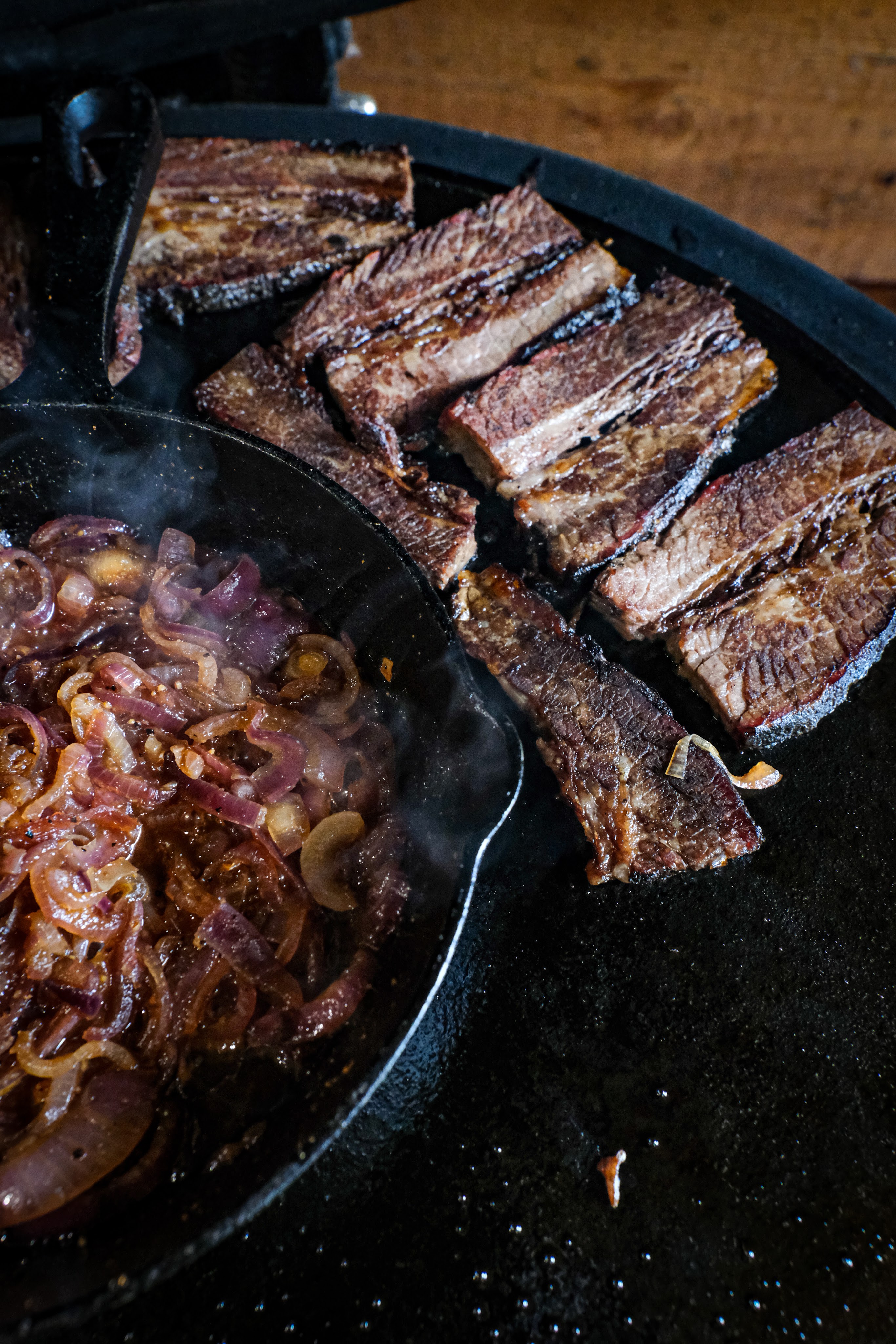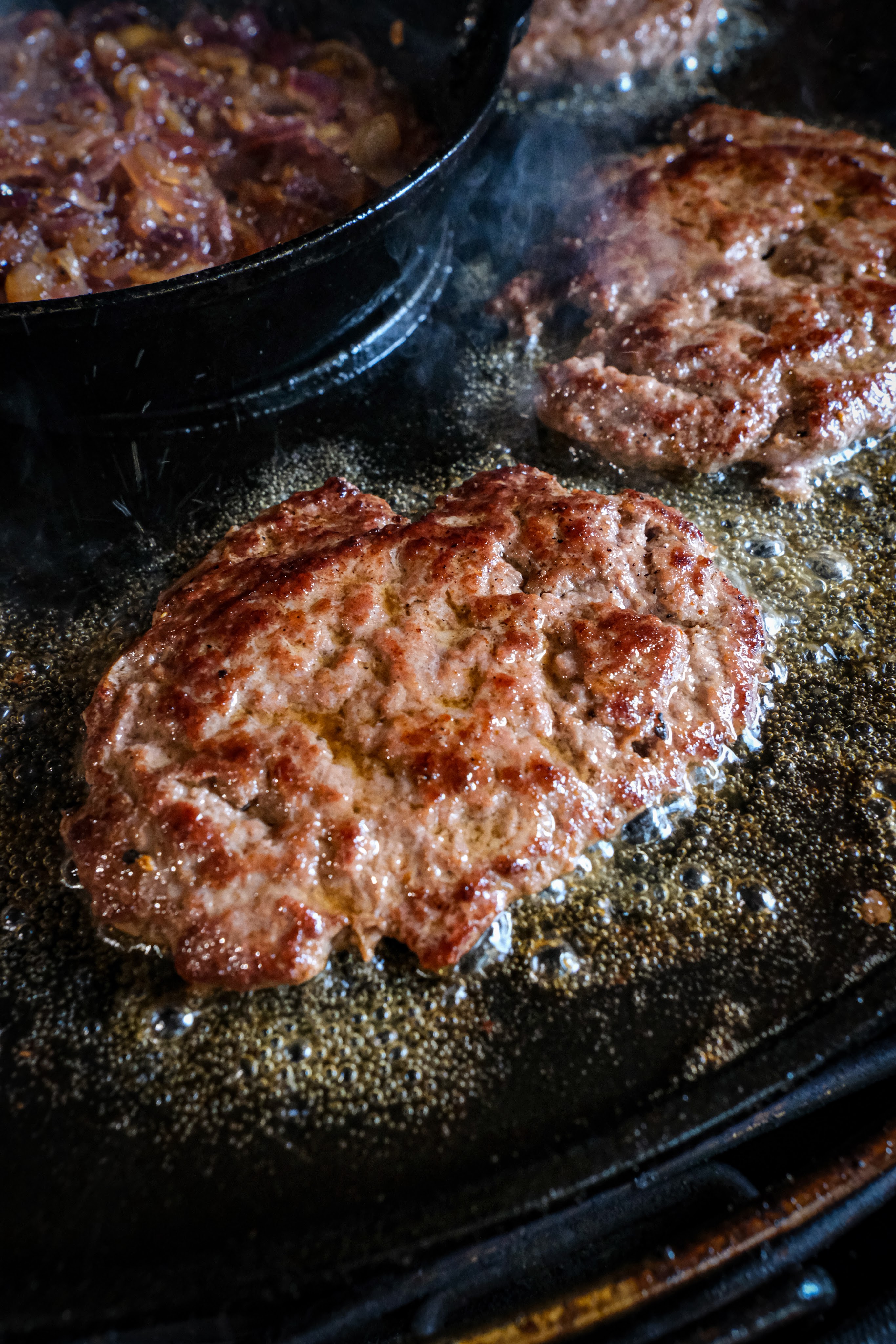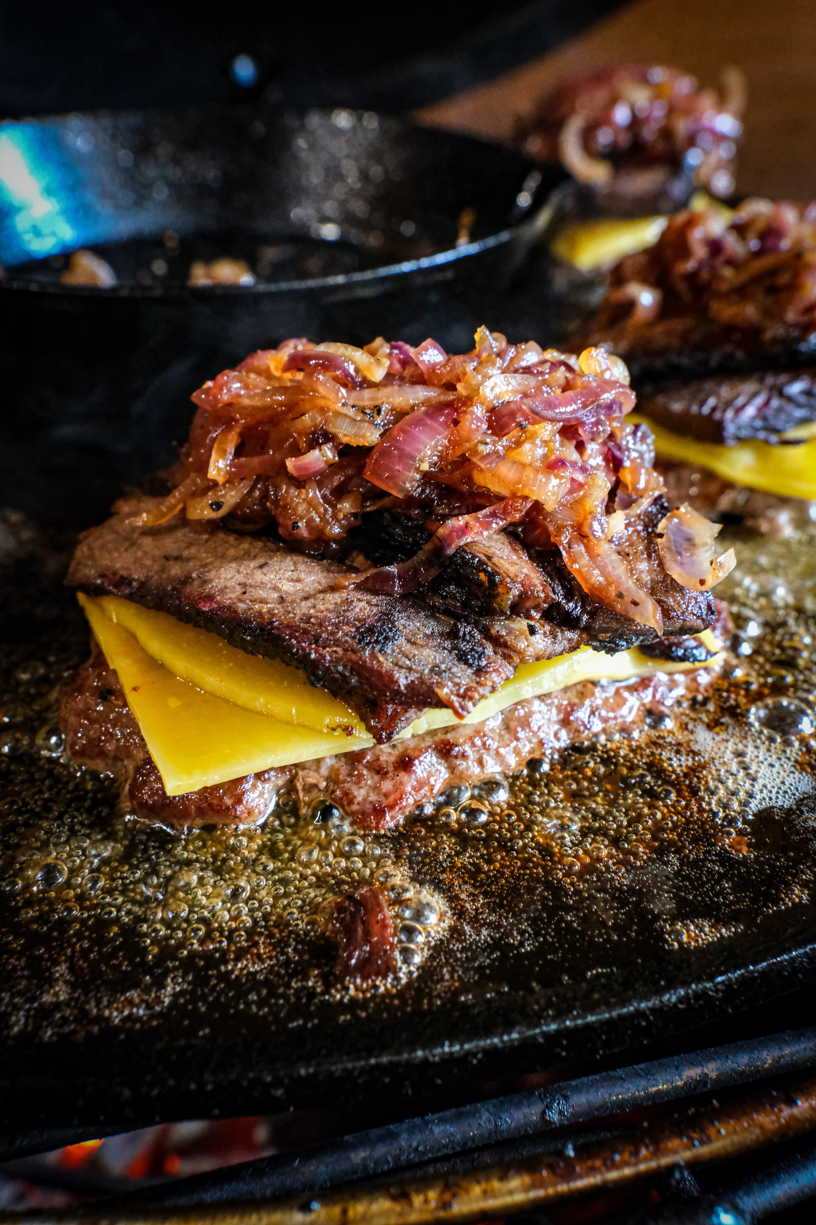 snij de uien in ringen en bak deze langzaam in een skillet tot ze mooi zacht zijn samen met de spg rub voeg op het eind een flinke scheut van de soja saus er aan toe en laat die nog even kort zachtje koken. Snij de broodjes open en smeer deze met boter in en toast deze even kort. Bak nu de plakken brisket aan tot ze aan beide kanten een mooie kleur hebben. En begin ondertussen ook aan de burgers leg deze in de skillet of op de plaat en druk ze zo plat mogelijk. Zodra de eerste kant mooi gekleurd is draai ze dan om en leg op elke burger een plak kaas en wat van de brisket en laat de kaas nog smelten en de onderkant mooi kleuren. Zodra dat gebeurt is verdeel dan de uien over de burgers.