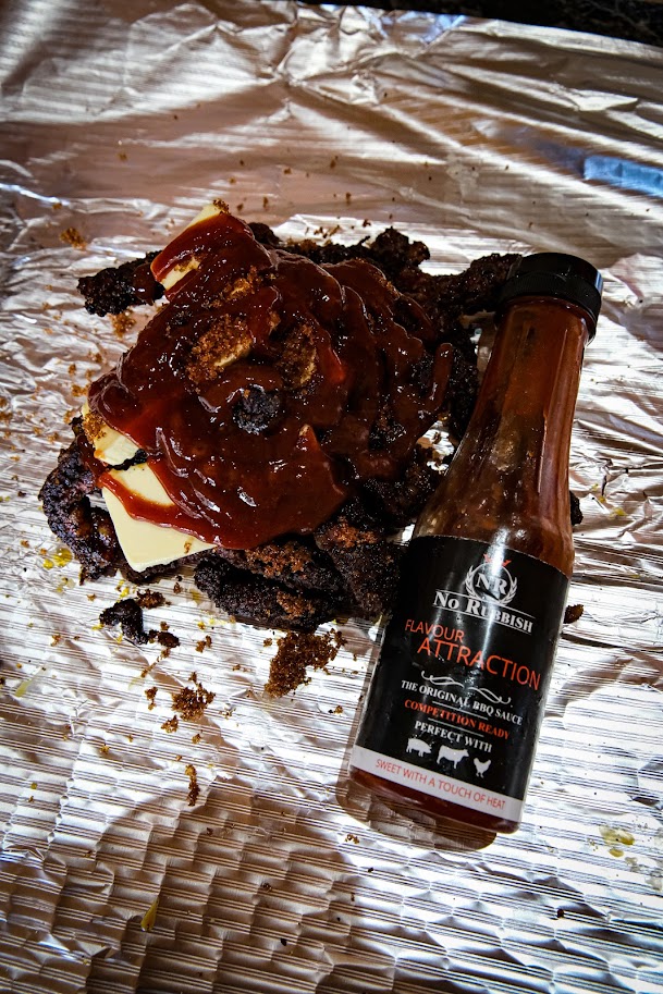 Kijk de ribfingers goed na mocht er nog een dikke vlies opzitten haal deze er dan vanaf en snij de dikke repen door de midden zodat ze sneller klaar zijn. Doe nu de rub bij de ribfingers en meng dit goed door. Leg nu de rookhout op de kolen en de ribfinger op het rooster. Rook de fingers nu eerst 2 uur zo met het rookhout na die twee uur pak de ribfingers in de aluminiumfolie samen met de boter, suiken en een flinke scheut bbq saus. Leg het pakketje nu terug op de bbq en gaar minimaal 1 uur verder kijk dan of de ribfingers mooi zacht zijn maar niet uit elkaar vallen. Mocht dat niet zo zijn gaar ze dan verder.