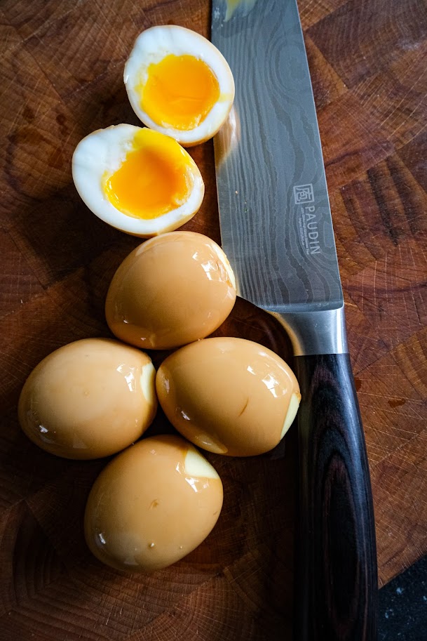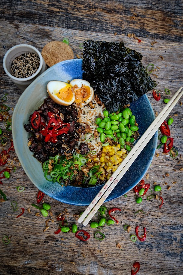 Haal de eieren uit de marinade en snij die door de midden doe eventueel nog wat zout op de zachte dooiers. Snij de rib finger in kleinere stukken zodat ze hapklaar zijn. Nu gaan we de ramen opbouwen leg eerst de noedels in de kommen en verdeel de bouillon eroverheen. Nu kun je al de toppings over de ramen verdelen en ook de ribfingers en de doorgesneden eieren. Eetsmakelijk.