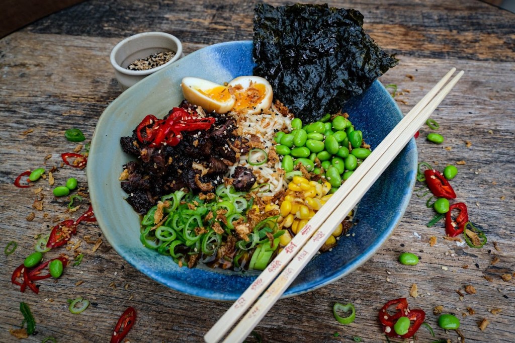 - Toppings naar keuze zoals bosui, mais, nori, krokante uitjes, sesam zaadjes, rode peper, edama bonen