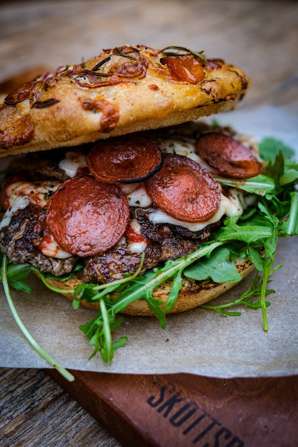 Deze burger is een mooie combinatie van meerdere gerechten. Smashburger met de toppings van een pizza op lekker focaccia broodjes.
